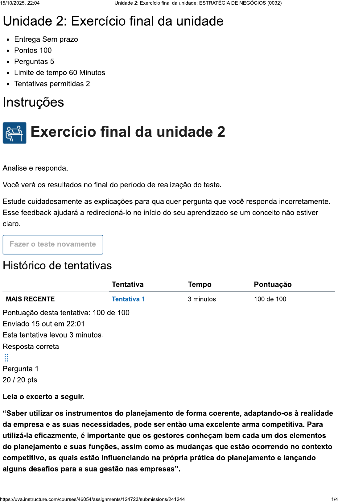 15/10/2025, 22:04 Unidade 2: Exercício final da unidade: ESTRATÉGIA DE NEGÓCIOS (0032) Unidade 2: Exercício final da unidade Entrega Sem prazo Pontos 100 Perguntas 5 Limite de tempo 60 Minutos Tentativas permitidas 2 Instruções Exercício final da unidade 2 Analise e responda. Você verá os resultados no final do período de realização do teste. Estude cuidadosamente as explicações para qualquer pergunta que você responda incorretamente. Esse feedback ajudará a redirecioná-lo no início do seu aprendizado se um conceito não estiver claro. Fazer teste novamente Histórico de tentativas Tentativa Tempo Pontuação MAIS RECENTE Tentativa 1 3 minutos 100 de 100 Pontuação desta tentativa: 100 de 100 Enviado 15 out em 22:01 Esta tentativa levou 3 minutos. Resposta correta Pergunta 1 20 / 20 pts Leia excerto a seguir. "Saber utilizar os instrumentos do planejamento de forma coerente, adaptando-os à realidade da empresa e as suas necessidades, pode ser então uma excelente arma competitiva. Para utilizá-la eficazmente, é importante que os gestores conheçam bem cada um dos elementos do planejamento e suas funções, assim como as mudanças que estão ocorrendo no contexto competitivo, as quais estão influenciando na própria prática do planejamento e lançando alguns desafios para a sua gestão nas empresas". https://uva.instructure.com/courses/46054/assignments/124723/submissions/241244 1/415/10/2025, 22:04 Unidade 2: Exercício final da unidade: ESTRATÉGIA DE NEGÓCIOS (0032) ANDION, C.; FAVA, R. Planejamento estratégico. Coleção Gestão Empresarial, [s. V. 2, n. 3, p. 27-38, 2002. 28. Disponível em: https://saude.riopreto.sp.gov.br/wiki/images/9/9e/Planejamento.pdf Acesso em: 18 2022. Diante disso, podemos dizer que a estratégia: Independe de feedback. Quando sem informação, é eficaz. Normalmente, é planejada para curtíssimo prazo. Reflete a lógica por trás de certas ações. Contrapõe a lógica por trás das ações. A alternativa é correta, pois, fugindo um pouco das ações, a diversificação é muito importante dentro da análise da situação. Tal análise pode propiciar maior segurança a organizações que estejam definindo sua missão pela primeira vez. Resposta correta Pergunta 2 20 / 20 pts De acordo com Andion e Fava (2002, p. 28, grifo nosso), diagnóstico estratégico traz informações que irão nortear seu direcionamento estratégico. diagnóstico estratégico pode ser comparado a um radar digital ligado 24 horas por dia, sempre pronto a captar e manter atualizado conhecimento da empresa em relação ao ambiente e a si própria, visando identificar e monitorar permanentemente as variáveis competitivas que afetam a sua performance. Com base no diagnóstico estratégico que a empresa irá se antecipar às mudanças e preparar-se para agir em seus ambientes internos e externos". ANDION, C.; FAVA, R. Planejamento estratégico. Coleção Gestão Empresarial, [s. V. 2, n. 3, p. 27-38, 2002. Disponível em: https://saude.riopreto.sp.gov.br/wiki/images/9/9e/Planejamento.pdf Acesso em: 18 mar. 2022. Nesse contexto, assinale a alternativa a seguir que apresenta os fatores associados ao ambiente interno da organização. Declaração de missão da empresa, cultura organizacional e estilo de liderança. Condições políticas e sociais, visão, cultura organizacional e estilo de liderança. Fatores que ocorrem fora da empresa e que causam mudanças dentro das organizações. Fatores que ocorrem fora de uma organização, podendo ter influência significativa nas operações atuais. Declaração de missão da empresa, clientes, concorrência, economia, tecnologia, condições políticas e sociais e recursos. A alternativa é correta, pois a missão de uma organização representa a razão de sua existência, com o propósito básico da organização (foco no cliente externo) e os valores que a organização pretende agregar a elementos que com ela interagem os valores, a cultura e os estilos de liderança. https://uva.instructure.com/courses/46054/assignments/124723/submissions/241244 2/415/10/2025, 22:04 Unidade 2: Exercício final da unidade: ESTRATÉGIA DE NEGÓCIOS (0032) Resposta correta Pergunta 3 20 / 20 pts propósito, a missão, a visão e os valores são determinados pela alta direção da organização. Sendo assim, elas fazem parte de qual planejamento? Planejamento operacional. Planejamento estratégico. Plano de recursos humanos. Planejamento tático. Plano financeiro. A alternativa é correta, pois as empresas bem-sucedidas no mercado se devem ao fato de praticarem frequentemente a arte do planejamento estratégico. Em outros termos, a definição é considerada como um processo administrativo, relacionado à estratégia empresarial, pois é a sustentação do desenvolvimento e da implementação de estratégias. Resposta correta Pergunta 4 20 / 20 pts A declaração do Banco Itaú quanto a "ser banco líder em performance sustentável e em satisfação dos clientes", disponível em seu site em 20/12/2021, dentro da estratégia do Banco Itaú, está relacionada e se refere a: Visão. Objetivos. Missão. Metas. Valores. A alternativa é correta, pois cita o que banco quer ser, dentro da performance da satisfação dos clientes. A visão, com sua projeção de futuro, indica toda a organização, em sintonia com a proposta de "para onde estamos indo". Resposta correta Pergunta 5 20 / 20 pts Bradesco é um dos maiores grupos financeiros do Brasil e tem uma atuação sólida voltada aos interesses de seus clientes desde 1943. Além disso, Bradesco conta com a excelência em serviços e se destaca por ser um dos melhores gestores de recursos do mercado, com resultados construídos sobre bases sustentáveis. https://uva.instructure.com/courses/46054/assignments/124723/submissions/241244 3/415/10/2025, 22:04 Unidade 2: Exercício final da unidade: ESTRATÉGIA DE NEGÓCIOS (0032) Dentro da estratégia de negócios do Banco Bradesco, que é "Cria