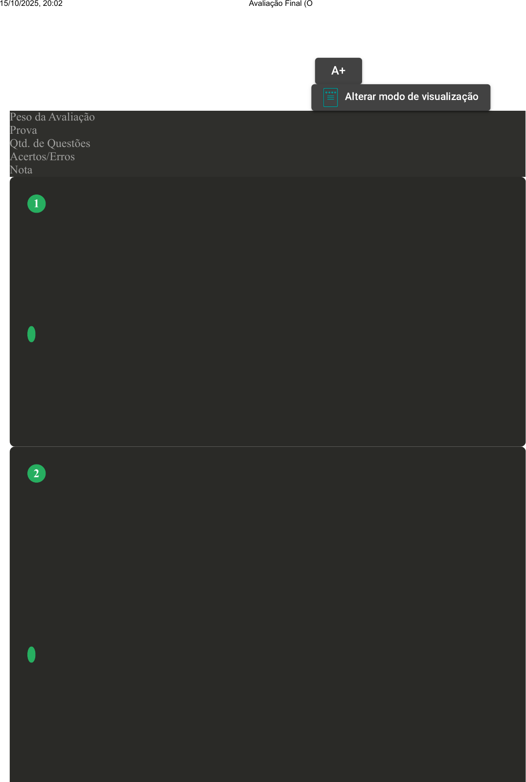Prova Impressa GABARITO | Avaliação Final (Objetiva) - Individual (Cod.:1522030) Peso da Avaliação 4,00 Prova 106157673 Qtd. de Questões 10 Acertos/Erros 9/1 Nota 9,00 A característica básica da educação a distância é o estabelecimento de uma comunicação de dupla via, na medida em que professor e aluno não se encontram juntos na mesma sala. Na educação a distância, a aprendizagem se dá por parte do aluno, ele deve construir seu conhecimento através das condições oferecidas. Ele deve ser autodidata e não mais esperar apenas pelo conhecimento do professor em sala de aula. De acordo com as tecnologias das gerações de educação a distância, assinale a alternativa CORRETA: A A segunda geração foi marcada pelas aulas virtuais baseadas no computador e na internet. B A quarta geração utilizou a teleconferência. O aluno podia interagir com professores e outros alunos em tempo real. Essa interação poderia ser conduzida com alunos em suas casas ou escritórios utilizando telefones comuns. C A primeira geração era por correspondência e seu foco era o estudo independente e em casa, utilizando material impresso e cd-rom. D A quinta geração foi marcada pela abordagem sistêmica na qual sua finalidade era articular mídias, ou seja, agrupar várias tecnologias. As comunidades virtuais se constituem por grupos de pessoas interconectadas em busca da inteligência coletiva e que a virtualização ou desterritorialização das comunidades no ciberespaço é condição para haver inteligência coletiva em grande escala. O estudo mostrou que a cibercultura é a expressão da aspiração de construção de um laço social, fundado sobre a reunião em torno de centros de interesses comuns, no compartilhamento de informações. Quanto às técnicas instrucionais centradas no aluno para que o professor tenha sucesso nas interações das comunidades, assinale a alternativa CORRETA: A Comprometimento: o professor deve explicar a realização de trabalhos, prazos de entrega e meios pelos quais a avaliação será elaborada, mas não deve explicar as expectativas com relação à utilização do tempo, deve criar uma agenda de publicação junto aos alunos e apoiar o desenvolvimento do gerenciamento de tempo. B Colaboração: o professor deve trabalhar com estudos de caso, trabalhos em pequenos grupos, simulações e utilização do pensamento crítico; fazer com que os alunos enviem seus trabalhos para a comunidade, para maior interação com os demais colegas e deve fazer perguntas abertas para estimular a discussão. C Comunicação: o professor deve deixar claro ao aluno as diretrizes para a comunicação, incluindo a netiqueta; exemplificar como realizar uma boa comunicação; estimular a participação, mas não acompanhar os alunos que não participam, pois é tarefa do aluno. D Acesso e habilidade: o professor deve utilizar apenas tecnologias que sirvam aos objetivos da aprendizagem; a tecnologia deve ser mantida em um nível complexo, a qual seja transparente ao VOLTAR A+ Alterar modo de visualização 1 2 15/10/2025, 20:02 Avaliação Final (Objetiva) - Individual about:blank 1/6 aluno; o professor deve se certificar de que o aluno tenha habilidade necessária para usar a tecnologia. A EAD como modalidade de ensino caracteriza-se pelo contexto em que professor e aluno encontram-se separados espacial ou temporalmente e são mediados pelas tecnologias de informação. A referida modalidade está em consonância com as transformações que vêm ocorrendo no decorrer desta última década, em virtude do surgimento de novas tecnologias. Nesse contexto, a educação a distância viabilizou a interação direta entre professor e aluno, aluno e aluno, aluno e tutor por meio da comunicação síncrona e assíncrona. Mediante essa modalidade de ensino, o aluno tornou-se responsável pelo seu próprio desenvolvimento, sendo ele o sujeito principal de sua aprendizagem. Com base no exposto, classifique V para as sentenças verdadeiras e F para as falsas: ( ) Os cursos oferecidos por meio da educação a distância devem ofertar aos estudantes a construção do conhecimento, formando um sujeito autônomo, criativo e crítico. ( ) Aos docentes que atuam na EAD não é necessário o domínio das tecnologias. Torna-se somente necessário que consigam orientar seus alunos a desenvolver competências e habilidades. ( ) A qualidade na educação a distância requer somente o comprometimento dos alunos com o processo de ensino e aprendizagem. ( ) Nos cursos de educação a distância, o trabalho e a mediação docente podem ser descartados, pois os alunos conseguem alcançar os objetivos sozinhos Assinale a alternativa que apresenta a sequência CORRETA: FONTE: HERNANDES, R. P. A Universidade Aberta do Brasil e a democratização do Ensino Superior público. Rev. Políticas Públicas Educacionais. Rio de janeiro, v.25, n. 95, p. 283-307, abr./jun. 2017. Acesso em: 1º jul. 2018. A F - V - V - F. B V - V - F - V. C V - F - V - F. D V - F - F - F. A tecnologia revolucionou o nosso modo de viver e de aprender. São muitos os recursos digitais que auxiliam o processo de ensino-aprendizagem, como os jogos eletrônicos, os aplicativos, os softwares educacionais, entre outros, desde que atendam aos critérios e aos objetivos pedagógicos e que tenham uma metodologia que coordene todo processo educativo. Quanto às características dos tipos de softwares, classifique V para as sentenças verdadeiras e F para as falsas: ( ) Softwares utilitários: são programas que auxiliam o computador durante a realização das tarefas executadas. Esses programas são extremamente necessários para o bom funcionamento do sistema operacional. Alguns exemplos: planilhas eletrônicas, anti-vírus, Word e Excel. ( ) Software aplicativo: tem por função auxiliar o professor nas tarefas diárias, facilitando seu trabalho pedagógico. Alguns exemplos: PowerPoint, Excel, Word e gravadores de CD. ( ) Softwares educaciona