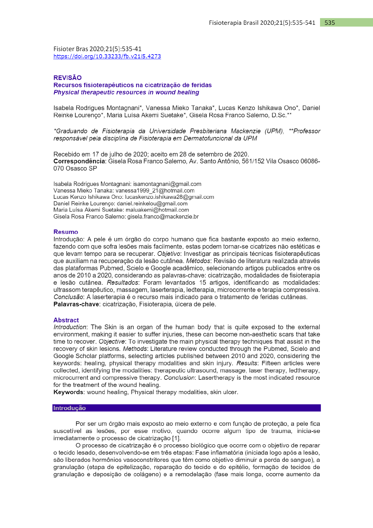 Fisioterapia Brasil 2020;21(5):535-541 535 Fisioter Bras 2020;21(5):535-41 https://doi.org/10.33233/fb.v21i5.4273 REVISÃO Recursos fisioterapêuticos na cicatrização de feridas Physical therapeutic resources in wound healing Isabela Rodrigues Montagnani*, Vanessa Mieko Tanaka*, Lucas Kenzo Ishikawa Ono*, Daniel Reinke Lourenço*, Maria Luísa Akemi Suetake*, Gisela Rosa Franco Salerno, D.Sc.** *Graduando de Fisioterapia da Universidade Presbiteriana Mackenzie (UPM), **Professor responsável pela disciplina de Fisioterapia em Dermatofuncional da UPM Recebido em 17 de julho de 2020; aceito em 28 de setembro de 2020. Correspondência: Gisela Rosa Franco Salerno, Av. Santo Antônio, 561/152 Vila Osasco 06086- 070 Osasco SP Isabela Rodrigues Montagnani: isamontagnani@gmail.com Vanessa Mieko Tanaka: vanessa1999_21@hotmail.com Lucas Kenzo Ishikawa Ono: lucaskenzo.ishikawa28@gmail.com Daniel Reinke Lourenço: daniel.reinkelou@gmail.com Maria Luísa Akemi Suetake: maluakemi@hotmail.com Gisela Rosa Franco Salerno: gisela.franco@mackenzie.br Resumo Introdução: A pele é um órgão do corpo humano que fica bastante exposto ao meio externo, fazendo com que sofra lesões mais facilmente, estas podem tornar-se cicatrizes não estéticas e que levam tempo para se recuperar. Objetivo: Investigar as principais técnicas fisioterapêuticas que auxiliam na recuperação da lesão cutânea. Métodos: Revisão de literatura realizada através das plataformas Pubmed, Scielo e Google acadêmico, selecionando artigos publicados entre os anos de 2010 a 2020, considerando as palavras-chave: cicatrização, modalidades de fisioterapia e lesão cutânea. Resultados: Foram levantados 15 artigos, identificando as modalidades: ultrassom terapêutico, massagem, laserterapia, ledterapia, microcorrente e terapia compressiva. Conclusão: A laserterapia é o recurso mais indicado para o tratamento de feridas cutâneas. Palavras-chave: cicatrização, Fisioterapia, úlcera de pele. Abstract Introduction: The Skin is an organ of the human body that is quite exposed to the external environment, making it easier to suffer injuries, these can become non-aesthetic scars that take time to recover. Objective: To investigate the main physical therapy techniques that assist in the recovery of skin lesions. Methods: Literature review conducted through the Pubmed, Scielo and Google Scholar platforms, selecting articles published between 2010 and 2020, considering the keywords: healing, physical therapy modalities and skin injury. Results: Fifteen articles were collected, identifying the modalities: therapeutic ultrasound, massage, laser therapy, ledtherapy, microcurrent and compressive therapy. Conclusion: Lasertherapy is the most indicated resource for the treatment of the wound healing. Keywords: wound healing, Physical therapy modalities, skin ulcer. Introdução Por ser um órgão mais exposto ao meio externo e com função de proteção, a pele fica suscetível as lesões, por esse motivo, quando ocorre algum tipo de trauma, inicia-se imediatamente processo de cicatrização [1]. processo de cicatrização é o processo biológico que ocorre com objetivo de reparar tecido lesado, desenvolvendo-se em três etapas: Fase inflamatória (iniciada logo após a lesão, são liberados hormônios vasoconstritores que têm como objetivo diminuir a perda de sangue), a granulação (etapa de epitelização, reparação do tecido e do epitélio, formação de tecidos de granulação e deposição de colágeno) e a remodelação (fase mais longa, ocorre aumento daFisioterapia Brasil 2020;21(5):535-541 536 tensão do tecido e redução do eritema, finalizando com a redução da cicatriz) [2]. Existem três tipos de cicatriz classificadas com base na quantidade de tecido lesado, são elas: cicatriz por primeira intenção, onde há perda tecidual e não tem presença de tecido de granulação, sendo geralmente uma cicatriz cirúrgica e controlada, tendo um tempo menor de cicatrização. A cicatriz por segunda intenção, tem maior perda de tecido, deixa-se que a ferida se granule sozinha, apenas cobrindo com um revestimento limpo e esterilizado, possui grande quantidade de tecido de granulação e pode ocasionar cicatrizes hipertróficas ou queloideanas. E a cicatriz por terceira intenção, casos de lesões contaminadas, onde a ferida também é limpa e coberta, mas, paciente retorna alguns dias depois para fechamento definitivo [3]. Existem alguns fatores que podem influenciar na cicatrização, como a alteração da oxigenação, devido a alterações circulatórias, infecção prolongada da lesão, podendo levar a cronificação dela; além da idade avançada, diabetes e obesidade [4]. Quando a cicatrização não ocorre de forma perfeita, poderá gerar cicatrizes hipertróficas ou queloideanas. Basicamente essas alterações no relevo das cicatrizes está relacionado ao acúmulo de fibroblastos e aumento do depósito de colágeno. As alterações hipertróficas apresentam redução no período de um ano que não acontece com a queloideanas, necessitando de intervenção médica [5]. Também existem recursos da fisioterapia que ajudam na cicatrização. Hoje em dia faz-se uso de algumas técnicas que visam promover uma cicatriz mais estética, entre elas existem algumas técnicas médicas como a dermoabrasão [6] e silicone gel [7] e escleroterapia de safena [8]. Já entre as técnicas fisioterapêuticas estão ultrassom, no qual as ondas ultrassônicas são absorvidas pelo tecido gerando aquecimento, auxiliando processo de cicatrização [9], a laserterapia, que também promove calor além de aumentar a produção de colágeno por meio da fotoestimulação [10] a massagem, que também promove o aquecimento da região e melhora a elasticidade do tecido [11], a terapia compressiva que aumenta retorno venoso [12], a microcorrente que regula a bioeletrecidade do tecido aumenta a síntese de colágeno e proliferação de fibroblastos [13] e 