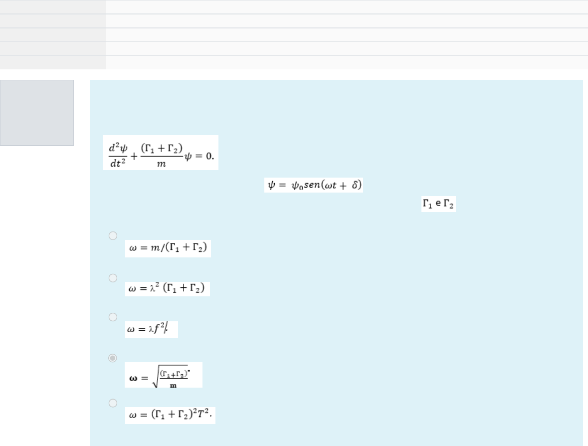 Questão 1 Correto Atingiu 0,34 de 0,34 Iniciado em segunda, 25 ago 2025, 23:12 Estado Finalizada Concluída em segunda, 25 ago 2025, 23:28 Tempo empregado 16 minutos 10 segundos Avaliar 1,02 de um máximo de 1,70(60%) Considere um sistema de mecânica quântica pode ser modelado segundo a equação diferencial de onda de Schroedinger, Considerando como solução a função e baseado nessas informações marque a alternativa correta em relação à frequência angular, dada por, ω. Considere constantes. a. b. c. d. e. Questão 2 Correto Atingiu 0,34 de 0,34 Imagine um sistema no contexto da gravitação que foi modelado por meio das equações de Einstein, obtendo: Em que a é uma constante. Com essa informação, marque a alternativa correta em relação aos componentes dessa equação diferencial. a. A segunda derivada não permite funções iguais a primeira derivada. b. O termo de quinta ordem pode ser visto como uma aceleração ao quadrado. c. A equação diferencial obtida é uma equação de segunda ordem. d. O termo de quinta ordem é uma velocidade elevada a quinta potência. e. A aceleração do sistema é uma combinação entre a velocidade do mesmo e um termo de ordem superior. Questão 3 Correto Atingiu 0,34 de 0,34 Questão 4 Incorreto Atingiu 0,00 de 0,34 Uma nova molécula foi descoberta no planeta saturno. Devido a novidade os cientistas utilizando suas técnicas de modelagem de sistemas conseguiram obter a seguinte equação diferencial para estudar o comportamento das vibrações dos átomos presentes na molécula, Considerando essas informações, marque a alternativa correta em relação à solução dessa equação diferencial, considerando como o módulo da aceleração da gravidade no referido planeta, a distância da ligação entre os átomos envolvidos, a massa dos átomos, a função relacionada à força de resistência e a variável angular que descreve o movimento. a. b. c. d. e. No contexto das funções, existem na literatura um tipo de função que é muito utilizada no contexto das equações diferenciais. Muitas vezes, esse tipo de funções é considerado especial por apresentar a incrível capacidade de equivalerem as suas segundas derivadas. O nome dado a esses tipos de funções é cíclica. Baseado nessas informações, marque a alternativa correta em que a segunda derivada da função, em relação a variável k, é igual à função original. a. b. c. d. e. ak, com a sendo uma constante. Questão 5 Incorreto Atingiu 0,00 de 0,34 Um modelo fictício de um circuito elétrico foi modelado considerando a gravidade da lua. Isso foi modelado com a finalidade de estudar o comportamento do circuito em diferentes locais do universo, sob a ação de diferentes gravidades. Assim, após a aplicação das leis de Kirchhoff foi obtida a seguinte equação diferencial: Nesse caso, Q é a carga elétrica envolvida no circuito, g o módulo da aceleração da gravidade e R a resistência do sistema. Baseado nessas informações, marque a alternativa correta em relação a solução dessa equação diferencial. a. b. c. d. e.