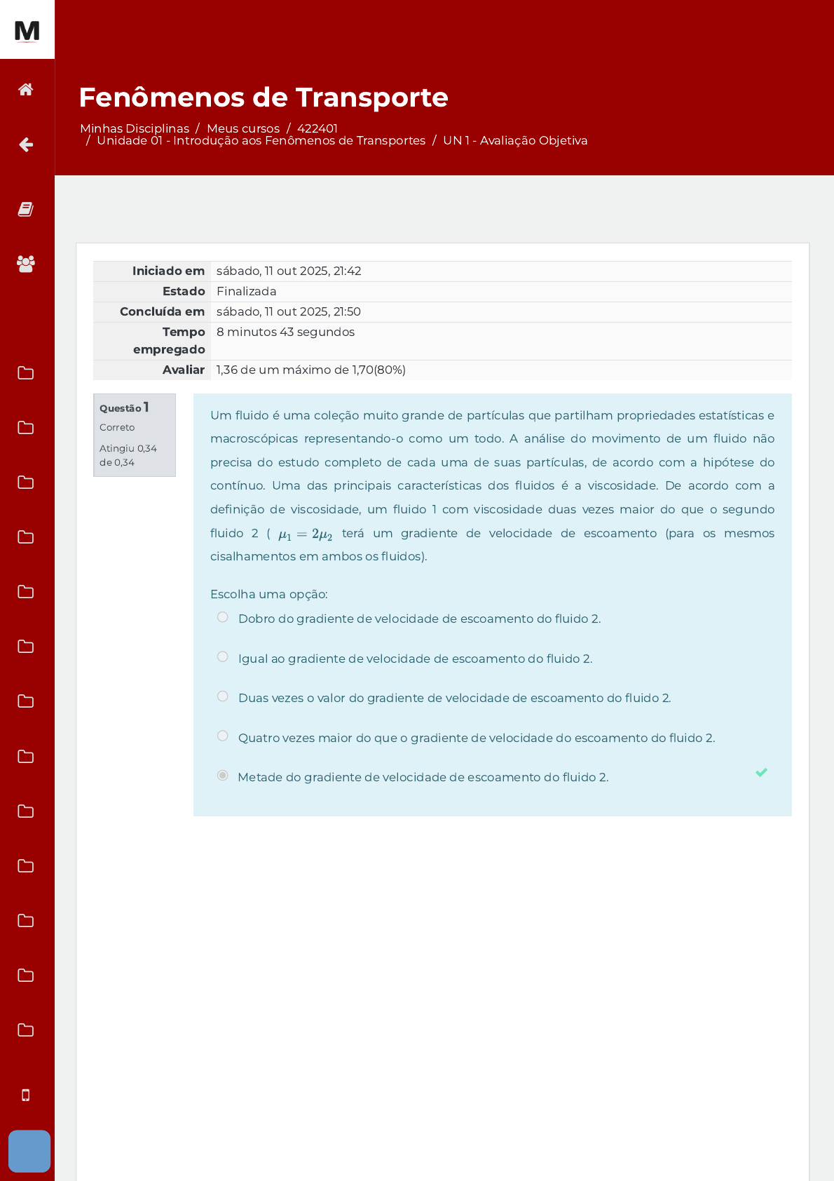 Minhas Disciplinas / Meus cursos / 422401 / Unidade 01 - Introdução aos Fenômenos de Transportes / UN 1 - Avaliação Objetiva Fenômenos de Transporte Questão 1 Correto Atingiu 0,34 de 0,34 Iniciado em sábado, 11 out 2025, 21:42 Estado Finalizada Concluída em sábado, 11 out 2025, 21:50 Tempo empregado 8 minutos 43 segundos Avaliar 1,36 de um máximo de 1,70(80%) Um fluido é uma coleção muito grande de partículas que partilham propriedades estatísticas e macroscópicas representando-o como um todo. A análise do movimento de um fluido não precisa do estudo completo de cada uma de suas partículas, de acordo com a hipótese do contínuo. Uma das principais características dos fluidos é a viscosidade. De acordo com a definição de viscosidade, um fluido 1 com viscosidade duas vezes maior do que o segundo fluido 2 ( terá um gradiente de velocidade de escoamento (para os mesmos cisalhamentos em ambos os fluidos). Escolha uma opção: Dobro do gradiente de velocidade de escoamento do fluido 2. Igual ao gradiente de velocidade de escoamento do fluido 2. Duas vezes o valor do gradiente de velocidade de escoamento do fluido 2. Quatro vezes maior do que o gradiente de velocidade do escoamento do fluido 2. Metade do gradiente de velocidade de escoamento do fluido 2. = 2μ1 μ2 https://avap.multivix.edu.br/my/ https://avap.multivix.edu.br/course/view.php?id=36227 https://avap.multivix.edu.br/course/view.php?id=36227§ion=2 https://avap.multivix.edu.br/mod/quiz/view.php?id=1959685 https://avap.multivix.edu.br/my/ https://avap.multivix.edu.br/course/view.php?id=36227 https://avap.multivix.edu.br/user/index.php?id=36227 https://avap.multivix.edu.br/course/view.php?id=36227§ion=1 https://avap.multivix.edu.br/course/view.php?id=36227§ion=2 https://avap.multivix.edu.br/course/view.php?id=36227§ion=3 https://avap.multivix.edu.br/course/view.php?id=36227§ion=4 https://avap.multivix.edu.br/course/view.php?id=36227§ion=5 https://avap.multivix.edu.br/course/view.php?id=36227§ion=6 https://avap.multivix.edu.br/course/view.php?id=36227§ion=7 https://avap.multivix.edu.br/course/view.php?id=36227§ion=8 https://avap.multivix.edu.br/course/view.php?id=36227§ion=9 https://avap.multivix.edu.br/course/view.php?id=36227§ion=10 https://avap.multivix.edu.br/course/view.php?id=36227§ion=11 https://avap.multivix.edu.br/course/view.php?id=36227§ion=12 https://avap.multivix.edu.br/course/view.php?id=36227§ion=13 https://avap.multivix.edu.br/hooks/portal/ https://avap.multivix.edu.br/mod/page/view.php?id=1252%2F%22%20target%3D%22_blank https://avap.multivix.edu.br/ https://avap.multivix.edu.br/ https://avap.multivix.edu.br/ https://avap.multivix.edu.br/ https://avap.multivix.edu.br/ Questão 2 Incorreto Atingiu 0,00 de 0,34 Questão 3 Correto Atingiu 0,34 de 0,34 O Princípio da Aderência é muito importante para explicar o comportamento do escoamento laminar de fluidos dentro de dutos. Considere um duto circular de raio R, cujo perfil de velocidades é dado pela expressão: Em que r é a distância radial a partir do centro do escoamento. A que distância do centro do duto circular acima a velocidade de escoamento é a metade da velocidade máxima: ? Escolha uma opção: Vmax r = R r = − R 2√ 2 r = R1 2 r = R 2√ 2 r = 0 A aderência de um fluido e sua viscosidade estão relacionadas entre si. De acordo com o Princípio de Aderência, a lâmina de fluido em contato direto com uma placa em movimento adquire a velocidade desta placa. O que ocorre com o perfil (inicial) vertical de velocidade de escoamento do fluido se a placa inferior também se move na mesma direção que a placa superior e com a mesma velocidade? Escolha uma opção: O perfil será semelhante a uma parábola, com velocidade máxima do fluido na metade da distância entre as placas. O perfil será semelhante a uma parábola, com velocidade nula do fluido em contato com as placas. O perfil será semelhante a uma parábola, com velocidade máxima na placa superior e zero na placa inferior. O perfil será semelhante a uma parábola, com velocidade mínima do fluido na placa superior e máxima na placa inferior. O perfil será semelhante a uma parábola, com velocidade nula do fluido na metade da distância entre as placas. (y, t) Vx https://avap.multivix.edu.br/my/ https://avap.multivix.edu.br/course/view.php?id=36227 https://avap.multivix.edu.br/user/index.php?id=36227 https://avap.multivix.edu.br/course/view.php?id=36227§ion=1 https://avap.multivix.edu.br/course/view.php?id=36227§ion=2 https://avap.multivix.edu.br/course/view.php?id=36227§ion=3 https://avap.multivix.edu.br/course/view.php?id=36227§ion=4 https://avap.multivix.edu.br/course/view.php?id=36227§ion=5 https://avap.multivix.edu.br/course/view.php?id=36227§ion=6 https://avap.multivix.edu.br/course/view.php?id=36227§ion=7 https://avap.multivix.edu.br/course/view.php?id=36227§ion=8 https://avap.multivix.edu.br/course/view.php?id=36227§ion=9 https://avap.multivix.edu.br/course/view.php?id=36227§ion=10 https://avap.multivix.edu.br/course/view.php?id=36227§ion=11 https://avap.multivix.edu.br/course/view.php?id=36227§ion=12 https://avap.multivix.edu.br/course/view.php?id=36227§ion=13 https://avap.multivix.edu.br/hooks/portal/ https://avap.multivix.edu.br/mod/page/view.php?id=1252%2F%22%20target%3D%22_blank https://avap.multivix.edu.br/ https://avap.multivix.edu.br/ https://avap.multivix.edu.br/ https://avap.multivix.edu.br/ https://avap.multivix.edu.br/ Questão 4 Correto Atingiu 0,34 de 0,34 Questão 5 Correto Atingiu 0,34 de 0,34 A lei dos gases ideais é uma relação muito importante, pois ela relaciona o produto da pressão do gás e o volume que ele ocupa com o número de partículas e a temperatura do gás. Esta relação é escrita como: , em que R é a constante dos gases ideais. Nesta relação, cite quais são as quantidades intensivas e defina qual é o significado físico do volume de um gás ideal. Escolha uma opção: As quantidades intensivas 