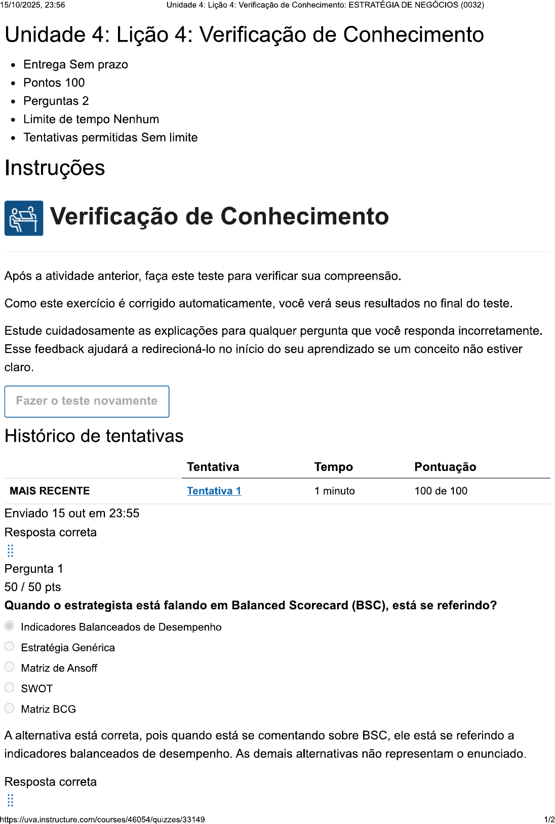 15/10/2025, 23:56 Unidade 4: Lição 4: Verificação de Conhecimento: ESTRATÉGIA DE NEGÓCIOS (0032) Unidade 4: Lição 4: Verificação de Conhecimento Entrega Sem prazo Pontos 100 Perguntas 2 Limite de tempo Nenhum Tentativas permitidas Sem limite Instruções Verificação de Conhecimento Após a atividade anterior, faça este teste para verificar sua compreensão. Como este exercício é corrigido automaticamente, você verá seus resultados no final do teste. Estude cuidadosamente as explicações para qualquer pergunta que você responda incorretamente. Esse feedback ajudará a redirecioná-lo no início do seu aprendizado se um conceito não estiver claro. Fazer teste novamente Histórico de tentativas Tentativa Tempo Pontuação MAIS RECENTE Tentativa 1 1 minuto 100 de 100 Enviado 15 out em 23:55 Resposta correta Pergunta 1 50 / 50 pts Quando estrategista está falando em Balanced Scorecard (BSC), está se referindo? Indicadores Balanceados de Desempenho Estratégia Genérica Matriz de Ansoff SWOT Matriz BCG A alternativa está correta, pois quando está se comentando sobre BSC, ele está se referindo a indicadores balanceados de desempenho. As demais alternativas não representam enunciado. Resposta correta 1/215/10/2025, 23:56 Unidade 4: Lição 4: Verificação de Conhecimento: ESTRATÉGIA DE NEGÓCIOS (0032) Pergunta 2 50 / 50 pts Definir os indicadores estratégicos fazem parte de qual planejamento? Planejamento Tático Planejamento Financeiro Planejamento de Marketing Planejamento Operacional Planejamento Estratégico A alternativa está correta, pois definir os indicadores estratégicos fazem parte do planejamento elaborado pela alta direção da organização, sendo assim, faz parte do planejamento estratégico. As demais alternativas não representam enunciado. https://uva.instructure.com/courses/46054/quizzes/33149 2/2