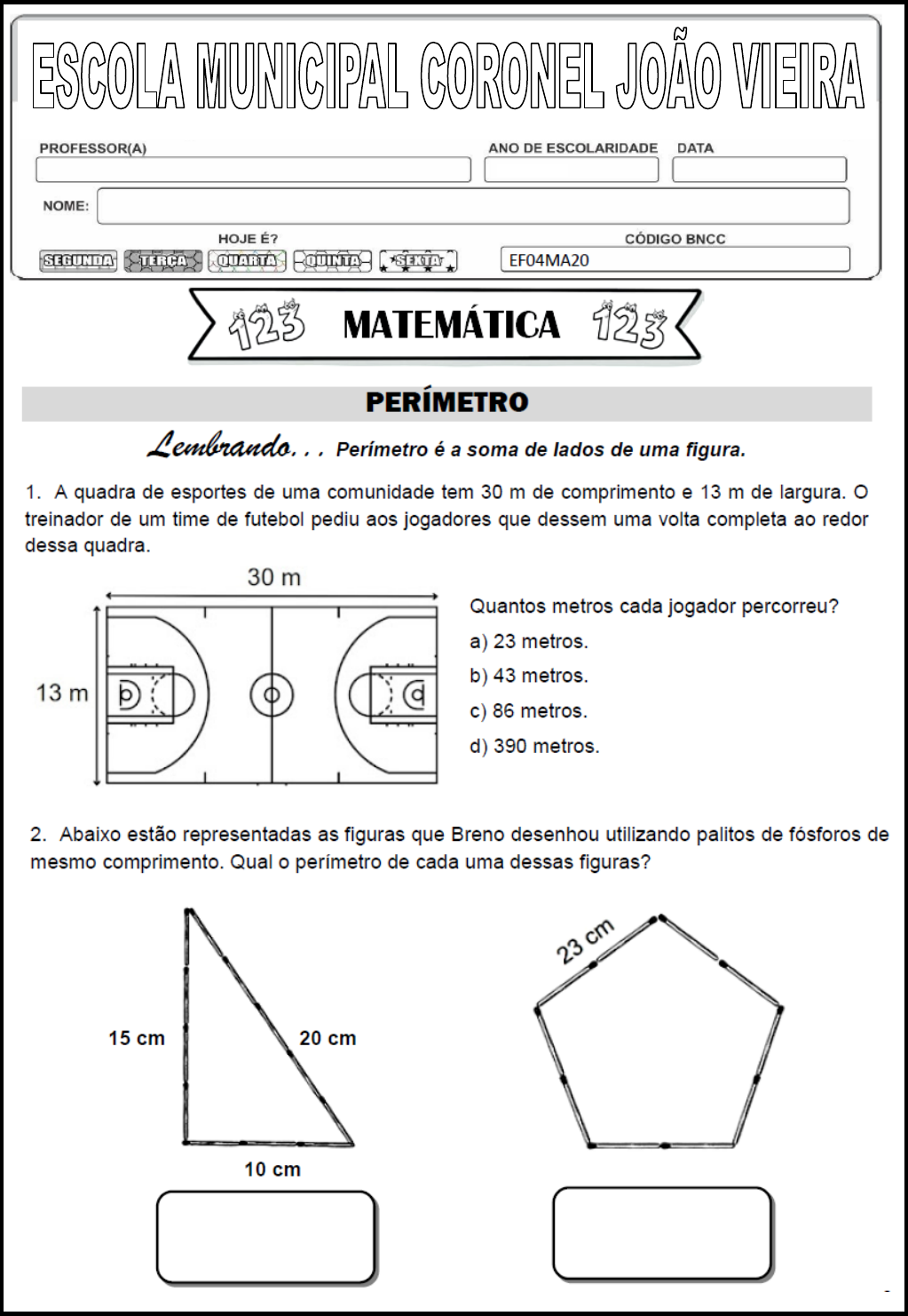 ESCOLA MUNICIPAL CORONEL JOAO VIEIRA PROFESSOR(A) ANO DE ESCOLARIDADE DATA NOME: HOJE É? CÓDIGO BNCC SEGUNDA TERCA QUARTA QUINTA SEXTA EF04MA20 123 MATEMÁTICA 123 PERÍMETRO Perímetro é a soma de lados de uma figura. 1. A quadra de esportes de uma comunidade tem 30 m de comprimento e 13 m de largura. treinador de um time de futebol pediu aos jogadores que dessem uma volta completa ao redor dessa quadra. 30 m Quantos metros cada jogador percorreu? a) 23 metros. b) 43 metros. 13 m c) 86 metros. d) 390 metros. 2. Abaixo estão representadas as figuras que Breno desenhou utilizando palitos de fósforos de mesmo comprimento. Qual de cada uma dessas figuras? 23 cm 15 cm 20 cm 10 cm3. Caio vai construir uma tela para cercar a horta que pretende construir em seu quintal. Observe a seguir formato dessa horta. E 11 m Quantos metros de tela Caio precisará comprar, no mínimo, para cercar essa horta? a) 44 metros. b) 68 metros. 16 m c) 70 metros. d) 76 metros. 9m 4. Em um retângulo, a largura mede a metade do seu comprimento. Sabendo que seu comprimento é de 12 cm, qual perímetro desse retângulo? 12 cm PERÍMETRO: 5. Considerando que lado de cada quadradinho abaixo tem 2 cm de lado, preencha a FIGURA PERÍMETRO A B c A 6. Calcule perímetro das figuras a seguir. 23 cm 12 cm PERÍMETRO: 13 cm 9cm cm PERÍMETRO: