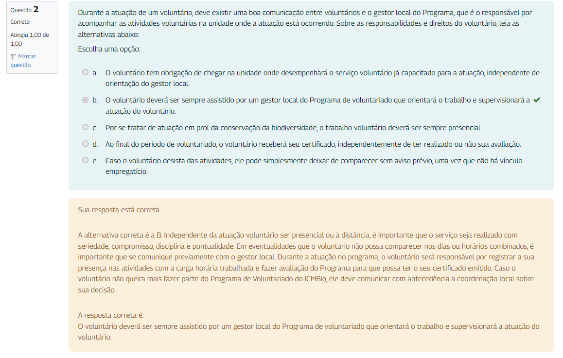 Questão 2 Durante a atuação de um voluntário, deve existir uma boa comunicação entre voluntários e 0 gestor local do Programa, que é 0 responsável por Correto acompanhar as atividades voluntárias na unidade onde a atuação está ocorrendo. Sobre as responsabilidades e direitos do voluntário, leia as Atingiu 1,00 de alternativas abaixo: 1,00 Escolha uma opção: Marcar questão a. voluntário tem obrigação de chegar na unidade onde desempenhará 0 serviço voluntário já capacitado para a atuação, independente de orientação do gestor local. b. voluntário deverá ser sempre assistido por um gestor local do Programa de voluntariado que orientará trabalho e supervisionará a atuação do voluntário. C. Por se tratar de atuação em prol da conservação da biodiversidade, 0 trabalho voluntário deverá ser sempre presencial. d. Ao final do período de voluntariado, 0 voluntário receberá seu certificado, independentemente de ter realizado ou não sua avaliação. e. Caso 0 voluntário desista das atividades, ele pode simplesmente deixar de comparecer sem aviso prévio, uma vez que não há vínculo empregatício. Sua resposta está correta. A alternativa correta é a B. Independente da atuação voluntário ser presencial ou à distância, é importante que 0 serviço seja realizado com seriedade, compromisso, disciplina e pontualidade. Em eventualidades que voluntário não possa comparecer nos dias ou horários combinados, é importante que se comunique previamente com 0 gestor local. Durante a atuação no programa, voluntário será responsável por registrar a sua presença nas atividades com a carga horária trabalhada e fazer avaliação do Programa para que possa ter seu certificado emitido. Caso voluntário não queira mais fazer parte do Programa de Voluntariado do ICMBio, ele deve comunicar com antecedência a coordenação local sobre sua decisão. A resposta correta é: 0 voluntário deverá ser sempre assistido por um gestor local do Programa de voluntariado que orientará 0 trabalho e supervisionará a atuação do voluntário.