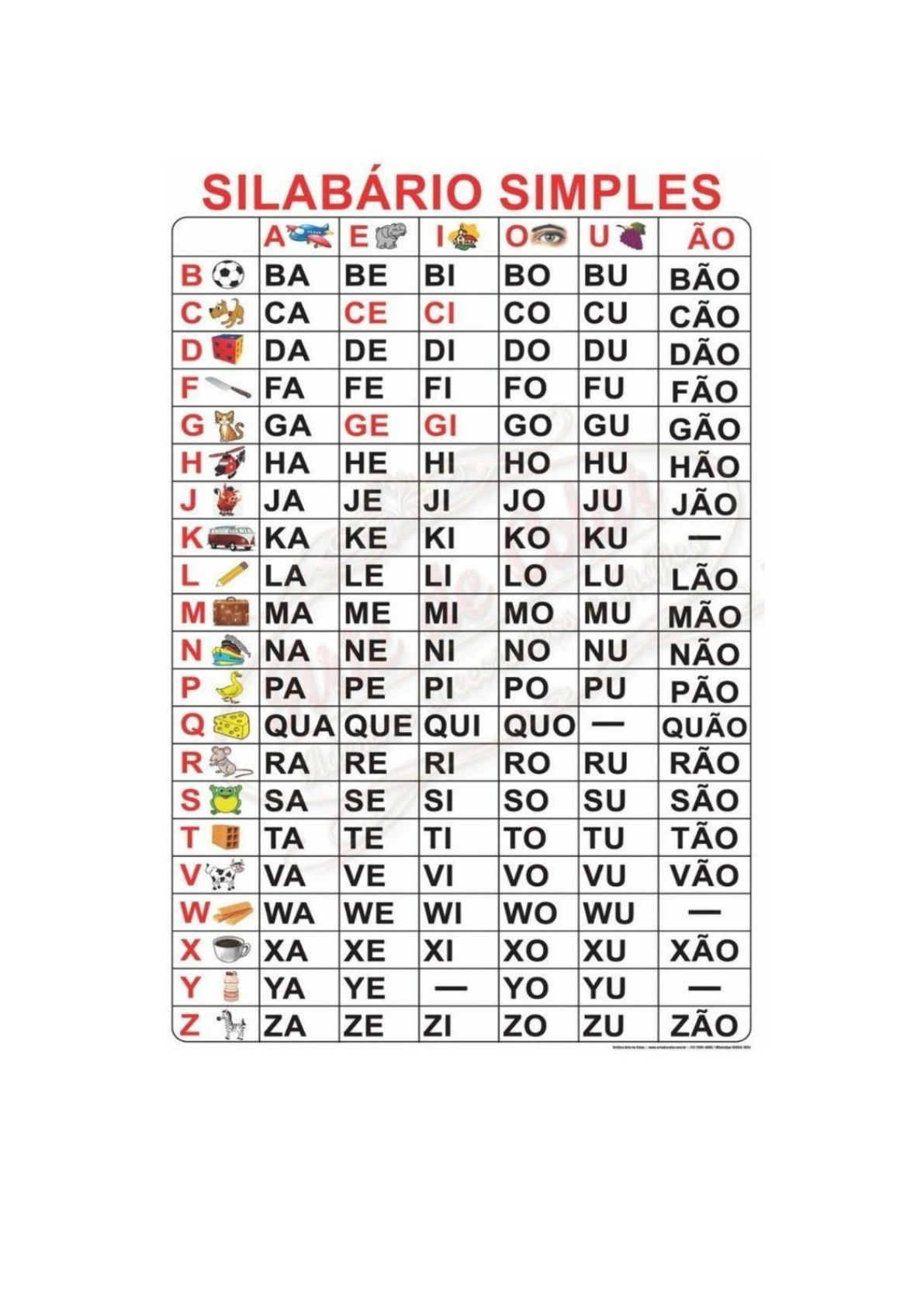 SILABÁRIO SIMPLES E I U ÃO BA BE BI Bo BU BÃO CA CE CI co CU CÃO D DA DE DI DO DU DÃO F FA FE FI FO FU FÃO G S GA GE GI GO GU GÃO H HA HE HI HU HÃO J JA JE JI JO JU JÃO K KA KE KI KO KU I L LA LE LI LO LU LÃO M MA ME MI MO MU MÃO N NA NE NI NO NU NÃO P PA PE PI PO PU PÃO Q QUA QUE QUI QUO QUÃO R RA RE RI RO RU RÃO S SA SE SI so SU SÃO T TA TE TI TO TU TÃO V VA VE VI vo VU VÃO W WA WE WI WU X XA XI XU XÃO Y YA YE YO YU I Z ZA ZE ZI ZU ZÃOSílabas Complexas AQUÁRIO QUA QUE QUI QUO - BRAÇO BRA BRE BRI BRO BRU CRAVO CRA CRE CRI CRO CRU DRAGÃO DRA DRE DRI DRO DRU FRALDA FRA FRE FRI FRO FRU GRAVATA GRA GRE GRI GRO GRU PRATO PRA PRE PRI PRO PRU TRATOR TRA TRE TRI TRO TRU LIVRO VRA VRE VRI VRO VRU BLUSA BLA BLE BLI BLO BLU CLARA CLA CLE CLI CLO CLU FLAUTA FLA FLE FLI FLO FLU GLOBO GLA GLE GLI GLO GLU E PLACA PLA PLE PLI PLO PLU ATLETA TLA TLE TLI TLO TLU VLADMIR VLA VLE VLI VLO VLU CHAPÉU CHA CHE CHI CHO CHU ÁRVORE AR ER IR OR UR GALINHA NHA NHE NHI NHO NHU COELHO LHA LHE LHI LHO LHU ESCADA AS ES IS US ANJO AN EN IN ON UN ALFACE AL EL IL OL UL FOGUETE GUA GUE GUI GUO -