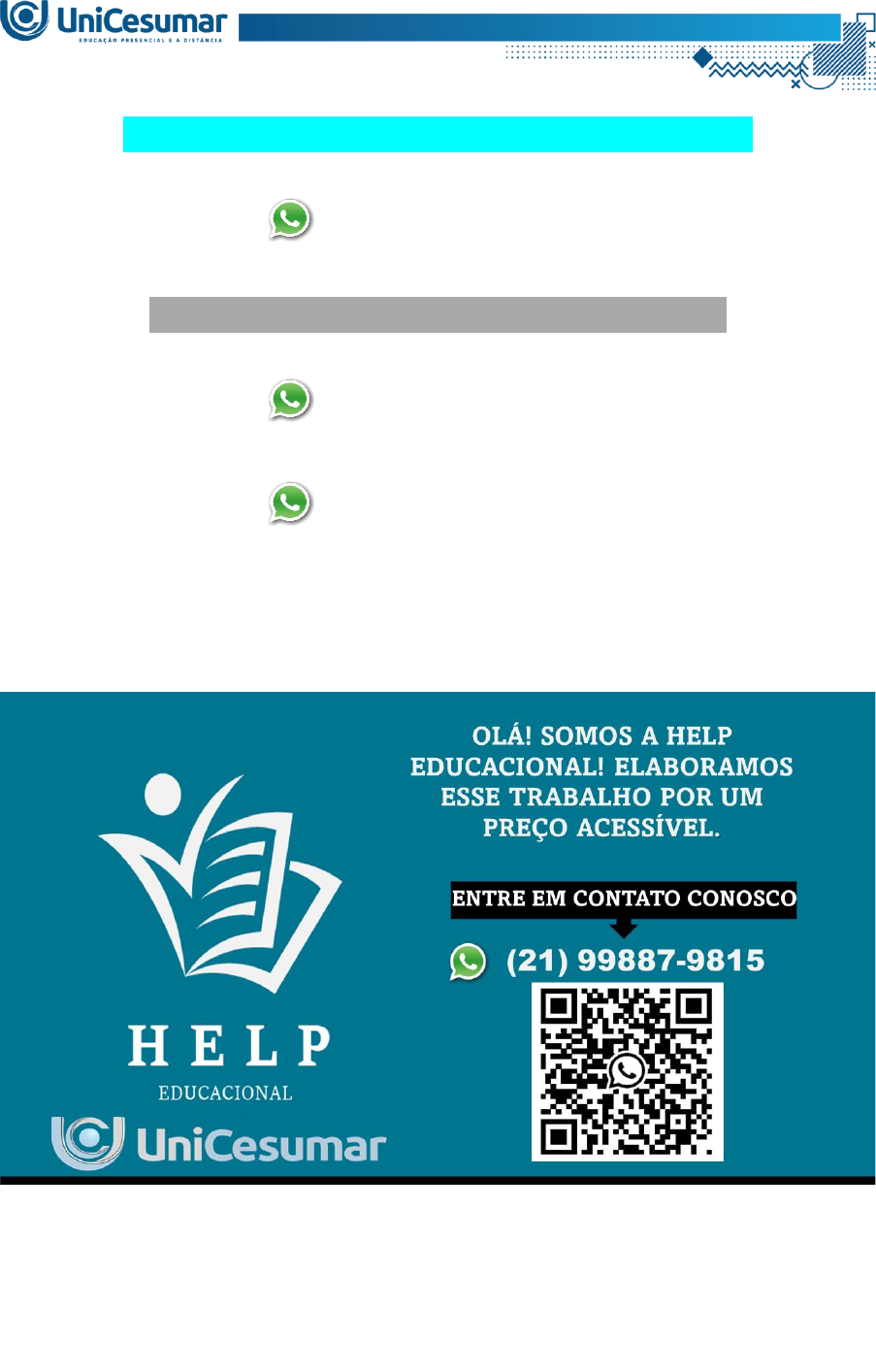 MAPA – ENF – PARASITOLOGIA - 54_2025 (21) 99887-9815 ASSESSORIA NOS SEUS TRABALHOS (21) 99887-9815 (21) 99887-9815 Olá aluno (a), seja bem-vindo a atividade MAPA (Material de Avaliação Prática de Aprendizagem) desta disciplina! CONTEXTUALIZAÇÃO: “Uma pesquisa da Universidade Federal da Paraíba (UFPB) identificou contamina ção do solo com presença de parasitos em 04 praças públicas da cidade de João Pessoa (...) Os pesquisadores retiraram amostras dos solos que foram analisadas no Laborató- rio de Parasitologia do Departamento de Fisiologia e Patologia da UFPB, por meio da utilização de três métodos laboratoriais para investigação e identificação micros- cópica (Método de Hoffman, Pons e Janer; Método de Rugai, Mattos e Brisola e Mé- todo de Faust) Nas 04 praças públicas de João Pessoa foram encontrados ovos de helmintos Anci- lostomídeos, (parasitos do intestino delgado, ou parasitas como mais popularmente são conhecidos) e Toxocara canis (parasitos de cães que podem infectar humanos), que representaram 57,1% e 21,4%, respectivamente, do total de amostras de solo contaminadas. Já as espécies de larvas encontradas foram o equivalente a 50% de Ancilostomídeos (causadores da ancilostomíase) e 71,4% de Strongyloides sterco- ralis (causador da estrongiloidíase). Os pesquisadores esclarecem que a presença de formas evolutivas parasitárias de protozoários e helmintos no solo de ambientes públicos resulta em um grave pro- blema de saúde pública. As espécies parasitárias encontradas podem ocasionar a incidência de zoonoses que são doenças infecciosas transmitidas entre os animais e seres humanos, tais como a Estrongiloidíase, Larva migrans cutânea (Bicho geográfico) e Toxocaríase. Essas parasitoses podem ocasionar dor abdominal, náuseas, vômitos, diarreia, ane- mia, febre, perda de peso, cansaço, bem como coceira e lesões na pele (...). “ Fonte: https://www.ufpb.br/ufpb/contents/noticias/risco-a-saude-pesquisa-da-ufpb- identifica-presenca-de-parasitos-em-solos-de-pracas-publicas-de-joao-pessoa O QUE DEVO FAZER NESTA ATIVIDADE? Com base nessas informações, você deve elaborar um post para o instagram desta- cando informações importantes sobre UMA das patologias mencionadas na reporta- gem acima. Não é necessário fazer a postagem, somente elaborar o post. Siga os comandos abaixo para criar seu post: 1- ESCOLHA uma das patologias: Estrongiloidíase, Larva migrans cutânea (Bicho geográfico) OU Toxocaríase. 2- ESCREVA um texto com no máximo 800 caracteres destacando a importância da parasitose escolhida. 3- INSIRA, de 4 a 6 imagens. 4- INCLUA: - O nome do parasito da patologia escolhida; - As principais formas de transmissão e o ciclo biológico; - Sinais e sintomas relacionados; - Medidas de prevenção; - O que a população deve fazer caso apresentar os sintomas dessa patologia. Instruções: - Use e abuse da criatividade! - Você pode utilizar ferramentas como PowerPoint e Canva para elaborar as ima- gens a serem postadas no instagram. - Utilize o Formulário Padrão MAPA para realizar esta atividade. Ele se encontra na pasta "Material da Disciplina". Siga todas as instruções constantes nesse modelo. - Além do material da disciplina, você pode utilizar as referências abaixo para auxi- liar na sua resposta: FEREIRA, M. U. Parasitologia Contemporânea. 2. ed. [S. l.]: Grupo GEN, 2020. NEVES, D. P. et al. Parasitologia Humana. 14. ed. [S. l.]: Atheneu, 2022. REY, L. Bases da Parasitologia Médica. 3. ed. Rio de Janeiro: Guanabara Koo- gan, 2009. REY, L. Parasitologia. 4. ed. [S. l.]: Grupo GEN, 2008. ZEIBIG, E. Parasitologia Clínica: uma abordagem clínico-laboratorial. 2. ed. [S. l.]: Grupo GEN, 2014. BOM TRABALHO! OLÁ! SOMOS A HELP EDUCACIONAL! ELABORAMOS ESSE TRABALHO POR UM PREÇO ACESSÍVEL. ENTRE EM CONTATO CONOSCO (21) 99887-9815