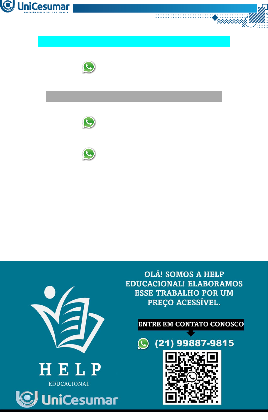 MAPA – ENF – PARASITOLOGIA - 54_2025 (21) 99887-9815 ASSESSORIA NOS SEUS TRABALHOS (21) 99887-9815 (21) 99887-9815 Olá aluno (a), seja bem-vindo a atividade MAPA (Material de Avaliação Prática de Aprendizagem) desta disciplina! CONTEXTUALIZAÇÃO: “Uma pesquisa da Universidade Federal da Paraíba (UFPB) identificou contamina- ção do solo com presença de parasitos em 04 praças públicas da cidade de João Pessoa (...) Os pesquisadores retiraram amostras dos solos que foram analisadas no Laborató- rio de Parasitologia do Departamento de Fisiologia e Patologia da UFPB, por meio da utilização de três métodos laboratoriais para investigação e identificação micros- cópica (Método de Hoffman, Pons e Janer; Método de Rugai, Mattos e Brisola e Mé todo de Faust) Nas 04 praças públicas de João Pessoa foram encontrados ovos de helmintos Anci- lostomídeos, (parasitos do intestino delgado, ou parasitas como mais popularmente são conhecidos) e Toxocara canis (parasitos de cães que podem infectar humanos), que representaram 57,1% e 21,4%, respectivamente, do total de amostras de solo contaminadas. Já as espécies de larvas encontradas foram o equivalente a 50% de Ancilostomídeos (causadores da ancilostomíase) e 71,4% de Strongyloides sterco- ralis (causador da estrongiloidíase) Os pesquisadores esclarecem que a presença de formas evolutivas parasitárias de protozoários e helmintos no solo de ambientes públicos resulta em um grave pro- blema de saúde pública As espécies parasitárias encontradas podem ocasionar a incidência de zoonoses que são doenças infecciosas transmitidas entre os animais e seres humanos, tais como a Estrongiloidíase, Larva migrans cutânea (Bicho geográfico) e Toxocaríase. Essas parasitoses podem ocasionar dor abdominal, náuseas, vômitos, diarreia, ane- mia, febre, perda de peso, cansaço, bem como coceira e lesões na pele (...). “ Fonte: https://www.ufpb.br/ufpb/contents/noticias/risco-a-saude-pesquisa-da-ufpb- identifica-presenca-de-parasitos-em-solos-de-pracas-publicas-de-joao-pessoa O QUE DEVO FAZER NESTA ATIVIDADE? Com base nessas informações, você deve elaborar um post para o instagram desta- cando informações importantes sobre UMA das patologias mencionadas na reporta- gem acima. Não é necessário fazer a postagem, somente elaborar o post. Siga os comandos abaixo para criar seu post: 1- ESCOLHA uma das patologias: Estrongiloidíase, Larva migrans cutânea (Bicho geográfico) OU Toxocaríase. 2- ESCREVA um texto com no máximo 800 caracteres destacando a importância da parasitose escolhida. 3- INSIRA, de 4 a 6 imagens. 4- INCLUA: - O nome do parasito da patologia escolhida; - As principais formas de transmissão e o ciclo biológico; - Sinais e sintomas relacionados; - Medidas de prevenção; - O que a população deve fazer caso apresentar os sintomas dessa patologia. Instruções: - Use e abuse da criatividade! - Você pode utilizar ferramentas como PowerPoint e Canva para elaborar as ima- gens a serem postadas no instagram. - Utilize o Formulário Padrão MAPA para realizar esta atividade. Ele se encontra na pasta "Material da Disciplina". Siga todas as instruções constantes nesse modelo. - Além do material da disciplina, você pode utilizar as referências abaixo para auxi- liar na sua resposta: FEREIRA, M. U. Parasitologia Contemporânea. 2. ed. [S. l.]: Grupo GEN, 2020. NEVES, D. P. et al. Parasitologia Humana. 14. ed. [S. l.]: Atheneu, 2022. REY, L. Bases da Parasitologia Médica. 3. ed. Rio de Janeiro: Guanabara Koo- gan, 2009. REY, L. Parasitologia. 4. ed. [S. l.]: Grupo GEN, 2008. ZEIBIG, E. Parasitologia Clínica: uma abordagem clínico-laboratorial. 2. ed. [S. l.]: Grupo GEN, 2014. BOM TRABALHO! OLÁ! SOMOS A HELP EDUCACIONAL! ELABORAMOS ESSE TRABALHO POR UM PREÇO ACESSÍVEL. ENTRE EM CONTATO CONOSCO (21) 99887-9815