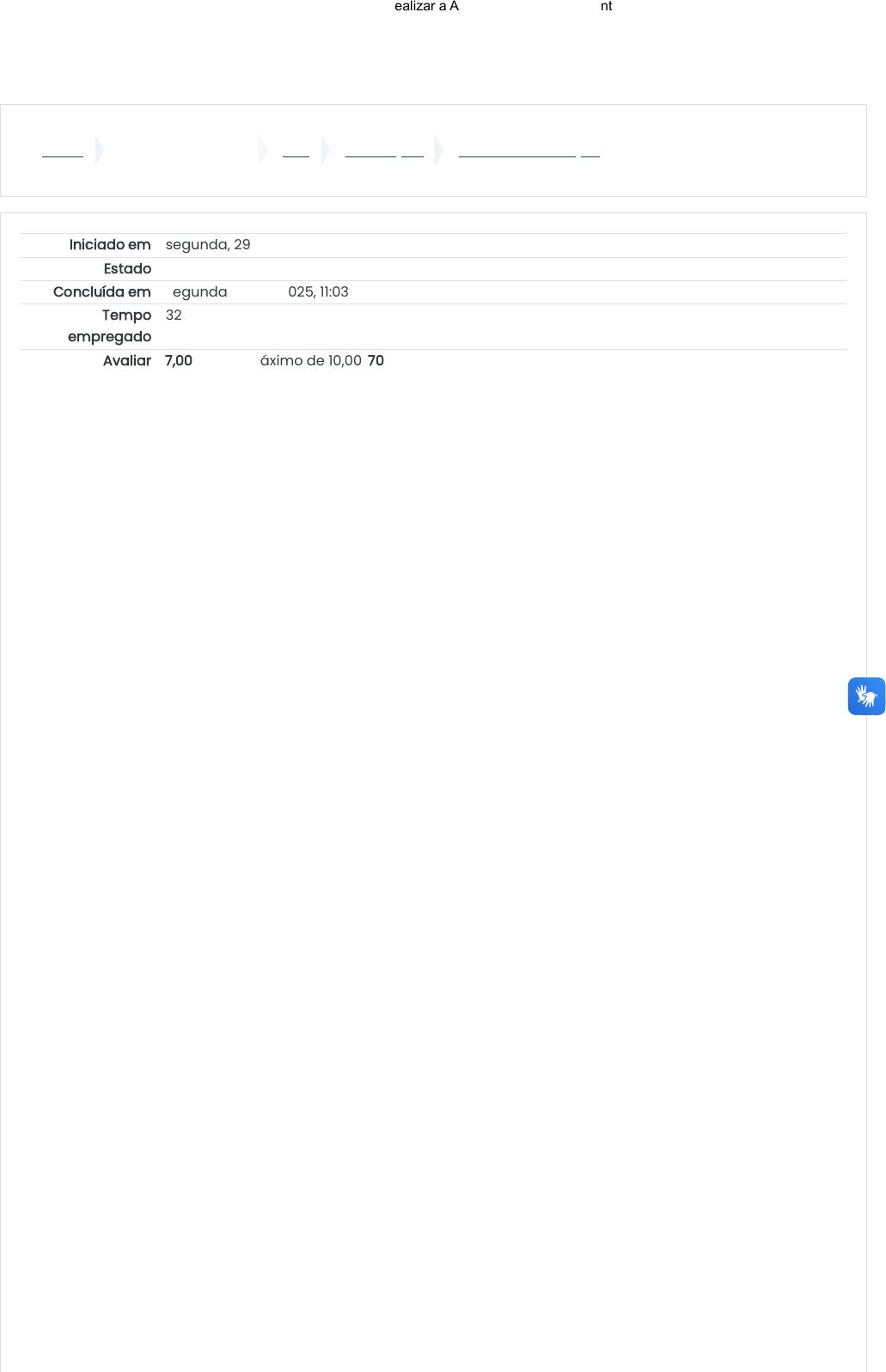 Painel Minhas Disciplinas D82 AVALIAÇÃO Realizar a Avaliação Iniciado em segunda, 29 Set 2025, 10:31 Estado Finalizada Concluída em segunda, 29 Set 2025, 11:03 Tempo empregado 32 minutos 2 segundos Avaliar 7,00 de um máximo de 10,00(70%) 29/09/2025, 11:04 Realizar a Avaliação: Revisão da tentativa https://cesap.edu.br/ava/mod/quiz/review.php?attempt=114076&cmid=654 1/8 https://cesap.edu.br/ava/my/ https://cesap.edu.br/ava/course/view.php?id=42 https://cesap.edu.br/ava/course/view.php?id=42#section-5 https://cesap.edu.br/ava/mod/quiz/view.php?id=654 Questão 1 Correto Atingiu 1,00 de 1,00 No que diz respeito a temática sobre a Didática e as tarefas do professor, pode-se afirmar que: a. O caráter do professor influencia o seguimento e a qualidade do ensino. Para explicar isso, Libâneo esquematizou os principais objetivos da atuação docente: - Assegurar ao aluno domínio duradouro e seguro dos conhecimentos científicos; Criar condições para o desenvolvimento de capacidades e habilidades, dirigindo a autonomia na aprendizagem e independência de pensamento dos alunos; Orientar as tarefas do ensino para a formação da personalidade; ajudá-los a escolherem um caminho com convicções, preparando-os, assim, para problemas futuros na vida real; Esses três tópicos se integram, pois o processo de ensino e ao mesmo tempo o processo de educação elevam os principais pontos do planejamento escolar: Compressão da relação entre educação familiar e objetivos sociopolíticos e pedagógicos ligados ao objetivo de ensino das matérias; Domínio da disciplina que leciona e sua relação com a vida prática; Capacidade de analisar a matéria em módulos ou unidades, a partir e de sua estrutura conceitual básica; Conhecer as características socioculturais e individuais dos alunos. - Domínio de métodos de ensino; Conhecimento dos programas oficiais para adequá-los às necessidades reais da escola e do aluno; Estar sempre bem informado sobre livros e artigos ligados a sua disciplina e fatos relevantes. b. Nenhuma das alternativas c. O caráter do professor não pode influenciar o seguimento e a qualidade do ensino. Para explicar isso, Libâneo esquematizou os principais objetivos da atuação docente: - Assegurar ao aluno domínio duradouro e seguro dos conhecimentos científicos; Criar condições para o desenvolvimento de capacidades e habilidades, dirigindo a autonomia na aprendizagem e independência de pensamento dos alunos; Orientar as tarefas do ensino para a formação da personalidade; ajudá-los a escolherem um caminho com convicções, preparando-os, assim, para problemas futuros na vida real; Esses três tópicos se integram, pois o processo de ensino e ao mesmo tempo o processo de educação elevam os principais pontos do planejamento escolar: Compressão da relação entre educação escolar e objetivos sociopolíticos e pedagógicos ligados ao objetivo de ensino das matérias; Domínio da disciplina que leciona e sua relação com a vida prática; Capacidade de analisar a matéria em módulos ou unidades, a partir e de sua estrutura conceitual básica; Conhecer as características socioculturais e individuais dos alunos. Domínio de métodos de ensino; Conhecimento dos programas oficiais para adequá-los às necessidades reais da escola e do aluno; Estar sempre bem informado sobre livros e artigos ligados a sua disciplina e fatos relevantes. d. ) O caráter do professor não pode influenciar o seguimento e a qualidade do ensino. Para explicar isso, Libâneo esquematizou os principais objetivos da atuação docente: - Assegurar ao aluno domínio duradouro e seguro dos conhecimentos teóricos; Criar condições para o desenvolvimento de incapacidades e habilidades, dirigindo a autonomia na aprendizagem e independência de pensamento dos alunos; Orientar as tarefas do ensino para a formação da personalidade; ajudá-los a escolherem um caminho com convicções, preparando-os, assim, para problemas futuros na vida real; Esses três tópicos se integram, pois o processo de ensino e ao mesmo tempo o processo de educação elevam os principais pontos do planejamento escolar: Compressão da relação entre educação familiar e objetivos sociopolíticos e pedagógicos ligados ao objetivo de ensino das matérias; Domínio da disciplina que leciona e sua relação com a vida prática; Capacidade de analisar a matéria em módulos ou unidades, a partir e de sua estrutura conceitual básica; Conhecer as características socioculturais e individuais dos alunos. - Domínio de métodos de ensino; Conhecimento dos programas oficiais para adequá-los às necessidades reais da escola e do aluno; Estar sempre bem informado sobre livros e artigos ligados a sua disciplina e fatos relevantes. e. O caráter do professor influencia o seguimento e a qualidade do ensino. Para explicar isso, Libâneo esquematizou os principais objetivos da atuação docente: - Assegurar ao aluno domínio duradouro e seguro dos conhecimentos científicos; Criar condições para o desenvolvimento de capacidades e habilidades, dirigindo a autonomia na aprendizagem e independência de pensamento dos alunos; Orientar as tarefas do ensino para a formação da personalidade; ajudá-los a escolherem um caminho 29/09/2025, 11:04 Realizar a Avaliação: Revisão da tentativa https://cesap.edu.br/ava/mod/quiz/review.php?attempt=114076&cmid=654 2/8 Questão 2 Correto Atingiu 1,00 de 1,00 Questão 3 Incorreto Atingiu 0,00 de 1,00 com convicções, preparando-os, assim, para problemas futuros na vida real; Esses três tópicos se integram, pois o processo de ensino e ao mesmo tempo o processo de educação elevam os principais pontos do planejamento escolar: Compressão da relação entre educação escolar e objetivos sociopolíticos e pedagógicos ligados ao objetivo de ensino das matérias; Domínio da disciplina que leciona e sua relação com a vida prática; Capacidade de analisar a matéria em módulos ou unidade