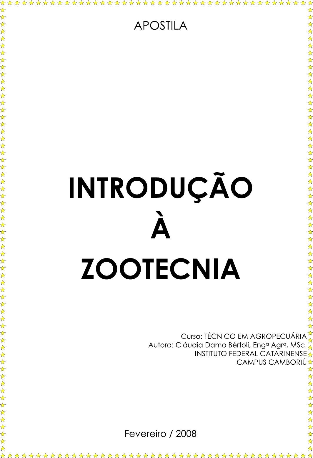 APOSTILA INTRODUÇÃO À ZOOTECNIA Curso: TÉCNICO EM AGROPECUÁRIA Autora: Cláudia Damo Bértoli, MSc. INSTITUTO FEDERAL CATARINENSE CAMPUS CAMBORIÚ Fevereiro / 20081. Declaração Universal dos Direitos dos Animais 03 2. Lei 9605/98 CAPÍTULO V Dos Crimes Contra o Meio Ambiente 04 3. Introdução à Zootecnia 06 4. Origem e Evolução 08 4.1 TEORIA DE LAMARCK 09 4.2 TEORIA DE DARWIN 10 4.3 TEORIA SINTÉTICA DA EVOLUÇÃO 11 5. Domesticação das Espécies 12 6. Classificação Zoológica das Espécies Domésticas 16 7. Utilização dos Animais Domésticos 17 7.1 CLASSIFICAÇÃO DAS FUNÇÕES PRODUTIVAS OU ZOOTÉCNICAS 18 7.2 ESPECIALIZAÇÃO DAS FUNÇÕES PRODUTIVAS OU ZOOTÉCNICAS 20 7.3 FUNÇÕES ZOOTÉCNICAS E A ESCOLHA DE REPRODUTORES 21 7.4 APTIDÃO E ESPECIALIZAÇÃO 21 8. Climatologia Zootécnica 22 9. o Sistema Digestório dos Animais Domésticos 24 9.1 ANATOMIA DO SISTEMA DIGESTÓRIO 25 9.2 FISIOLOGIA DO SISTEMA DIGESTÓRIO 26 9.3 SISTEMA DIGESTÓRIO DAS AVES 27 10. o Sistema Reprodutor dos Animais Domésticos 28 10.1 ANATOMIA DO SISTEMA REPRODUTOR FEMININO 28 10.2 FISIOLOGIA DO SISTEMA REPRODUTOR FEMININO 30 10.3 CICLO REPRODUTIVO DAS FÊMEAS MAMÍFERAS 31 10.4 ANATOMIA DO SISTEMA REPRODUTOR MASCULINO 31 10.5 FISIOLOGIA DO SISTEMA REPRODUTOR MASCULINO 33 10.6 SISTEMA REPRODUTOR DAS AVES 33 11. Os Sexos e a Neutralização Sexual 35 11.1 DIMORFISMO SEXUAL 35 11.2 OS CARACTERES SEXUAIS (SECUNDÁRIOS) 35 11.3 ORIGEM DOS CARACTERES SEXUAIS 37 11.4 MODIFICAÇÕES PROVOCADAS PELA CASTRAÇÃO 39 12. Raça e Suas Variações 41 12.1 CONCEITO DE RAÇA 41 12.2 SUB-RAÇA 43 12.3 VARIEDADE 44 12.4 FAMÍLIA E LINHAGEM 44 12.5 REBANHO 44 13. Melhoramento Genético Animal 45 13.1 MÉTODOS DE REPRODUÇÃO 46 13.2 METODOS DE MELHORAMENTO GENÉTICO 46 13.3 SISTEMAS DE 47 14. Etologia 51 15. Bibliografia 553 1. Declaração Universal dos Direitos dos Animais Aprovada pela UNESCO em sessão de janeiro de 1979, em Bruxelas. "Considerando que cada animal tem direitos; considerando que desconhecimento e o desprezo destes direitos levaram e continuam a levar homem a cometer crimes contra a natureza e contra animais; considerando que reconhecimento, por parte da espécie humana, do direito à existência das outras espécies animais constitui fundamento da coexistência das espécies no mundo; considerando que genocídios são perpetrados pelo homem e que outros ainda podem ocorrer; considerando que respeito pelos animais, por parte do homem, está ligado ao respeito dos homens entre si; considerando que a educação deve ensinar desde a infância a observar, compreender e respeitar animais; Proclama-se Art. 1 Todos animais nascem iguais diante da vida e têm mesmo direito à existência. Art. 2 a) Cada animal tem direito ao respeito. b) o homem, enquanto espécie animal, não pode atribuir-se direito de exterminar OS outros animais ou explorá-los, violando este direito. Ele tem dever de colocar a sua consciência a serviço de outros animais. c) Cada animal tem direito à consideração, à cura e à proteção do homem. Art. 3 a) Nenhum animal deverá ser submetido a maus tratos e a atos cruéis. b) Se a morte de um animal é necessária, deve ser instantânea, sem dor nem angústia. Art. 4 a) Cada animal, que pertence a uma espécie selvagem, tem o direito de viver livre no seu ambiente natural terrestre, aéreo ou aquático e tem o direito de reproduzir-se. b) A privação da liberdade, ainda que para fins educativos, é contrária a este direito. Art. 5 Cada animal pertencente a uma espécie que vive habitualmente no ambiente do homem tem direito de viver e crescer segundo ritmo e as condições de vida e de liberdade que são próprios da sua espécie. b) Toda modificação desse ritmo e destas condições, impostas pelo homem para fins mercantis, é contrária a este direito. Art. 6 a) Cada animal que homem escolher para companheiro tem direito a uma duração de vida conforme a sua natural longevidade. b) abandono de um animal é um ato cruel e degradante. Art. 7 Cada animal que trabalha, tem direito a uma razoável limitação do tempo e intensidade do trabalho, a uma alimentação adequada e ao repouso. Art. 8 a) A experimentação animal, que implica em sofrimento físico e psíquico é incompatível com direitos do animal, quer seja uma experiência médica, científica, comercial ou qualquer outra. b) As técnicas substitutivas devem ser utilizadas e desenvolvidas. Art. 9 No caso de o animal ser criado para servir de alimentação, deve ser nutrido, alojado, transportado e morto sem que para ele resulte ansiedade ou dor. Art. 10 a) Nenhum animal deve ser usado para divertimento do homem. b) A exibição dos animais e espetáculos que utilizam animais são incompatíveis com a dignidade do animal. Art. 11 ato que leva à morte de um animal, sem necessidade, é um biocídio, ou seja, um delito contra a vida.4 Art. 12 a) Cada ato, que leva à morte de um grande número de animais selvagens, é um genocídio, ou seja, um delito contra a espécie. b) aniquilamento e a destruição do ambiente natural levam a genocídio. Art. 13 a) animal morto deve ser tratado com respeito. b) As cenas de violência de que animais são vítimas devem ser proibidas no cinema e na televisão, a menos que tenham como fim mostrar um atentado ao direito do animal. Art. 14 a) As associações de proteção e de salvaguarda dos animais devem ser representadas a nível de governo. b) Os direitos do animal devem ser defendidos por leis, como direitos do homem." 2. Lei 9605/98 CAPÍTULO V Dos Crimes Contra Meio Ambiente Seção I Dos Crimes contra a Fauna Art. 29. Matar, perseguir, caçar, apanhar, utilizar espécimes da fauna silvestre, nativos ou em rota migratória, sem a devida permissão, licença ou autorização da autoridade competente, ou em desacordo com a obtida: Pena detenção de seis meses a um ano, e multa. § 1° Incorre nas mesmas penas: quem impede a procriação da fauna, sem licença, autorizaç