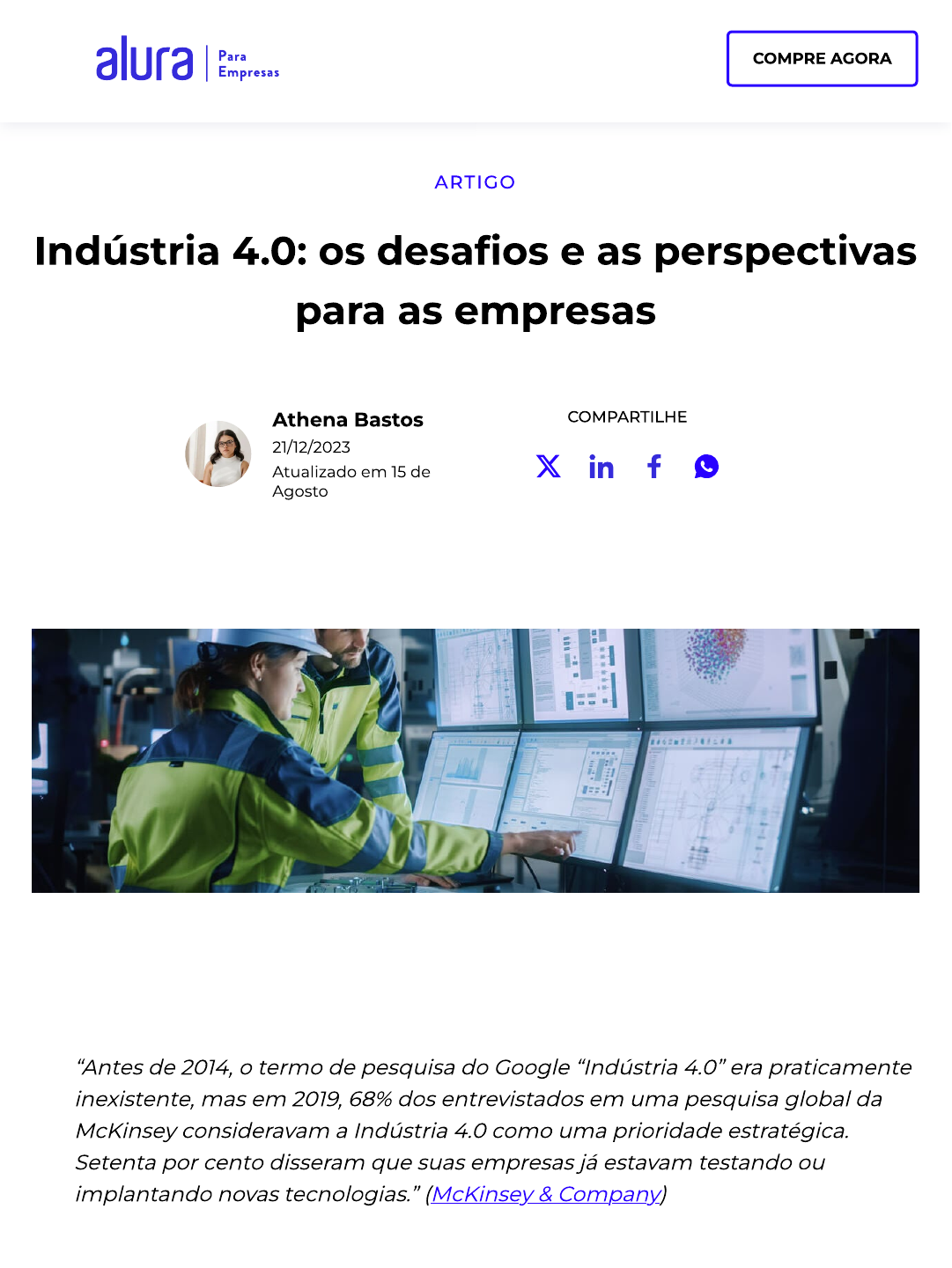 Com o avanço da tecnologia, as empresas têm encontrado maneiras cada vez mais inovadoras de aumentar a produtividade e eficiência. Na indústria, isso não é diferente. E a chamada Indústria 4.0 tem se destacado como uma forma de revolucionar os processos industriais. O termo, mais do que uma buzzword, representa um movimento de transformação. Indústria 4.0: os desafios e as perspectivas para as empresas | Alura https://www.alura.com.br/empresas/artigos/industria-4-0?srsltid=Afm... 1 of 12 10/16/2025, 12:04 PM https://twitter.com/share?url=https://www.alura.com.br/empresas/artigos/industria-4-0 https://twitter.com/share?url=https://www.alura.com.br/empresas/artigos/industria-4-0 https://linkedin.com/shareArticle?url=https://www.alura.com.br/empresas/artigos/industria-4-0 https://linkedin.com/shareArticle?url=https://www.alura.com.br/empresas/artigos/industria-4-0 https://facebook.com/share.php?u=https://www.alura.com.br/empresas/artigos/industria-4-0 https://facebook.com/share.php?u=https://www.alura.com.br/empresas/artigos/industria-4-0 https://api.whatsapp.com/send?text=https://www.alura.com.br/empresas/artigos/industria-4-0 https://api.whatsapp.com/send?text=https://www.alura.com.br/empresas/artigos/industria-4-0 https://www.mckinsey.com/featured-insights/mckinsey-explainers/what-are-industry-4-0-the-fourth-industrial-revolution-and-4ir https://www.mckinsey.com/featured-insights/mckinsey-explainers/what-are-industry-4-0-the-fourth-industrial-revolution-and-4ir https://www.alura.com.br/empresas https://www.alura.com.br/empresas https://cursos.alura.com.br/selfCheckout/load/cart https://cursos.alura.com.br/selfCheckout/load/cart https://wa.me/5511930060069?text=Ol%C3%A1!%20Vim%20do%20site%20e%20quero%20saber%20mais%20sobre%20a%20Alura%20Para%20Empresas. O objetivo deste artigo, portanto, é mostrar como o desenvolvimento em tecnologia também pode contribuir para sanar as dores da indústria, explicar o que é uma indústria 4.0, e como a tecnologia impacta a produtividade e a eficiência das empresas O conceito de indústria 4.0 surge com o movimento de uma 4ª Revolução Industrial, bastante conectada ao uso de tecnologia das funções mais básicas às mais avançadas do processo. Dessa maneira, o termo indústria 4.0 representa uma indústria que se utiliza do avanço tecnológico, da inovação, da e dos dados para impulsionar a produtividade e a eficiência operacional. No entanto, como bem aponta o artigo da , a tecnologia é apenas uma parte da Indústria 4.0. A outra metade depende da capacitação das pessoas para atuarem com a tecnologia e com os novos processos, através de estratégias de . Indústria 4.0: os desafios e as perspectivas para as empresas | Alura https://www.alura.com.br/empresas/artigos/industria-4-0?srsltid=Afm... 2 of 12 10/16/2025, 12:04 PM https://empresas.alura.com.br/cs/c/?cta_guid=70f72b5e-a467-41dc-880e-fd089b1951e3&signature=AAH58kFddoqn5GdVcENDo2cBR_ngIA8qhg&portal_id=21748317&placement_guid=bd063e61-24d8-412f-8600-b5a4235327bf&click=92d071e8-6c8a-4e74-a8c0-09bab589c0be&redirect_url=APefjpH2Wrmkc2xfGUgKaz4zjuV41N2NCaKSsuI3fhnJ1AMfTKIG25nh8nKC8VqptODKlYi0K6uwH0Axz2cyQXzuu7zj0K_SnjjE_p5LhQVU2FpurIeYIHxCw-Zj5BkBFWj1EwcA2u7IL9-duYVK6w49WaStdj2bRg&hsutk=&canon=https%3A%2F%2Fwww.alura.com.br%2Fempresas%2Fartigos%2Findustria-4-0&ts=1760630674301 https://empresas.alura.com.br/cs/c/?cta_guid=70f72b5e-a467-41dc-880e-fd089b1951e3&signature=AAH58kFddoqn5GdVcENDo2cBR_ngIA8qhg&portal_id=21748317&placement_guid=bd063e61-24d8-412f-8600-b5a4235327bf&click=92d071e8-6c8a-4e74-a8c0-09bab589c0be&redirect_url=APefjpH2Wrmkc2xfGUgKaz4zjuV41N2NCaKSsuI3fhnJ1AMfTKIG25nh8nKC8VqptODKlYi0K6uwH0Axz2cyQXzuu7zj0K_SnjjE_p5LhQVU2FpurIeYIHxCw-Zj5BkBFWj1EwcA2u7IL9-duYVK6w49WaStdj2bRg&hsutk=&canon=https%3A%2F%2Fwww.alura.com.br%2Fempresas%2Fartigos%2Findustria-4-0&ts=1760630674301 https://www.alura.com.br/empresas/artigos/automacao-de-processos https://www.alura.com.br/empresas/artigos/automacao-de-processos https://www.alura.com.br/empresas/artigos/gestao-de-risco https://www.alura.com.br/empresas/artigos/gestao-de-risco https://www.alura.com.br/empresas/artigos/business-intelligence-para-empresas https://www.alura.com.br/empresas/artigos/business-intelligence-para-empresas https://www.alura.com.br/empresas/artigos/business-intelligence-para-empresas https://www.alura.com.br/empresas/artigos/business-intelligence-para-empresas https://www.alura.com.br/empresas/artigos/gestao-de-ti https://www.alura.com.br/empresas/artigos/gestao-de-ti https://www.mckinsey.com/featured-insights/mckinsey-explainers/what-are-industry-4-0-the-fourth-industrial-revolution-and-4ir https://www.mckinsey.com/featured-insights/mckinsey-explainers/what-are-industry-4-0-the-fourth-industrial-revolution-and-4ir https://www.alura.com.br/empresas/artigos/reskilling-e-upskilling https://www.alura.com.br/empresas/artigos/reskilling-e-upskilling https://www.alura.com.br/empresas/artigos/reskilling-e-upskilling https://www.alura.com.br/empresas/artigos/reskilling-e-upskilling https://wa.me/5511930060069?text=Ol%C3%A1!%20Vim%20do%20site%20e%20quero%20saber%20mais%20sobre%20a%20Alura%20Para%20Empresas. Afinal de contas, a tecnologia é uma impulsionadora, mas precisa do potencial humano para ser bem aplicada aos processos. Maior eficiência, maior qualidade de produtos e maior segurança são algumas das vantagens da indústria 4.0. Apesar disso, a ampliação de uma indústria 4.0 ainda enfrenta desafios. Veja alguns deles: Um dos desafios é a inatividade de equipamentos, que pode prejudicar a produção e aumentar os custos. Por isso, quando falamos de indústria 4.0, é importante garantir que os equipamentos estejam sempre em bom estado e funcionando corretamente. Mas principalmente, que sejam os equipamentos adequados para os processos e resultados esperados. Equipamentos inadequados podem levar à perda de receita, ao atraso na produção e a perda de prazo. E esse tempo de inatividade não planejado custa 