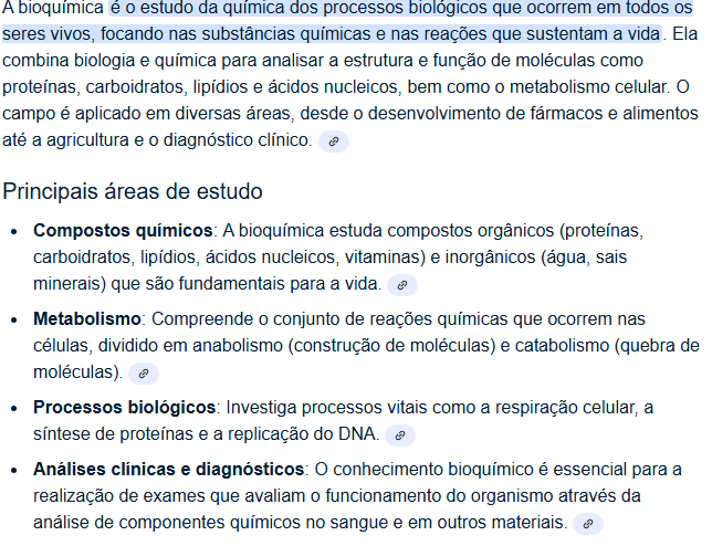 A bioquimica 0 estudo da quimica dos processos biológicos que ocorrem em todos os seres vivos, focando nas substâncias químicas e nas reações que sustentam a vida. Ela combina biologia e química para analisar a estrutura e função de moléculas como proteínas, carboidratos, lipídios e ácidos nucleicos, bem como 0 metabolismo celular. campo é aplicado em diversas áreas, desde 0 desenvolvimento de fármacos e alimentos até a agricultura e 0 diagnóstico clínico. Principais áreas de estudo Compostos A bioquímica estuda compostos orgânicos (proteínas, carboidratos, lipídios, ácidos nucleicos, vitaminas) e inorgânicos (água, sais minerais) que são fundamentais para a vida. Metabolismo: Compreende conjunto de reações químicas que ocorrem nas células, dividido em anabolismo (construção de moléculas) e catabolismo (quebra de moléculas). Processos biológicos: Investiga processos vitais como a respiração celular, a síntese de proteínas e a replicação do DNA. Análises clínicas e diagnósticos: 0 conhecimento bioquímico é essencial para a realização de exames que avaliam 0 funcionamento do organismo através da análise de componentes químicos no sangue e em outros materiais.