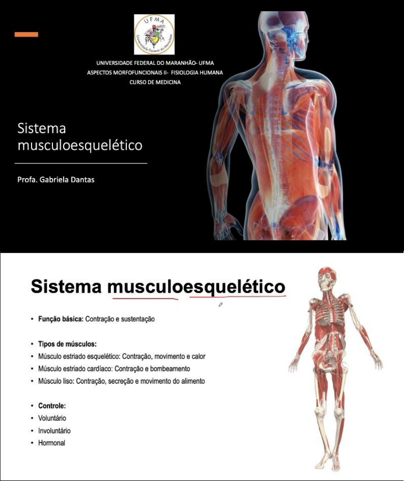 UFMA UNIVERSIDADE FEDERAL DO MARANHÃO- UFMA ASPECTOS MORFOFUNCIONAIS II- FISIOLOGIA HUMANA CURSO DE MEDICINA Sistema musculoesquelético Profa. Gabriela Dantas Sistema musculoesquelético Função básica: Contração e sustentação Tipos de músculos: Músculo estriado esquelético: Contração, movimento e calor Músculo estriado cardíaco: Contração e bombeamento Músculo liso: Contração, secreção e movimento do alimento Controle: Voluntário Involuntário HormonalTipos de músculos Comparação entre os 3 tipos de tecido muscular Característica Esquelético Liso Cardíaco Localização Ligado ao esqueleto Paredes do Paredes do estômago, coração intestino,... Tipos de controle Voluntário Involuntário Involuntário Formato das fibras Alongadas, Alongadas, Alongadas, extremidades cilíndricas, fibras extremidades rombas pontiagudas que ramificam Estriações Presentes Ausentes Presentes Número de núcleos Muitos Um Um ou dois por fibra Posição do núcleo Periférico Central Central Velocidade de A mais rápida Mais baixa Intermediária contração Habilidade para Menor Maior Intermediária permanecer contraída Contração muscular Guillaume Duchenne (1806-1875) Médico neurologista francês A contração muscular é precedida por evento elétrico (potencial de ação) qual é desencadeada pela ação do neurônio motor.Estímulos Controle Sistema Nervoso Central Sistema Nervoso Sistema Motor Sistema Autônomo Sistema Somático Endócrino Imune inervação inervação dupla Corrente única Parassimpática Simpática ÓRGÃOS VISCERAIS MÚSCULO ÓRGÃOS ALVOS Músculo liso ESQUELÉTICO Córtex da Supra-renal Músculo Gônadas, etc. Glândulas Controle involuntário Controle voluntário Controle involuntário Controle involuntárioControle Cell bodies in central Neurotransmitter Effector nervous system Peripheral nervous system at effector organs Effect Single neuron from CNS to effector organs SOMATIC NERVOUS SYSTEM ACh + Heavily myelinated axon Stimulatory Skeletal muscle Two-neuron chain from CNS to effector organs ACh NE Unmyelinated AUTONOMIC NERVOUS SYSTEM SYMPATHETIC Lightly myelinated Ganglion postganglionic axon preganglionic axons Epinephrine and ACh norepinephrine + Stimulatory or inhibitory, depending Adrenal medulla Blood vessel on neuro- transmitter and receptors PARASYMPATHETIC ACh ACh on effector Smooth muscle organs (e.g., in gut), glands, Lightly myelinated Unmyelinated cardiac muscle preganglionic axon Ganglion postganglionic axon Acetylcholine (ACh) Norepinephrine (NE) Tecido conjuntivoTecido conjuntivo TENDON LIGAMENT SKIN less parallel random parallel Tecido conjuntivo A função do tecido conjuntivo é manter as fibras musculares unidas, fazendo com que a força de contração individual atue no músculo inteiro e transmita para tendões, ligamentos e periósteo. muscular) ndão Fibro muscular Neurônic Vasos CapilarTipos de fibras musculares FIBRAS BRANCAS INTERMEDIÁRIAS TIPO lla Tipo I: Tipo II: Utilizam primeiro a via oxidativa aerobica (glicose e Vermelha; Branca; fosfocreatina); - Oxidativa; Glicosídica; Moderadamente resistente a fadiga Rica em mitocôndrias; - Pobre em mitocôndrias; FIBRAS BRANCAS TIPO llb ATP por fosforilação oxidativa ATP por glicólise Dependente exclusiva da glicolise Contração lenta Contração rápida Facil fadiga. Resistente à fadiga Não resistente à fadiga Músculo estriado esquelético 40% do peso corporal Associados ao esqueleto Propriedade contrátil Contração rápida e lenta Metabolismo aeróbico/ anaeróbico Diferenças interssexuais Termorregulação Neoglicogenese durante o jejum prolongadoMúsculo estriado esquelético Classificação quanto à função: Agonistas: músculos que atuam em conjunto ativamente para produzir um movimento desejado. Antagonistas: músculos que se opõem à ação dos agonistas. Quando o agonista se contrai, antagonista relaxa progressivamente, produzindo um movimento suave. Sinergistas: São aqueles que participam estabilizando as articulações para que não ocorram movimentos indesejáveis durante a ação principal. Fixadores: Estabilizam a origem do agonista de modo que ele possa agir mais eficientemente. Estabilizam a parte proximal do membro quando a parte distal se movimenta. Músculo estriado esquelético Fibra muscular: é uma célula cilíndrica e muito longa. Possui muitos núcleos pois é formada a partir da fusão de muitas células embrionárias. A fibra muscular não se multiplica (não sofre mitose) mas pode aumentar de tamanho (hipertrofia) caso seja constantemente solicitada como nos exercícios musculares. Dentro de cada fibra muscular há muitos feixes de miofilamentos feito de proteínas responsáveis pela contração muscular. músculo é formado de vários fascículos de fibras musculares e fica envolto por uma capa dura e resistente chamada aponeurose. Além das fibras musculares, no músculo há tecido conjuntivo, vasos sanguíneos, tecido adiposo e nervos.Músculo estriado esquelético Vasos sanguíneos Sarcolema Miofilamentos Músculo estriado esquelético Núcleo sarcoplasmático Filamento Grosso Filamento Fino Miofibrila Filamento Grosso Sarcolema Cisterna Filamento Fino Sarcolema Túbulos T sarcoplasmático Triade Túbulos TMÚSCULO ESQUELÉTICO é composto de Vasos Tecido conectivo Fascículos musculares Nervos sanguíneos são compostos por Fibras musculares (células) as quais contêm Sarcolema Túbulos T Sarcoplasma Múltiplos núcleos são uma funcionalmente continuação do ligados ao Retículo Grânulos Miofibrilas Mitocôndrias sarcoplasmático de glicogênio A Banda A Disco Z Disco Z SARCÔMERO UNIDADE BÁSICA DA MIOFIBRILA Linha M I Zona H (d) Fonte: SI Disco Disco 2 Linha M Pontes cruzadas da miosina M Filamentos grossos Filamentos - - A (e) Cabeças de Cauda da miosina Tropomiosina de actina G de miosina Cadeia de actina Fonte: SILVERTHORN (2010) Linha Z makeagif.comRetículo Miofibrilas sarcoplasmático compostas de Troponina Ac