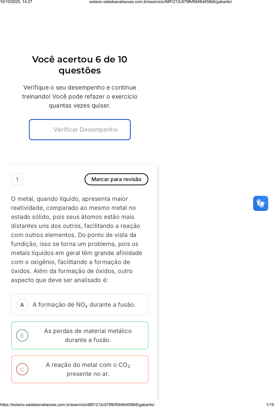 Você acertou 6 de 10 questões Verifique o seu desempenho e continue treinando! Você pode refazer o exercício quantas vezes quiser. Verificar Desempenho A B C 1 Marcar para revisão O metal, quando líquido, apresenta maior reatividade, comparado ao mesmo metal no estado sólido, pois seus átomos estão mais distantes uns dos outros, facilitando a reação com outros elementos. Do ponto de vista da fundição, isso se torna um problema, pois os metais líquidos em geral têm grande afinidade com o oxigênio, facilitando a formação de óxidos. Além da formação de óxidos, outro aspecto que deve ser analisado é: A formação de NO durante a fusão.x As perdas de material metálico durante a fusão. A reação do metal com o CO presente no ar. 2 16/10/2025, 14:27 estacio.saladeavaliacoes.com.br/exercicio/68f1212c579fbf5848d458b6/gabarito/ https://estacio.saladeavaliacoes.com.br/exercicio/68f1212c579fbf5848d458b6/gabarito/ 1/15 D E O desgaste do molde em função do choque térmico. A formação de água em função da umidade do ar. Resposta incorreta Opa! A alternativa correta é a letra B. Confira o gabarito comentado! Gabarito Comentado Na alternativa correta, é mencionado um aspecto importante a ser considerado durante a fusão de metais: as perdas de material metálico. Isso ocorre porque, durante a fusão, parte do metal pode evaporar ou reagir com outros elementos presentes, resultando em perda de material. Essa perda não só aumenta o custo do processo, como também pode afetar a qualidade do produto final. Portanto, é crucial minimizar essas perdas durante a fusão para garantir a eficiência e a qualidade do processo de fundição. 2 Marcar para revisão A fundição de precisão, também conhecida como cera perdida, é um processo utilizado para produzir peças metálicas de alta precisão dimensional e acabamento de superfície superior. No entanto, esse processo também apresenta algumas desvantagens. Entre as opções a seguir, qual é uma das desvantagens 16/10/2025, 14:27 estacio.saladeavaliacoes.com.br/exercicio/68f1212c579fbf5848d458b6/gabarito/ https://estacio.saladeavaliacoes.com.br/exercicio/68f1212c579fbf5848d458b6/gabarito/ 2/15 A B C D E do processo de fundição de precisão ou cera perdida? Investimento relativamente alto. Uso de produtos químicos à base de polímeros e/ou resinas. Geração de resíduos metálicos. Restrição a peças de grande porte. Necessidade de equipamentos especializados. Resposta correta Parabéns, você selecionou a alternativa correta. Confira o gabarito comentado! Gabarito Comentado Uma das desvantagens do processo de fundição de precisão ou cera perdida é o investimento relativamente alto necessário para sua implementação. Esse processo envolve a criação de moldes cerâmicos ou de cera que são utilizados para reproduzir com precisão o modelo da peça a ser fundida. O custo dos materiais utilizados nesse processo, como a cera especial para moldagem, os materiais cerâmicos e os revestimentos, pode ser elevado. Além disso, a fabricação e manutenção dos moldes, bem como o uso de equipamentos e maquinário especializados, também 16/10/2025, 14:27 estacio.saladeavaliacoes.com.br/exercicio/68f1212c579fbf5848d458b6/gabarito/ https://estacio.saladeavaliacoes.com.br/exercicio/68f1212c579fbf5848d458b6/gabarito/ 3/15 A B C D E contribuem para o investimento necessário na fundição de precisão. Embora o processo de fundição de precisão apresente essa desvantagem em relação ao custo, é amplamente utilizado em indústrias que demandam peças com alta precisão e qualidade, como aeroespacial, automotiva, médica e joalheria. 3 Marcar para revisão A fundição é um processo amplamente utilizado na indústria para produzir peças metálicas complexas. Diferentes processos de fundição são aplicados, dependendo dos requisitos da peça a ser fabricada. Qual dos processos de fabricação por fundição a seguir é adequado para a produção em larga escala de peças com alta precisão dimensional e acabamento de superfície superior? Moldagem em areia. Fundição de precisão. Moldes permanentes por gravidade. Fundição sob pressão. Fundição centrífuga. Resposta correta 16/10/2025, 14:27 estacio.saladeavaliacoes.com.br/exercicio/68f1212c579fbf5848d458b6/gabarito/ https://estacio.saladeavaliacoes.com.br/exercicio/68f1212c579fbf5848d458b6/gabarito/ 4/15 A B Parabéns, você selecionou a alternativa correta. Confira o gabarito comentado! Gabarito Comentado A fundição sob pressão, também conhecida como fundição por injeção, é o processo adequado para a produção em larga escala de peças com alta precisão dimensional e acabamento de superfície superior. Nesse processo, o metal líquido é forçado a entrar no molde sob alta pressão, resultando em peças com detalhes precisos e excelente qualidade de acabamento. A fundição sob pressão é amplamente utilizada na fabricação de peças automotivas, eletrodomésticos e componentes eletrônicos, onde a precisão e o acabamento são essenciais para o desempenho e a estética dos produtos. 4 Marcar para revisão Durante o processo de fundição, a presença de gases é um fenômeno comum que pode afetar a qualidade das peças fundidas. Esses gases podem surgir de diferentes fontes. Entre as opções a seguir, qual é uma das fontes dos gases que podem estar presentes durante o processo de fundição? Reação entre a resina utilizada no molde e o metal líquido. Ação dos agentes de separação utilizados na moldagem em areia. 16/10/2025, 14:27 estacio.saladeavaliacoes.com.br/exercicio/68f1212c579fbf5848d458b6/gabarito/ https://estacio.saladeavaliacoes.com.br/exercicio/68f1212c579fbf5848d458b6/gabarito/ 5/15 C D E Decomposição do material do núcleo durante a solidificação. Absorção de umidade pela areia de fundição. Geração de gases durante o resfriamento rápido da peça fundida. Resposta incorreta Opa! A alternativa correta é a letra C.