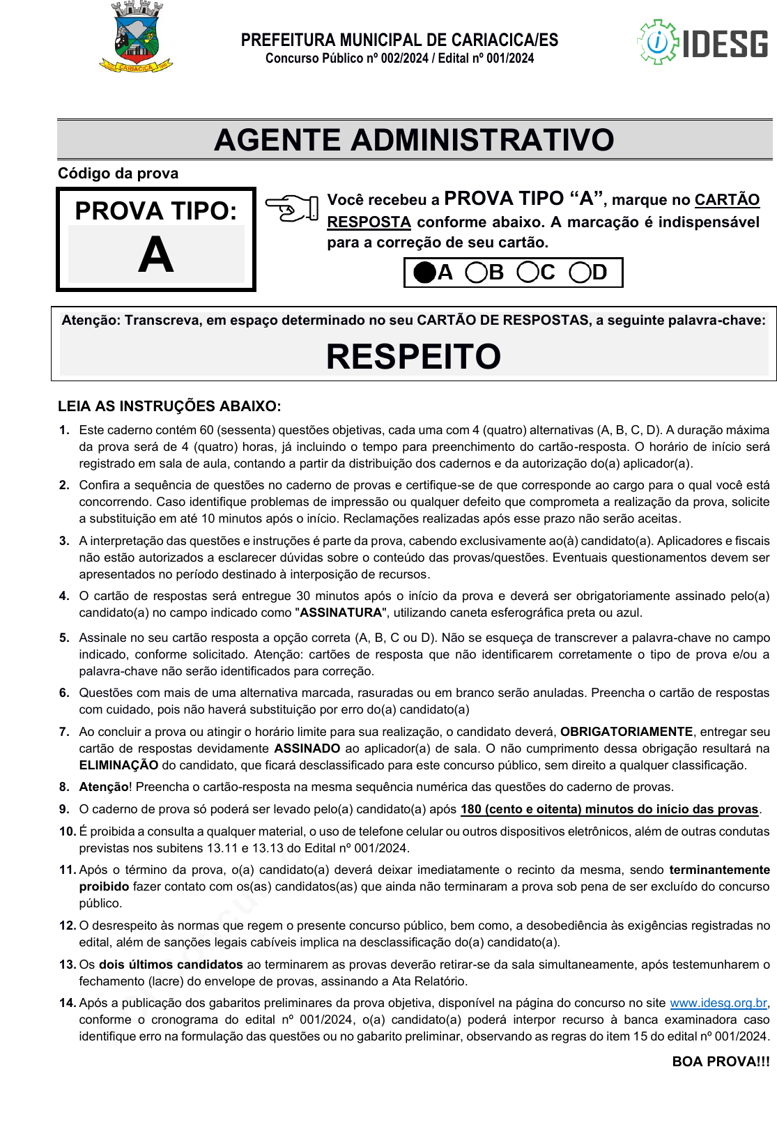 pcimarkpci MDAwMDowMDAwOjAwMDA6MDAwMDowMDAwOmZmZmY6MmRlNjoxMWIw:V2VkLCAxNyBTZXAgMjAyNSAxNzozNTozMCAtMDMwMA== www.pciconcursos.com.br PREFEITURA MUNICIPAL DE CARIACICA/ES Concurso Público nº 002/2024 / Edital nº 001/2024 PROVA TIPO: A Você recebeu a PROVA TIPO “A”, marque no CARTÃO RESPOSTA conforme abaixo. A marcação é indispensável para a correção de seu cartão. AGENTE ADMINISTRATIVO Código da prova LEIA AS INSTRUÇÕES ABAIXO: 1. Este caderno contém 60 (sessenta) questões objetivas, cada uma com 4 (quatro) alternativas (A, B, C, D). A duração máxima da prova será de 4 (quatro) horas, já incluindo o tempo para preenchimento do cartão-resposta. O horário de início será registrado em sala de aula, contando a partir da distribuição dos cadernos e da autorização do(a) aplicador(a). 2. Confira a sequência de questões no caderno de provas e certifique-se de que corresponde ao cargo para o qual você está concorrendo. Caso identifique problemas de impressão ou qualquer defeito que comprometa a realização da prova, solicite a substituição em até 10 minutos após o início. Reclamações realizadas após esse prazo não serão aceitas. 3. A interpretação das questões e instruções é parte da prova, cabendo exclusivamente ao(à) candidato(a). Aplicadores e fiscais não estão autorizados a esclarecer dúvidas sobre o conteúdo das provas/questões. Eventuais questionamentos devem ser apresentados no período destinado à interposição de recursos. 4. O cartão de respostas será entregue 30 minutos após o início da prova e deverá ser obrigatoriamente assinado pelo(a) candidato(a) no campo indicado como "ASSINATURA", utilizando caneta esferográfica preta ou azul. 5. Assinale no seu cartão resposta a opção correta (A, B, C ou D). Não se esqueça de transcrever a palavra-chave no campo indicado, conforme solicitado. Atenção: cartões de resposta que não identificarem corretamente o tipo de prova e/ou a palavra-chave não serão identificados para correção. 6. Questões com mais de uma alternativa marcada, rasuradas ou em branco serão anuladas. Preencha o cartão de respostas com cuidado, pois não haverá substituição por erro do(a) candidato(a) 7. Ao concluir a prova ou atingir o horário limite para sua realização, o candidato deverá, OBRIGATORIAMENTE, entregar seu cartão de respostas devidamente ASSINADO ao aplicador(a) de sala. O não cumprimento dessa obrigação resultará na ELIMINAÇÃO do candidato, que ficará desclassificado para este concurso público, sem direito a qualquer classificação. 8. Atenção! Preencha o cartão-resposta na mesma sequência numérica das questões do caderno de provas. 9. O caderno de prova só poderá ser levado pelo(a) candidato(a) após 180 (cento e oitenta) minutos do início das provas. 10. É proibida a consulta a qualquer material, o uso de telefone celular ou outros dispositivos eletrônicos, além de outras condutas previstas nos subitens 13.11 e 13.13 do Edital nº 001/2024. 11. Após o término da prova, o(a) candidato(a) deverá deixar imediatamente o recinto da mesma, sendo terminantemente proibido fazer contato com os(as) candidatos(as) que ainda não terminaram a prova sob pena de ser excluído do concurso público. 12. O desrespeito às normas que regem o presente concurso público, bem como, a desobediência às exigências registradas no edital, além de sanções legais cabíveis implica na desclassificação do(a) candidato(a). 13. Os dois últimos candidatos ao terminarem as provas deverão retirar-se da sala simultaneamente, após testemunharem o fechamento (lacre) do envelope de provas, assinando a Ata Relatório. 14. Após a publicação dos gabaritos preliminares da prova objetiva, disponível na página do concurso no site www.idesg.org.br, conforme o cronograma do edital nº 001/2024, o(a) candidato(a) poderá interpor recurso à banca examinadora caso identifique erro na formulação das questões ou no gabarito preliminar, observando as regras do item 15 do edital nº 001/2024. BOA PROVA!!! Atenção: Transcreva, em espaço determinado no seu CARTÃO DE RESPOSTAS, a seguinte palavra-chave: RESPEITO pcimarkpci MDAwMDowMDAwOjAwMDA6MDAwMDowMDAwOmZmZmY6MmRlNjoxMWIw:V2VkLCAxNyBTZXAgMjAyNSAxNzozNTozMCAtMDMwMA== www.pciconcursos.com.br PREFEITURA MUNICIPAL DE CARIACICA/ES - CONCURSO PÚBLICO Nº 002/2024 – QUADRO GERAL Página 2 de 19 ATENÇÃO!!! ▪ O CARTÃO DE RESPOSTAS ABAIXO É PARA SER UTILIZADO SOMENTE COMO RASCUNHO. ▪ AO RECEBER O CARTÃO DE RESPOSTAS DEFINITIVO, CONFIRA ATENTAMENTE OS DADOS DE IDENTIFICAÇÃO (NOME, CARGO E NÚMERO DE INSCRIÇÃO). EM SEGUIDA, ASSINE NO LOCAL INDICADO E MARQUE O TIPO DE CADERNO DE PROVAS QUE VOCÊ RECEBEU. ATENÇÃO: ▪ Transcreva a palavra-chave indicada em seu caderno de provas no local apropriado do cartão de respostas. ▪ O(a) candidato(a) deverá OBRIGATORIAMENTE, entregar seu cartão de repostas definitivo preenchido e ASSINADO, sob pena de ter seu cartão de respostas ANULADO. (item 12.14 do edital nº 001/2024). ▪ Preencha o cartão-resposta na mesma sequência numérica das questões do caderno de provas. pcimarkpci MDAwMDowMDAwOjAwMDA6MDAwMDowMDAwOmZmZmY6MmRlNjoxMWIw:V2VkLCAxNyBTZXAgMjAyNSAxNzozNTozMCAtMDMwMA== www.pciconcursos.com.br PREFEITURA MUNICIPAL DE CARIACICA/ES - CONCURSO PÚBLICO Nº 002/2024 – QUADRO GERAL Página 3 de 19 LÍNGUA PORTUGUESA O texto a seguir deve ser lido com atenção para responder às questões 01 a 10 Sobre a Paz A paz propõe, por um lado, o conflito e, por outro, a harmonia, como quem sobe uma escada 01/01/2025|LÚCIA HELENA GALVÃO — Professora, escritora, palestrante, compositora e professora de filosofia na Nova Acrópole Vivemos em um tempo em que frases, como respeito [à] diversidade, harmonia e paz, aparecem naquelas nuvens de palavras que mais circulam nos diálogos1 virtuais, algumas expressas em conceitos que se distanciam bem da origem dessas palavras. Sob a luz