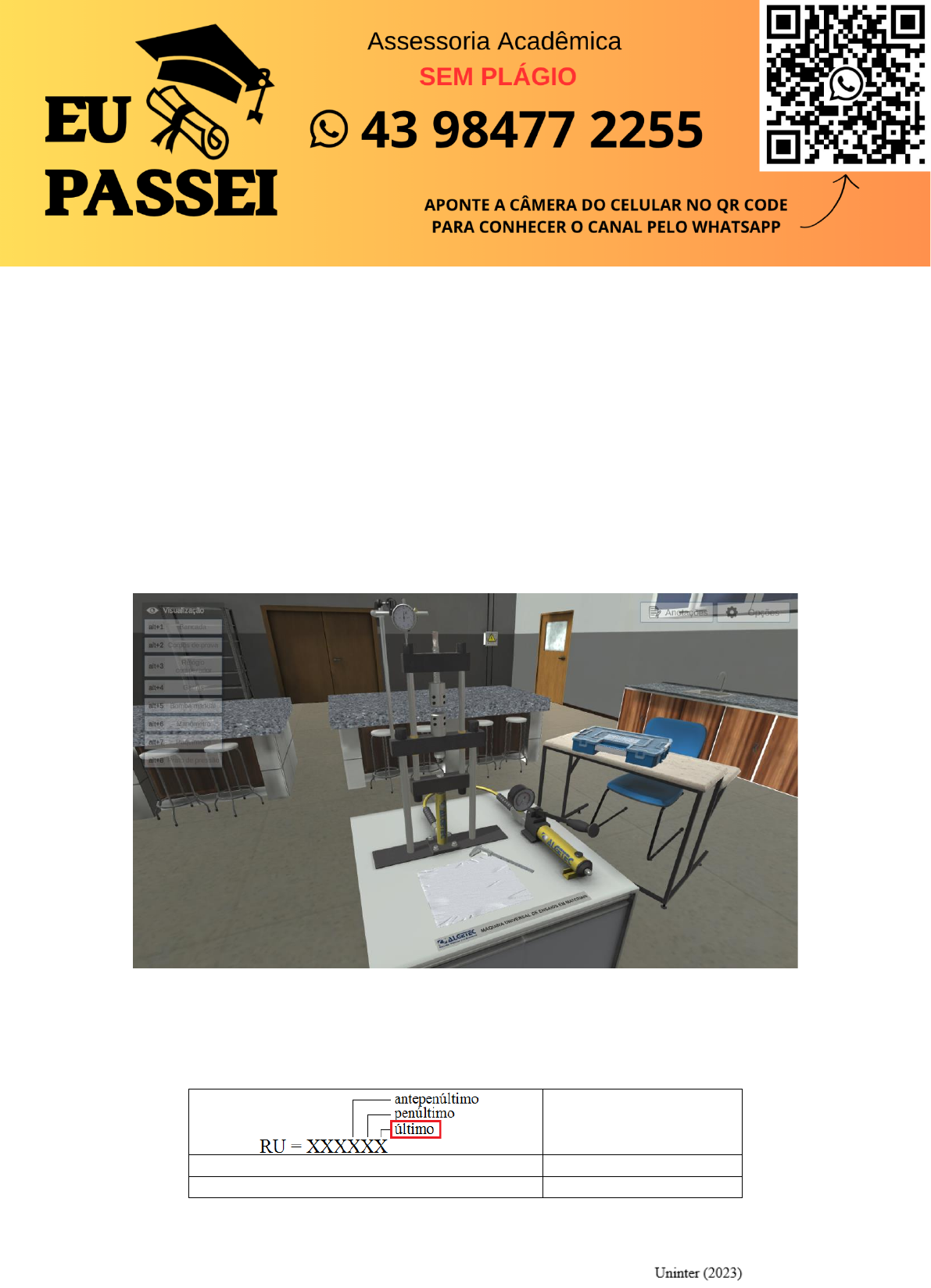 ATIVIDADE PRÁTICA DE RESISTÊNCIA DOS MATERIAIS ENSAIO DE TRAÇÃO Neste experimento você utilizará o laboratório virtual para realização do ensaio de tração e, assim, obter o diagrama tensão x deformação e, assim, determinar algumas propriedades mecânicas dos materiais, tais como: módulo de elasticidade, tensão limite de proporcionalidade, tensão última (limite de resistência à tração) e tensão de ruptura. Essas propriedades são muito importantes no projeto de estruturas. Fonte: Algetec, 2025. No seu experimento, você utilizará o material conforme o último número do seu RU associado à tabela abaixo: Material Se o último número do seu RU é 0 ou 1 Aço carbono A36 Se o último número do seu RU é 2 ou 3 ou 4 Alumínio 2024 Se o último número do seu RU é 5 ou 6 Titânio 6AI-4V Se o último número do seu RU é 7 ou 8 ou 9 Alumínio 6061 Para correção da sua atividade prática, as seguintes informações são necessárias: 1. Plotagem do diagrama tensão x deformação (Valor 45 pontos) 2. Tensão limite de proporcionalidade (Valor 5 pontos) = 3. Deformação limite proporcionalidade 4. Tensão limite resistência tração 5. Tensão de ruptura 6. Módulo de elasticidade 𝜎𝑙𝑝 = 𝐸𝜀𝑙𝑝 A segunda etapa é projetar uma haste considerando o material ensaiado, ou seja, considerando as propriedades que você obteve no seu diagrama tensão x deformação. Sabendo que agora a amostra tem um comprimento 𝑳𝒊 igual à soma dos três últimos dígitos do seu RU mais 80 mm (em mm) e diâmetro igual à soma dos dois últimos dígitos do seu RU mais 3 mm (em mm). Se uma carga axial 𝑭 igual ao último número do seu RU vezes 20 mais 200 N (em N) for aplicada a ela, determine o alongamento da amostra e a deformação transversal com a carga aplicada. Considere o diagrama de tensão e deformação que você obteve e 𝜈 = 0,3. Uninter (2023) 𝜎 = 𝐹 𝐴 𝜀𝑙 = 𝐿𝑓−𝐿𝑖 𝐿𝑖 = 𝛿 𝐿𝑖 e 𝜈 = − 𝜀𝑡 𝜀𝑙 Fonte: Adaptado de Callister; Rethwisch, 2018. De acordo com o Passei Direto (2025), o conteúdo apresenta um resumo e materiais que auxiliam no estudo de diversas disciplinas acadêmicas. Este documento é apresentado apenas como um modelo de estudo e referência, servindo para fins didáticos e acadêmicos. Este material foi elaborado com base no livro acervo de materiais disponíveis no SITE (PASSE IDIRETO, 2025), (Callister; Rethwisch, 2018), do site Algetec Laboratório Virtual, materiais da Uninter (2023) apoio da IA Google. Bard, integrando conhecimento teórico, institucional e tecnológico. REFERÊNCIA BIBLIOGRAFICA ALGETEC TECNOLOGIA INDÚSTRIA E COMÉRCIO LTDA. Algetec: Bancadas, Kits e Maletas Didáticas. Disponível em: https://www.algetec.com.br/ CALLISTER, W. D.; RETHWISCH, D. G. Ciência e Engenharia de Materiais: Uma Introdução. 10ª ed. Porto Alegre: AMGH, 2018. Google. Bard. Assistência na geração de informações e explicações técnicas. Disponível em: https://bard.google.com UNINTER. Modelo de material didático para estudo. Curitiba: UNINTER, 2023. PASSEI DIRETO. Acervo de materiais acadêmicos. Disponível em: https://www.passeidireto.com https://www.algetec.com.br/