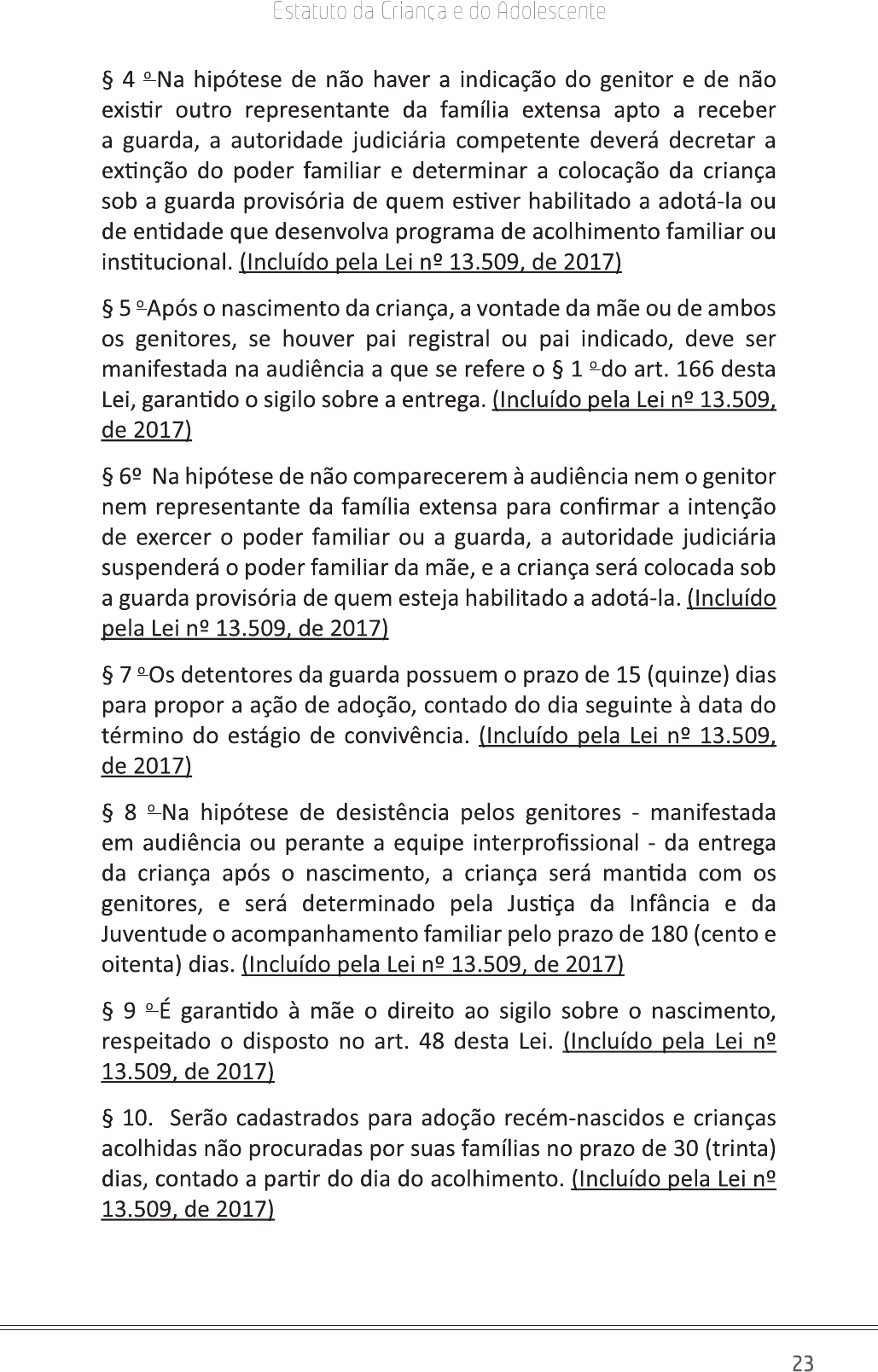 Estatuto da Criança e do Adolescente § 4 hipótese de não haver a indicação do genitor e de não existir outro representante da família extensa apto a receber a guarda, a autoridade judiciária competente deverá decretar a extinção do poder familiar e determinar a colocação da criança sob guarda provisória de quem estiver habilitado adotá-la ou de entidade que desenvolva programa de acolhimento familiar ou institucional. (Incluído pela Lei 13.509, de 2017) § 5 nascimento da criança, vontade da mãe ou de ambos os genitores, se houver pai registral ou pai indicado, deve ser manifestada na audiência a que se refere § 1 art. 166 desta Lei, garantido sigilo sobre a entrega. (Incluído pela Lei nº 13.509, de 2017) § Na hipótese de não comparecerem à audiência nem genitor nem representante da família extensa para confirmar a intenção de exercer poder familiar ou guarda, autoridade judiciária suspenderá poder familiar da mãe, e a criança será colocada sob a guarda provisória de quem esteja habilitado adotá-la. (Incluído pela Lei 13.509, de 2017) § 7 detentores da guarda possuem prazo de 15 (quinze) dias para propor a ação de adoção, contado do dia seguinte à data do término do estágio de convivência. (Incluído pela Lei 13.509, de 2017) § 8 hipótese de desistência pelos genitores manifestada em audiência ou perante a equipe interprofissional da entrega da criança após nascimento, criança será mantida com os genitores, e será determinado pela Justiça da Infância e da Juventude acompanhamento familiar pelo prazo de 180 (cento e oitenta) dias. (Incluído pela Lei 13.509, de 2017) § 9 garantido à mãe direito ao sigilo sobre nascimento, respeitado o disposto no art. 48 desta Lei. (Incluído pela Lei 13.509, de 2017) 10. Serão cadastrados para adoção recém-nascidos e crianças acolhidas não procuradas por suas famílias no prazo de 30 (trinta) dias, contado a partir do dia do acolhimento. (Incluído pela Lei 13.509, de 2017) 23Estatuto da Criança e do Adolescente Art. 19-B. A criança e adolescente em programa de acolhimento institucional ou familiar poderão participar de programa de apadrinhamento. (Incluído pela Lei 13.509, de 2017) § 1 apadrinhamento consiste em estabelecer e proporcionar à criança e ao adolescente vínculos externos à instituição para fins de convivência familiar e comunitária e colaboração com seu desenvolvimento nos aspectos social, moral, físico, cognitivo, educacional e financeiro. (Incluído pela Lei 13.509, de 2017) § Podem ser padrinhos ou madrinhas pessoas maiores de 18 (dezoito) anos não inscritas nos cadastros de adoção, desde que cumpram os requisitos exigidos pelo programa de apadrinhamento de que fazem parte. (Incluído pela Lei 13.509, de 2017) § 3 Pessoas jurídicas podem apadrinhar criança ou adolescente a fim de colaborar para seu desenvolvimento. (Incluído pela Lei 13.509, de 2017) § 4 perfil da criança ou do adolescente ser apadrinhado será definido no âmbito de cada programa de apadrinhamento, com prioridade para crianças ou adolescentes com remota possibilidade de reinserção familiar ou colocação em família adotiva. (Incluído pela Lei 13.509, de 2017) § 5 programas ou serviços de apadrinhamento apoiados pela Justiça da Infância e da Juventude poderão ser executados por órgãos públicos ou por organizações da sociedade civil. (Incluído pela Lei 13.509, de 2017) 6 ocorrer violação das regras de apadrinhamento, os responsáveis pelo programa e pelos serviços de acolhimento deverão imediatamente notificar autoridade judiciária competente. (Incluído pela Lei 13.509, de 2017) Art. 20. Os filhos, havidos ou não da relação do casamento, ou por adoção, terão os mesmos direitos e qualificações, proibidas quaisquer designações discriminatórias relativas à filiação. Art. 21. pátrio poder poder familiar será exercido, em igualdade de condições, pelo pai e pela mãe, na forma do que dispuser a legislação civil, assegurado a qualquer deles o direito de, em caso de discordância, recorrer à autoridade judiciária competente 24Estatuto da Criança e do Adolescente para a solução da divergência. (Expressão substituída pela Lei 12.010, de 2009) Vigência Art. 22. Aos pais incumbe dever de sustento, guarda e educação dos filhos menores, cabendo-lhes ainda, no interesse destes, a obrigação de cumprir e fazer cumprir as determinações judiciais. Parágrafo único. A mãe e pai, ou os responsáveis, têm direitos iguais e deveres e responsabilidades compartilhados no cuidado e na educação da criança, devendo ser resguardado direito de transmissão familiar de suas crenças e culturas, assegurados os direitos da criança estabelecidos nesta Lei. (Incluído pela Lei nº 13.257, de 2016) Art. 23. A falta ou a carência de recursos materiais não constitui motivo suficiente para a perda ou a suspensão do pátrio poder poder familiar (Expressão substituída pela Lei 12.010, de 2009) Vigência § 1 existindo outro motivo que por si só autorize a decretação da medida, criança ou adolescente será mantido em sua família de origem, a qual deverá obrigatoriamente ser incluída em serviços e programas oficiais de proteção, apoio e promoção. (Redação dada pela Lei 13.257, de 2016) § A condenação criminal do pai ou da mãe não implicará a destituição do poder familiar, exceto na hipótese de condenação por crime doloso sujeito à pena de reclusão contra outrem igualmente titular do mesmo poder familiar ou contra filho, filha ou outro descendente. (Redação dada pela Lei 13.715, de 2018) Art. 24. A perda e a suspensão do pátrio poder poder familiar serão decretadas judicialmente, em procedimento contraditório, nos casos previstos na legislação civil, bem como na hipótese de descumprimento injustificado dos deveres e obrigações a que alude art. 22. (Expressão substituída pela Lei 12.010, de 2009) Vigência Seção II