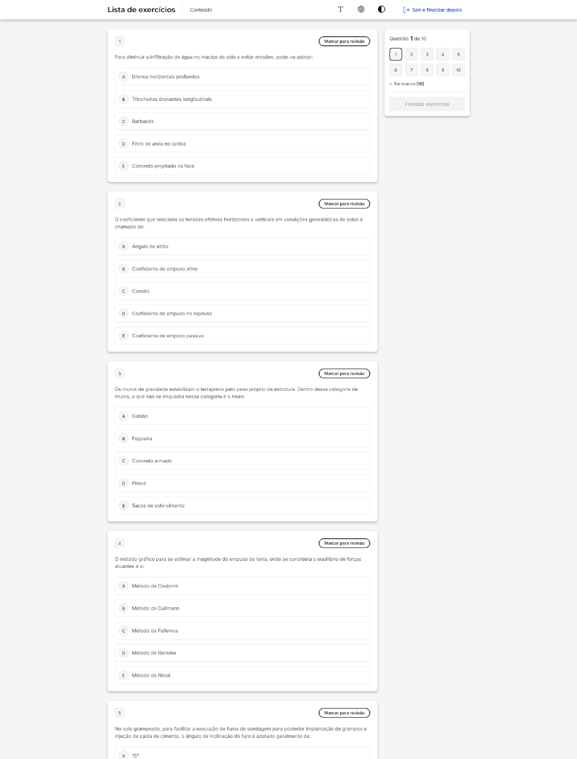 Lista de exercícios Conteúdo T Sair e finalizar depois Questão de 10 1 Marcar para revisão 1 2 3 4 5 Para diminuir a infiltração de água no maciço de solo e evitar erosões, pode-se adotar: 6 7 8 9 10 A Drenos horizontais profundos Em branco (10) Trincheiras drenantes longitudinais Finalizar exercícios C D Filtro de areia no tardoz E Concreto projetado na face 2 Marcar para revisão coeficiente que relaciona as tensões efetivas horizontais e verticais em condições geoestáticas de solos é chamado de: A Ângulo de atrito Coeficiente de empuxo ativo Coesão D Coeficiente de empuxo no repouso E Coeficiente de empuxo passivo 3 Marcar para revisão Os muros de gravidade estabilizam terrapleno pelo peso próprio da estrutura. Dentro dessa categoria de muros, que não se enquadra nessa categoria é muro: A Gabião Fogueira Concreto armado D Pneus E Sacos de solo-cimento 4 Marcar para revisão método gráfico para se estimar a magnitude do empuxo de terra, onde se considera equilíbrio de forças atuantes é A Método de Coulomb Método de Cullmann Método de Fellenius D Método de Rankine E Método de Rèsal 5 Marcar para revisão No solo grampeado, para facilitar a execução de furos de sondagem para posterior implantação de grampos e injeção de calda de cimento, ângulo de inclinação do furo é adotado geralmente de: A 15°45° 60° D 0° E 90° 6 Marcar para revisão Os muros de pneus surgiram da necessidade de reciclar material e obter estruturas mais sustentáveis, sem perder em resistência e capacidade de estabilização. Além da vantagem ambiental, outra vantagem que pode ser citada para este muro é a (o): A Rigidez Drenabilidade C Aplicável para alturas superiores a 10 metros D Vasto conhecimento científico acumulado E Facilidade executiva e alta resistência mecânica 7 Marcar para revisão Muros de flexão são estruturas em que seu corpo resiste às ações do terrapleno por meio da mobilização da flexão (tração e compressão). Quando esse muro deve ser construído em um solo de fundação de baixa competência, que não admite o apoio da base junto a este, pode ser adotada a técnica do muro: A De gravidade De arrimo Atirantado D Estaqueado E De solo reforçado 8 Marcar para revisão efeito da água em muros de contenções deve ser minimizado por meio de um projeto de drenagem eficiente. Este efeito pode ser: A Direto, quando reduz a resistência ao cisalhamento do solo do terrapleno Direto, quando aumenta a poro-pressão no terrapleno Indireto, quando diminui a poro-pressão no terrapleno D Indireto, quando dispositivos de drenagem superficial são insuficientes para escoar a água E Direto, quando satura terrapleno e aumenta a componente de empuxo 9 Marcar para revisão Muros de gravidade são muros onde a estabilidade da estrutura e do terrapleno é garantida pelo peso próprio do muro. Outro nome muito comumente utilizado na engenharia para esses muros é: A Muro de flexão Muro de arrimo C Muro de solo reforçado D Muro atirantadoE Solo grampeado 10 Marcar para revisão A nomenclatura técnica adotada para se referir ao solo contido e estabilizado por um muro de contenção é (a): A Corpo B Base C Tardoz D Terrapleno E Fundação