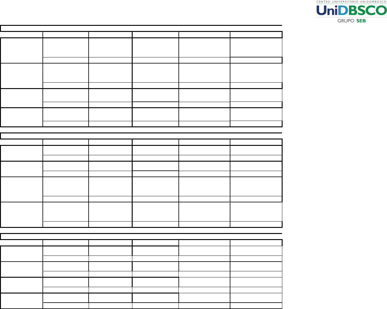 Curso de Psicologia UNIDOMBOSCO - Grade 2025/2 - Noite Segunda - feira Terça - Feira Quarta - Feira Quinta Feira Sexta - Feira História da Psicologia – 80h P História da Psicologia – 80h P Projeto Integrado de Extensão II: Criança e Adolescente – 80h (PIEX, 40h p) Desenvolvimento Humano – 80h P Saúde Coletiva – 40h - EaD SALA 1 E 2B SALA 1 E 2B SALA 1 E 2B SALA 1 E 2B EaD História da Psicologia – 80h P História da Psicologia – 80h P Projeto Integrado de Extensão II: Criança e Adolescente – 80h (PIEX, 40h p) Desenvolvimento Humano – 80h P Saúde Coletiva – 40h - EaD SALA 1 E 2B SALA 1 E 2B SALA 1 E 2B SALA 1 E 2B EaD Desenvolvimento Humano – 80h P Processos Psicológicos – 80h P Processos Psicológicos – 80h P Produção Acadêmica e de Pesquisa (eixo transversal obrigatório) 40h - EaD SALA 1 E 2B SALA 1 E 2B SALA 1 E 2B EaD Desenvolvimento Humano – 80h P Processos Psicológicos – 80h P Processos Psicológicos – 80h P Produção Acadêmica e de Pesquisa (eixo transversal obrigatório) 40h - EaD SALA 1 E 2B SALA 1 E 2B SALA 1 E 2B EaD Segunda - feira Terça - Feira Quarta - Feira Quinta Feira Sexta - Feira Neuropsicologia 60h P Psicologia Histórico- Cultural 40h P Psicologia e Saúde 80h p Humanista-Existencial I 60h P SALA 22 E 23E SALA 22 E 23E SALA 22 E 23E SALA 22 E 23E Neuropsicologia 60h P Psicologia Histórico- Cultural 40h P Psicologia e Saúde 80h p Humanista-Existencial I 60h P SALA 22 E 23E SALA 22 E 23E SALA 22 E 23E SALA 22 E 23E Neuropsicologia 60h P Projeto Integrado de Extensão IV: Saúde mental 80h (PIEX, 40h p) Avaliação Psicológica I 40h P Humanista-Existencial I 60h P SALA 22 E 23E SALA 22 E 23E SALA 22 E 23E SALA 22 E 23E Psicofarmacologia 40h - EaD Projeto Integrado de Extensão IV: Saúde mental 80h (PIEX, 40h p) Avaliação Psicológica I 40h P Psicofarmacologia 40h - EaD EaD SALA 22 E 23E SALA 22 E 23E EaD Horário Segunda - feira Terça - Feira Quarta - Feira Quinta Feira Sexta - Feira Psicologia Social 80p Técnicas de avaliação psicodiagnóstica 80 p Avaliação Psicológica II 40 p Psicologia e a Pessoa com Deficiência - EaD Ética Profissional - EaD SALA 7D SALA 7D SALA 7D EaD EaD Psicologia Social 80p Técnicas de avaliação psicodiagnóstica 80 p Avaliação Psicológica II 40 p Psicologia e a Pessoa com Deficiência - EaD Ética Profissional - EaD SALA 7D SALA 7D SALA 7D EaD EaD Psicologia Social 80p Psicologia e Políticas Públicas 40p Técnicas de avaliação psicodiagnóstica 80 p Coleta e análise de dados 40h p Epidemiologia e bioestatística - EaD SALA 7D SALA 7D SALA 7D EaD EaD Psicologia Social 80p Psicologia e Políticas Públicas 40p Técnicas de avaliação psicodiagnóstica 80 p Coleta e análise de dados 40h p Epidemiologia e bioestatística - EaD SALA 7D SALA 7D SALA 7D EaD EaD 19:00 às 19:50 19:50 às 20:40 21:00 às 21:50 21:50 às 22:40 6° módulo - Matriz 2023 4º Período - Matriz 2023 19:00 às 19:50 19:50 às 20:40 21:00 às 21:50 21:50 às 22:40 21:00 às 21:50 21:50 às 22:40 19:00 às 19:50 19:50 às 20:40 2º Período - Matriz 2023 Segunda - feira Terça - Feira Quarta - Feira Quinta Feira Sexta - Feira Psicodiagnóstico 80h P Psicologia e Comunidade 80h P Ab. Cognitivo- Comportamental: Técnicas e Aplicações 40 P Pesquisa em Psicologia B 40 P Ética 40h p SALA 5 E 6B SALA 5 E 6B SALA 5 E 6B SALA 5 E 6B SALA 5 E 6B Psicodiagnóstico 80h P Psicologia e Comunidade 80h P Ab. Cognitivo- Comportamental: Técnicas e Aplicações 40 P Pesquisa em Psicologia B 40 P Ética 40h p SALA 5 E 6B SALA 5 E 6B SALA 5 E 6B SALA 5 E 6B SALA 5 E 6B Ab. Psicanalítica: Técnicas e Aplicações 40h P Ab. Analítica: Técnicas e Aplicações 40h P Eletiva C 40h EaD Psicologia e Comunidade 80h P Psicodiagnóstico 80h P SALA 5 E 6B SALA 5 E 6B EaD SALA 5 E 6B SALA 5 E 6B Ab. Psicanalítica: Técnicas e Aplicações 40h P Ab. Analítica: Técnicas e Aplicações 40h P Eletiva C 40h EaD Psicologia e Comunidade 80h P Psicodiagnóstico 80h P SALA 5 E 6B SALA 5 E 6B EaD SALA 5 E 6B SALA 5 E 6B Segunda - feira Terça - Feira Quarta - Feira Quinta Feira Sexta - Feira Seminário de Práticas em Ênfase A 40h P Estágio de Práticas Clínicas A 120h P Estágio de Práticas Clínicas A 120h P Estágio de Ênfase A 120h P Estágio de Ênfase A 120h P AUDITÓRIO C Vários Professores Vários Professores Vários Professores Vários Professores Seminário de Práticas em Ênfase A 40h P Estágio de Práticas Clínicas A 120h P Estágio de Práticas Clínicas A 120h P Estágio de Ênfase A 120h P Estágio de Ênfase A 120h P AUDITÓRIO C Vários Professores Vários Professores Vários Professores Vários Professores Eletiva de Ênfase A 40h EaD Estágio de Práticas Clínicas A 120h P Estágio de Ênfase A 120h P Estágio de Ênfase A 120h P Estágio de Ênfase A 120h P EaD Vários Professores Vários Professores Vários Professores Vários Professores Eletiva de Ênfase A 40h EaD Estágio de Práticas Clínicas A 120h P Estágio de Ênfase A 120h P Estágio de Ênfase A 120h P Estágio de Ênfase A 120h P EaD Vários Professores Vários Professores Vários Professores Vários Professores Segunda - feira Terça - Feira Quarta - Feira Quinta Feira Sexta - Feira Seminário de Práticas em Ênfase B 40h P Estágio de Práticas Clínicas B 120h P Estágio de Práticas Clínicas B 120h P Estágio de Ênfase B 120h P Estágio de Ênfase B 120h P AUDITÓRIO C Vários Professores Vários Professores Vários Professores Vários Professores Seminário de Práticas em Ênfase B 40h P Estágio de Práticas Clínicas B 120h P Estágio de Práticas Clínicas B 120h P Estágio de Ênfase B 120h P Estágio de Ênfase B 120h P AUDITÓRIO C Vários Professores Vários Professores Vários Professores Vários Professores Eletiva de Ênfase B 40h EaD Estágio de Práticas Clínicas B 120h P Estágio de Ênfase B 120h P Estágio de Ênfase B 120h P Estágio de Ênfase B 120h P EaD Vários Professores Professor Professor Vários Professor