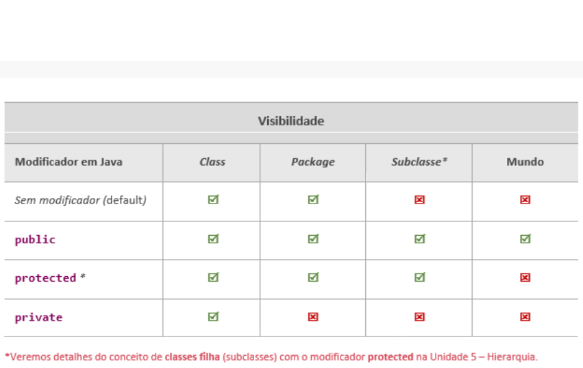 Fundamentos da Programação Orientada a Objetos Figura 2 – Visibilidade x modificadores de acesso 1. Analise o código em Java apresentado a seguir. 1 package P2; 2 3 public class Lampada { 4 private boolean ligada; 5 private String tipo; 6 private int cor; 7 8 public Lampada (String tipo, int cor) { 9 this.ligada = false; 10 this.tipo = tipo; 11 this.cor = cor; 12 } 13 14 public void acende () { 15 this.ligada = true; 16 } 17 18 public void apaga () { 19 this.ligada = false; 20 } 21 22 public String estadoLampada() { 23 String ret = ""; 24 if (this.ligada) 25 ret += "ligada"; 26 else 27 ret += "desligada"; 28 if (this.cor == 1) 29 ret += ", luz branca"; 30 else if (this.cor == 2) 31 ret += ", luz verde"; 32 else 33 ret += ", luz vermelha"; 34 ret += ", tipo " + this.tipo; 35 return ret; 36 } 37 } 1 package P2; 2 public class Casa { 3 Lampada lampA; 4 Lampada lampB; 5 Lampada lampC; 6 7 public static void main(String[] args) { 8 int cor1 = 1; 9 int cor2 = 2; 10 int cor3 = 3; 11 12 Casa minhaCasa = new Casa(); 13 minhaCasa.lampA = new Lampada("incandescente", cor3); 14 minhaCasa.lampB = new Lampada("LED", cor1); 15 minhaCasa.lampC = new Lampada("fluorescente", cor2); 16 17 minhaCasa.lampA.acende(); 18 minhaCasa.lampC.acende(); 19 System.out.println("Lamp1 " + minhaCasa.lampB.estadoLampada()); 20 System.out.println("Lamp2 " + minhaCasa.lampC.estadoLampada()); 21 System.out.println("Lamp3 " + minhaCasa.lampA.estadoLampada()); 22 } 23 } De acordo com o código, assinale a alternativa a seguir que representa corretamente o que aparece na tela de console ao final da execução do programa. E) Gabarito da questão Lamp1 desligada, luz branca, tipo LED Lamp2 ligada, luz verde, tipo fluorescente Lamp3 ligada, luz vermelha, tipo incandescente. Feedback: De acordo com a sequência de comandos do programa, nas linhas 13, 14 e 15 do código da classe Casa, temos os atributos das lâmpadas com os seguintes tipos e cores: minhaCasa.lampA = new Lampada("incandescente", cor3); minhaCasa.lampB = new Lampada("LED", cor1); minhaCasa.lampC = new Lampada("fluorescente", cor2); Além disso, de acordo com as linhas 17 e 18 do código da classe casa, apenas as lâmpadas minhaCasa.lampA e minhaCasa.lampC estão acesas. Logo, os comandos para imprimir: System.out.println("Lamp1 " + minhaCasa.lampB.estadoLampada()); System.out.println("Lamp2 " + minhaCasa.lampC.estadoLampada()); System.out.println("Lamp3 " + minhaCasa.lampA.estadoLampada()); Apresentam na tela de console o seguinte conteúdo: Lamp1 desligada, luz branca, tipo LED é a lampB Lamp2 ligada, luz verde, tipo fluorescente é a lampC Lamp3 ligada, luz vermelha, tipo incandescente é a lampA. 2. Um website de uma loja disponibiliza inúmeros produtos para a venda. O fragmento de código a seguir apresenta a declaração da classe CarrinhoDeCompras desse sistema. 1 public class CarrinhoDeCompras { 2 private Cliente c; 3 private Produto[] produtos = new Produto[20]; 4 5 } Considerando o fragmento apresentado, assinale a alternativa correta a seguir. C) Gabarito da questão Seria melhor substituir o vetor de produtos por um ArrayList, uma vez que não se sabe quantos produtos podem ser incluídos no carrinho. Feedback: JUSTIFICATIVA DA RESPOSTA CORRETA* Uma das grandes características dos vetores é que ele possui tamanho fixo, no caso do vetor apresentado, 20 elementos (Produto[20]). Isso significa que o sistema não permitirá a adição de mais de 20 elementos no carrinho. Como é impossível saber de antemão quantos elementos um usuário do sistema poderá incluir em sua compra, o ideal é substituir essa estrutura pela classe ArrayList, que é dinâmica, ou seja, aumenta de tamanho conforme a necessidade. 3. Considere os blocos try...catch...finally a seguir. try { System.out.print("A"); try { System.out.print("B"); throw new Exception("Olá!"); } catch (RuntimeException e) { System.out.print("C"); } catch (Exception e) { System.out.print("D"); if (true) return; } finally { System.out.print("E"); } System.out.print("F"); } finally { System.out.print("G"); } System.out.println("H"); Com base no código apresentado, assinale a alternativa correta. B) Gabarito da questão O código imprime ABDEG. Feedback: JUSTIFICATIVA DA RESPOSTA CORRETA* Analisemos o código passo a passo a seguir. 1. Inicialmente, o código roda o comando System.out.print("A"), imprimindo A. 2. Em seguida, a linha System.out.print("B") é executada, imprimindo B. 3. A linha throw new Exception("Olá!"); executa em seguida, disparando a exceção. Isso desvia o código para o catch de Exception. 4. O código System.out.print("D"); é executado, imprimindo D. 5. Em seguida, a linha if (true) return; executa, forçando o método a sair da função. 6. Porém, antes de sair, o bloco finally mais interno é executado, imprimindo E. 7. E em seguida, o bloco finally mais externo é executado, imprimindo G. Portanto: ABDEG. 4. Os comandos condicionais, ou de desvio, permitem alterar o fluxo de execução de um código, dependendo do resultado de uma condição, que pode ser verdadeira ou falsa. Verifique como é utilizado o condicional do código Java a seguir. 1 package P1; 2 3 public class Main { 4 public static void main(String[] args) { 5 int a = -2; 6 int b = 5; 7 int c; 8 9 if (a b ? 2 - a : -5 * b); 11 } else { 12 c = a + b; 13 } 14 15 System.out.println("fim = " + c); 16 } 17 } O que aparecerá impresso após a execução? Assinale a alternativa correta. Alternativas A) Gabarito da questão Fim = -25 Feedback: JUSTIFICATIVA DA RESPOSTA CORRETA* O primeiro comando de decisão if (a b ? 2-a : -5*b); que atribui seu resultado a c. 5. O código a seguir descreve uma situação de uso de herança. Analise-o com atenção. class A { void print1() { System.out.println("A"); } void print2() { System.out.println("A2"); } void printAll() { print1(); print2(); } } class B extends A { void print2() { System.out.println("B"); } } public class C extends B { void print1() { System.out.println("C"