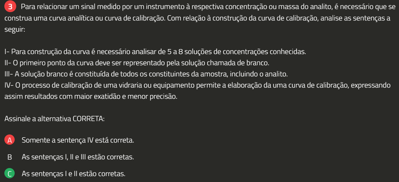 3 Para relacionar um sinal medido por um instrumento à respectiva concentração ou massa do analito, é necessário que se construa uma curva analítica ou curva de calibração. Com relação à construção da curva de calibração, analise as sentenças a seguir: I- Para construção da curva é necessário analisar de 5 a 8 soluções de concentrações conhecidas. II- 0 primeiro ponto da curva deve ser representado pela solução chamada de branco. III- A solução branco é constituída de todos constituintes da amostra, incluindo 0 analito. IV- processo de calibração de uma vidraria ou equipamento permite a elaboração da uma curva de calibração, expressando assim resultados com maior exatidão e menor precisão. Assinale a alternativa CORRETA: A Somente a sentença IV está correta. As sentenças I, e III estão corretas. As sentenças I e estão corretas.