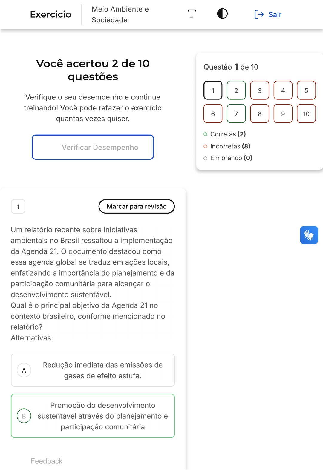<p>Meio Ambiente e Exercicio T Sair Sociedade Você acertou 2 de 10 Questão 1 de 10 questões 1 2 3 4 5 Verifique o seu desempenho e continue treinando! Você pode refazer o exercício 6 7 8 9 10 quantas vezes quiser. Corretas (2) Verificar Desempenho Incorretas (8) Em branco (0) 1 Marcar para revisão Um relatório recente sobre iniciativas ambientais no Brasil ressaltou a implementação da Agenda 21. O documento destacou como essa agenda global se traduz em ações locais, enfatizando a importância do planejamento e da participação comunitária para alcançar o desenvolvimento Qual é o principal objetivo da Agenda 21 no contexto brasileiro, conforme mencionado no relatório? Alternativas: Redução imediata das emissões de A gases de efeito estufa. Promoção do desenvolvimento B sustentável através do planejamento e participação comunitária Feedback</p><p>Aumento da exportação de produtos C orgânicos Proibição total de desmatamento em D todas as regiões Foco exclusivo na geração de energia E renovável X Resposta incorreta Opa! A alternativa correta é a letra B. Confira o gabarito comentado! Gabarito Comentado A Agenda 21 no Brasil visa promover o desenvolvimento sustentável, enfatizando a importância do planejamento estratégico e da participação comunitária. Este enfoque busca um equilíbrio entre crescimento econômico, conservação ambiental e bem-estar social 2 Marcar para revisão Um pequeno município na Mata Atlântica está experimentando rápido crescimento urbano. O plano diretor local precisa ser revisado, levando em conta a conservação da biodiversidade endêmica da região. Qual estratégia o plano diretor deve priorizar para conciliar crescimento urbano com a conservação da biodiversidade?</p><p>Expandir as zonas urbanas sem A restrições. Criar corredores ecológicos entre B áreas urbanas. Priorizar a construção de C infraestrutura industrial. Remover áreas de preservação para D novas moradias. Incentivar o turismo em áreas de E conservação. Resposta correta Parabéns, você selecionou a alternativa correta. Confira o gabarito comentado! Gabarito Comentado A estratégia de criar corredores ecológicos é a mais acertada, pois permite a movimentação de espécies entre áreas verdes, minimizando o impacto do crescimento urbano sobre a biodiversidade e mantendo a conectividade entre habitats, crucial para a preservação de espécies endêmicas. 3 Marcar para revisão A exploração desenfreada de recursos naturais na região do Cerrado tem levado ao</p><p>esgotamento de espécies vegetais, muitas delas com potencial medicinal ainda não explorado cientificamente. Marque a alternativa que apresenta o impacto da exploração no potencial medicinal do Cerrado. Expansão da medicina alternativa A local. Descoberta acelerada de novos B medicamentos. Perda de princípios ativos C desconhecidos. Fortalecimento da biodiversidade D local. Aumento da resistência a doenças E endêmicas. X Resposta incorreta Opa! A alternativa correta é a letra C. Confira o gabarito comentado! Gabarito Comentado A exploração excessiva leva à perda de espécies antes mesmo de serem estudadas, o que implica na perda de princípios ativos desconhecidos com potenciais medicinais, e não na expansão da medicina alternativa, descoberta de medicamentos, fortalecimento da</p><p>biodiversidade ou aumento da resistência a doenças. 4 Marcar para revisão A ECO-92 foi um encontro realizado no Rio de Janeiro com o objetivo de promover o desenvolvimento sustentável. Entre seus frutos, está o programa Agenda 21. Marque a assertiva que descreve corretamente o que foi a Agenda 21. A Agenda 21 foi um tratado internacional em que foi determinada a proibição de utilização de A combustíveis fósseis por 21 anos, buscando diminuir o aquecimento global. A Agenda 21 foi um tratado internacional, cujo principal objetivo B era desenvolver somente a igualdade social. A Agenda 21 foi um tratado internacional sobre desenvolvimento C sustentável, do qual o Brasil não participou.</p><p>A Agenda 21 foi um tratado internacional no qual a sociedade civil D se comprometeu a reduzir os desperdícios. A Agenda 21 foi um tratado internacional no qual cada país participante se comprometeu a refletir, E planejar e implementar medidas sustentáveis que passariam a pautar seu desenvolvimento econômico. X Resposta incorreta Opa! A alternativa correta é a letra E. Confira o gabarito comentado! Gabarito Comentado A Agenda 21, fruto da ECO-92, foi um tratado internacional que envolveu a participação de diversos países, incluindo o Brasil. Cada país participante se comprometeu a refletir, planejar e implementar medidas sustentáveis que passariam a pautar seu desenvolvimento econômico. Portanto, a alternativa correta é a letra E: "A Agenda 21 foi um tratado internacional no qual cada país participante se comprometeu a refletir, planejar e implementar medidas sustentáveis que passariam a pautar seu desenvolvimento econômico". 5 Marcar para revisão A expansão urbana acelerada provoca transformações significativas no meio</p><p>ambiente. Uma cidade planeja aumentar sua área urbana, o que implicará em mudanças na paisagem. Marque a alternativa que apresenta o impacto ambiental direto da expansão urbana. A Aumento do ecoturismo na região. B Diminuição da biodiversidade local. C Melhoria na qualidade do ar. D Redução dos níveis de ruído. Crescimento na produção agrícola E local. X Resposta incorreta Opa! A alternativa correta é a letra B. Confira o gabarito comentado! Gabarito Comentado A expansão urbana geralmente leva à redução da biodiversidade local devido à destruição de habitats naturais para dar lugar à construção de infraestrutura. As demais alternativas não correspondem a impactos diretos desse tipo de atividade, sendo a diminuição da biodiversidade a consequência mais imediata e</p><p>6 Marcar para revisão Uma equipe de cientistas está