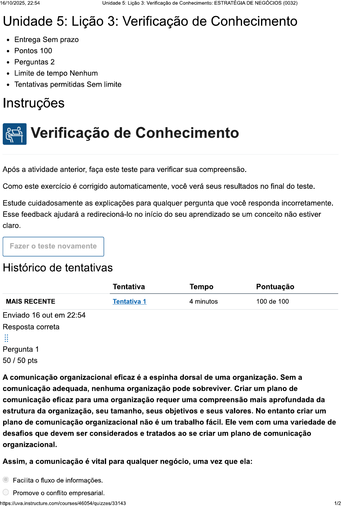 16/10/2025, 22:54 Unidade 5: Lição 3: Verificação de Conhecimento: ESTRATÉGIA DE NEGÓCIOS (0032) Unidade 5: Lição 3: Verificação de Conhecimento Entrega Sem prazo Pontos 100 Perguntas 2 Limite de tempo Nenhum Tentativas permitidas Sem limite Instruções Verificação de Conhecimento Após a atividade anterior, faça este teste para verificar sua compreensão. Como este exercício é corrigido automaticamente, você verá seus resultados no final do teste. Estude cuidadosamente as explicações para qualquer pergunta que você responda incorretamente. Esse feedback ajudará a redirecioná-lo no início do seu aprendizado se um conceito não estiver claro. Fazer teste novamente Histórico de tentativas Tentativa Tempo Pontuação MAIS RECENTE Tentativa 1 4 minutos 100 de 100 Enviado 16 out em 22:54 Resposta correta Pergunta 1 50 / 50 pts A comunicação organizacional eficaz é a espinha dorsal de uma organização. Sem a comunicação adequada, nenhuma organização pode sobreviver. Criar um plano de comunicação eficaz para uma organização requer uma compreensão mais aprofundada da estrutura da organização, seu tamanho, seus objetivos e seus valores. No entanto criar um plano de comunicação organizacional não é um trabalho fácil. Ele vem com uma variedade de desafios que devem ser considerados e tratados ao se criar um plano de comunicação organizacional. Assim, a comunicação é vital para qualquer negócio, uma vez que ela: Facilita o fluxo de informações. Promove o conflito empresarial. https://uva.instructure.com/courses/46054/quizzes/33143 1/216/10/2025, 22:54 Unidade 5: Lição 3: Verificação de Conhecimento: ESTRATÉGIA DE NEGÓCIOS (0032) Atrapalha o fluxo de informações. Facilita o conflito de informações. Facilita o desprovimento de informações. Trabalhar em uma equipe requer muito mais do que trabalho duro, espírito de equipe e prontidão para se trabalhar ao lado de um monte de pessoas. A coisa mais importante, mas mais ignorada, responsável pelo sucesso de uma equipe, é a comunicação eficaz. Assim, a comunicação é uma parte vital de qualquer ambiente de negócios, pois facilita fluxo de informações. Resposta correta Pergunta 2 50 / 50 pts A comunicação tem que ser constante durante todo processo estratégico, esta afirmação faz parte de qual ferramenta estratégica? Balanced Scorecard (BSC). Matriz de Ansoff. Estratégia Genérica. SWOT. Matriz BCG. A alternativa está correta, pois a comunicação constante faz parte do BSC. As demais alternativas não representam o enunciado. https://uva.instructure.com/courses/46054/quizzes/33143 2/2