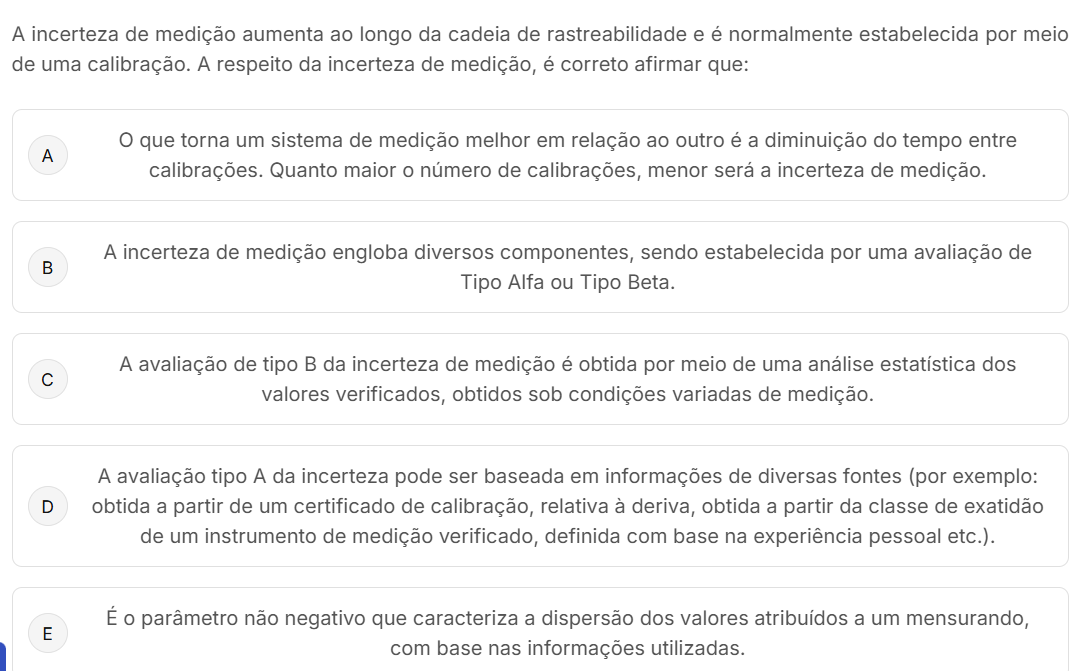 A incerteza de medição aumenta ao longo da cadeia de rastreabilidade e é normalmente estabelecida por meio de uma calibração. A respeito da incerteza de medição, é correto afirmar que: que torna um sistema de medição melhor em relação ao outro é a diminuição do tempo entre A calibrações. Quanto maior número de calibrações, menor será a incerteza de medição. A incerteza de medição engloba diversos componentes, sendo estabelecida por uma avaliação de B Tipo Alfa ou Tipo Beta. A avaliação de tipo B da incerteza de medição é obtida por meio de uma análise estatística dos C valores verificados, obtidos sob condições variadas de medição. A avaliação tipo A da incerteza pode ser baseada em informações de diversas fontes (por exemplo: D obtida a partir de um certificado de calibração, relativa à deriva, obtida a partir da classe de exatidão de um instrumento de medição verificado, definida com base na experiência pessoal etc.). É O parâmetro não negativo que caracteriza a dispersão dos valores atribuídos a um mensurando, E com base nas informações utilizadas.