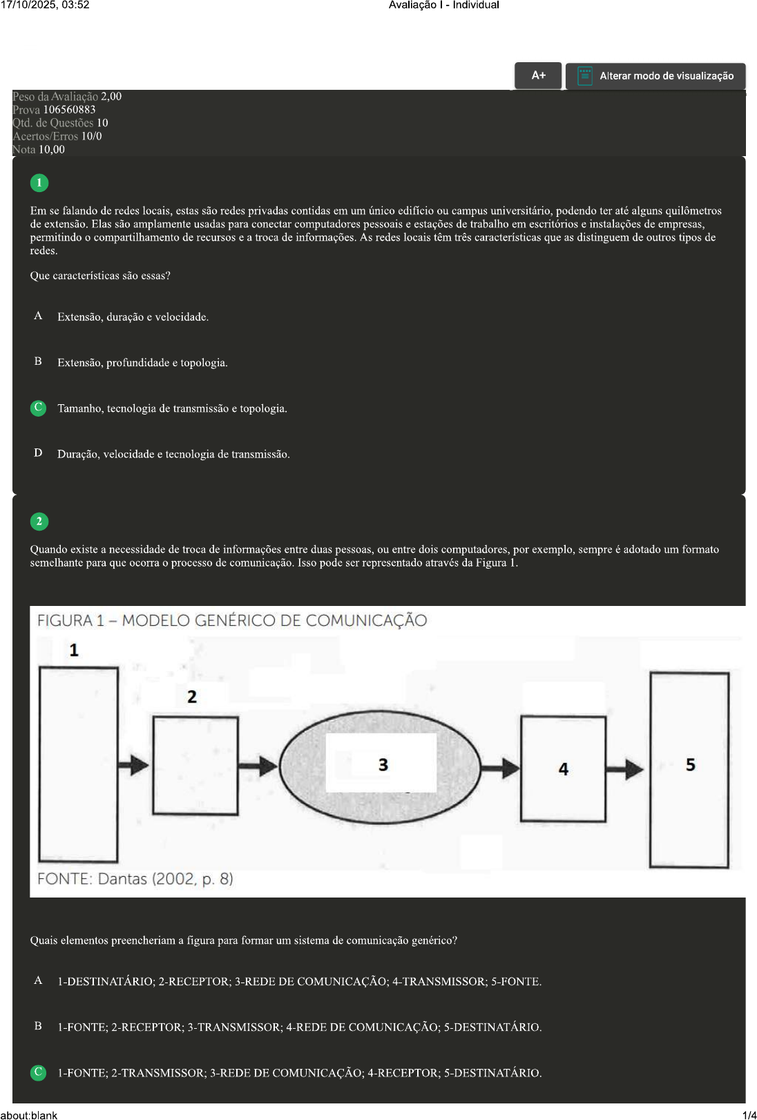 17/10/2025, 03:52 Avaliação - Individual A+ Alterar modo de visualização Peso da Avaliação 2,00 Prova 106560883 Qtd. de Questões 10 Acertos/Erros 10/0 Nota 10,00 1 Em se falando de redes locais, estas são redes privadas contidas em um único edifício ou campus universitário, podendo ter até alguns quilômetros de extensão. Elas são amplamente usadas para conectar computadores pessoais e estações de trabalho em escritórios e instalações de empresas, permitindo o compartilhamento de recursos e a troca de informações. As redes locais têm três características que as distinguem de outros tipos de redes. Que características são essas? A Extensão, duração e velocidade. Extensão, profundidade e topologia. Tamanho, tecnologia de transmissão e topologia. D Duração, velocidade e tecnologia de transmissão. 2 Quando existe a necessidade de troca de informações entre duas pessoas, ou entre dois computadores, por exemplo, sempre é adotado um formato semelhante para que ocorra o processo de comunicação. Isso pode ser representado através da Figura 1. FIGURA 1 MODELO GENÉRICO DE COMUNICAÇÃO 1 2 3 4 5 FONTE: Dantas (2002, 8) Quais elementos preencheriam a figura para formar um sistema de comunicação genérico? A 1-DESTINATÁRIO; 2-RECEPTOR; 3-REDE DE COMUNICAÇÃO; 4-TRANSMISSOR; 5-FONTE. 1-FONTE; - 2-RECEPTOR; 3-TRANSMISSOR; 4-REDE DE COMUNICAÇÃO; 5-DESTINATÁRIO. 1-FONTE; 2-TRANSMISSOR; 3-REDE DE COMUNICAÇÃO; 4-RECEPTOR; 5-DESTINATÁRIO. about:blank 1/417/10/2025, 03:52 Avaliação I - Individual D 1-REDE DE COMUNICAÇÃO; 2-DESTINATÁRIO; 3-FONTE; 4-RECEPTOR; 5-TRANSMISSOR. 3 Grandes empresas fazem uso das chamadas redes corporativas, que nada mais são do que a integração entre computadores de usuários, servidores diversos, mainframes que ainda são utilizados por algumas empresas e a própria Internet. Nesse contexto, assinale a alternativa CORRETA que apresenta aplicativos que essas redes viabilizam: A Banco de dados; ERP; CRM; as redes viabilizam diversos sistemas operacionais de rede e diversos aplicativos. Sistema de Planejamento de Recursos da Empresa; sistema de Gerenciamento de Relacionamento com Clientes; as redes corporativas viabilizam somente servidores Windows NT. C Banco de dados; apenas um sistema operacional de rede e dois aplicativos. D Enterprise resource planning; as redes corporativas viabilizam somente servidores Unix/Linux; gestão de relacionamento com o cliente. 4 É muito importante que profissionais da área de TI (Tecnologia da Informação) conheçam os princípios de funcionamento das redes de comunicação, que hoje em dia não trafegam somente voz, mas evoluíram, e conseguem trafegar dados, imagens e vídeo. Assinale a alternativa CORRETA que apresenta o elemento responsável pelo transporte do sinal que contém a informação, do transmissor ao receptor, sendo o coração do sistema de comunicação: A Fonte. Destinatário. Rede de comunicação. D Rede elétrica. 5 As redes de computadores são classificadas, geralmente, levando em consideração o aspecto da abrangência geográfica, ou dispersão. Assim, as redes se classificam em redes pessoais (PAN Personal Area Networks), redes locais (LAN Local Area Networks), redes metropolitanas (MAN Metropolitan Area Networks) e redes de longa distância (WAN Wide Area Networks). A respeito disso, classifique V para as sentenças verdadeiras e F para as falsas: ( ) As redes PAN são redes que viabilizam a comunicação entre pequenos dispositivos pessoais, como smartphone, tablets, relógios, sensores, GPSs etc. Esses podem pertencer, ou não, à pessoa. No caso de uma rede RFID (Identificação por Radiofrequência), composta por sensores e outros equipamentos, esses provavelmente não pertenceriam à pessoa. ( ) As redes MAN são as que existem em maior quantidade. ( ) Uma rede local (LAN) é uma facilidade de comunicação que provê uma conexão de alta velocidade entre processadores, periféricos, terminais e dispositivos de comunicação, de uma forma geral, em um único prédio (ou campus). As redes WAN têm o conceito de redes de longa distância devido à sua abrangência geográfica, que pode ser imensurável, ou seja, podem interligar continentes, países e regiões através de enlaces mais longos utilizando tecnologias com satélites ou fibras óticas (terrestres ou submarinas). about:blank 2/417/10/2025, 03:52 Avaliação - Individual Assinale a alternativa que apresenta a sequência CORRETA: A B V-F-V-V. C V-F-V-F. D F-F-F-V. 6 A partir do início da internet comercial no Brasil, em 1995, com sua operação pela Embratel, deu-se o grande crescimento da Internet que contribuiu também para o crescimento do uso de redes de computadores privativas, locais e de longa distância. Existem muitas definições para redes de computadores. Assinale a alternativa CORRETA que apresenta como poderiam ser definidas as redes de computadores: A São ambientes que se caracterizam pela interligação de um conjunto de elementos com capacidade computacional através somente de enlaces físicos guiados. Em adição, pacotes de software são empregados para permitir uma transparência na utilização da configuração. Um conjunto de recursos que, corretamente interligados e configurados, permitem a efetiva troca de informações entre computadores distintos, ou equipamentos correlatos, que estejam fisicamente próximos ou muito distantes entre si; além de permitir o compartilhamento de alguns recursos. Um grupo de computadores que podem se comunicar uns com os outros para compartilhar informações. Podendo variar desde dois C computadores em uma casa, que estão conectados por um cabo, até uma rede mais simples contendo alguns poucos computadores, cabos e dispositivos espalhados por prédios próximos no mesmo bairro. D São ambientes que se caracterizam pela interligação de um conjunto de elementos com capacidade computacional com apenas enlaces físicos não guiados. Em adi