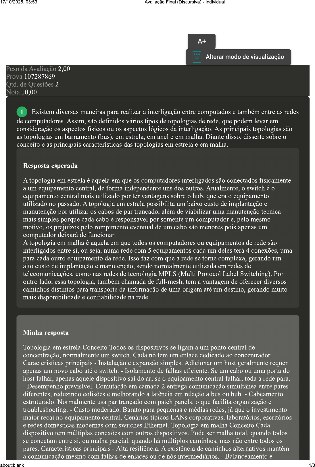 17/10/2025, 03:53 Avaliação Final (Discursiva) Individual A+ Alterar modo de visualização Peso da Avaliação 2,00 Prova 107287869 Qtd. de Questões 2 Nota 10,00 1 Existem diversas maneiras para realizar a interligação entre computados e também entre as redes de computadores. Assim, são definidos vários tipos de topologias de rede, que podem levar em consideração os aspectos físicos ou os aspectos lógicos da interligação. As principais topologias são as topologias em barramento (bus), em estrela, em anel e em malha. Diante disso, disserte sobre o conceito e as principais características das topologias em estrela e em malha. Resposta esperada A topologia em estrela é aquela em que os computadores interligados são conectados fisicamente a um equipamento central, de forma independente uns dos outros. Atualmente, o switch é o equipamento central mais utilizado por ter vantagens sobre o hub, que era o equipamento utilizado no passado. A topologia em estrela possibilita um baixo custo de implantação e manutenção por utilizar os cabos de par trançado, além de viabilizar uma manutenção técnica mais simples porque cada cabo é responsável por somente um computador e, pelo mesmo motivo, os prejuízos pelo rompimento eventual de um cabo são menores pois apenas um computador deixará de funcionar. A topologia em malha é aquela em que todos os computadores ou equipamentos de rede são interligados entre si, ou seja, numa rede com 5 equipamentos cada um deles terá 4 conexões, uma para cada outro equipamento da rede. Isso faz com que a rede se torne complexa, gerando um alto custo de implantação e manutenção, sendo normalmente utilizada em redes de telecomunicações, como nas redes de tecnologia MPLS (Multi Protocol Label Switching). Por outro lado, essa topologia, também chamada de full-mesh, tem a vantagem de oferecer diversos caminhos distintos para transporte da informação de uma origem até um destino, gerando muito mais disponibilidade e confiabilidade na rede. Minha resposta Topologia em estrela Conceito Todos os dispositivos se ligam a um ponto central de concentração, normalmente um switch. Cada nó tem um enlace dedicado ao concentrador. Características principais Instalação e expansão simples. Adicionar um host geralmente requer apenas um novo cabo até o switch. Isolamento de falhas eficiente. Se um cabo ou uma porta do host falhar, apenas aquele dispositivo sai do ar; se o equipamento central falhar, toda a rede para. Desempenho previsível. Comutação em camada 2 entrega comunicação simultânea entre pares diferentes, reduzindo colisões e melhorando a latência em relação a bus ou hub. Cabeamento estruturado. Normalmente usa par trançado com patch panels, que facilita organização e troubleshooting. Custo moderado. Barato para pequenas e médias redes, já que o investimento maior recai no equipamento central. Cenários típicos LANs corporativas, laboratórios, escritórios e redes domésticas modernas com switches Ethernet. Topologia em malha Conceito Cada dispositivo tem múltiplas conexões com outros dispositivos. Pode ser malha total, quando todos se conectam entre si, ou malha parcial, quando há múltiplos caminhos, mas não entre todos os pares. Características principais Alta resiliência. A existência de caminhos alternativos mantém a comunicação mesmo com falhas de enlaces ou de nós intermediários. Balanceamento e about:blank 1/317/10/2025, 03:53 Avaliação Final (Discursiva) Individual roteamento dinâmico. Protocolos como OSPF, IS-IS e, em escala de provedores, BGP, escolhem rotas com base em métricas e convergem após falhas. Em redes sem fio, malha 802.11s e protocolos de roteamento específicos fazem função semelhante. Complexidade maior. Exige planejamento de endereçamento, controle de loops e políticas de roteamento. Em camada 2, precisa de mecanismos como STP ou, preferencialmente, segmentação por VLAN e roteamento em L3 para evitar tempestades de broadcast. Custo e cabeamento elevados em malha total. O número de enlaces cresce rapidamente, o que é pouco prático para muitas portas; por isso, usa-se frequentemente malha parcial. Excelente disponibilidade e escalabilidade horizontal quando bem projetada. Cenários típicos Backbones de data centers, redes de provedores, enlaces troncais entre prédios, malhas Wi-Fi metropolitanas e redes industriais que exigem continuidade. Comparativo rápido Estrela prioriza simplicidade operacional, custo controlado e facilidade de expansão, com um ponto único crítico no concentrador. Malha prioriza disponibilidade e tolerância a falhas por múltiplos caminhos, à custa de maior complexidade e investimento em enlaces e em protocolos de roteamento. Em muitas redes modernas combina-se estrela nas bordas com malha no núcleo para obter simplicidade nas extremidades e alta resiliência no core. Retorno da correção Parabéns, acadêmico, sua resposta atingiu os objetivos da questão e você contemplou o esperado, demonstrando a competência da análise e síntese do assunto abordado, apresentando excelentes argumentos próprios, com base nos materiais disponibilizados. 2 As redes WAN (Wide Area Network) têm como objetivo fazer a interligação de redes de computadores, possuindo uma grande abrangência e sendo geograficamente distribuídas. Uma WAN é formada por roteadores que encaminham os pacotes de dados para os destinos corretos entre redes distintas. Para que se possa obter qualidade de serviço (QoS) em redes WAN, existem algumas técnicas, e uma delas é a utilização do MPLS (Multi Protocol Label Switching). Considerando isso, disserte sobre o funcionamento básico do MPLS. Resposta esperada MPLS funciona através da utilização de rótulos que são adicionados aos pacotes de dados na entrada da rede MPLS. Os roteadores com capacidade para tratar o MPLS vão encaminhar os pacotes, não verificando o endereço IP do destinatário, mas vão verificar 
