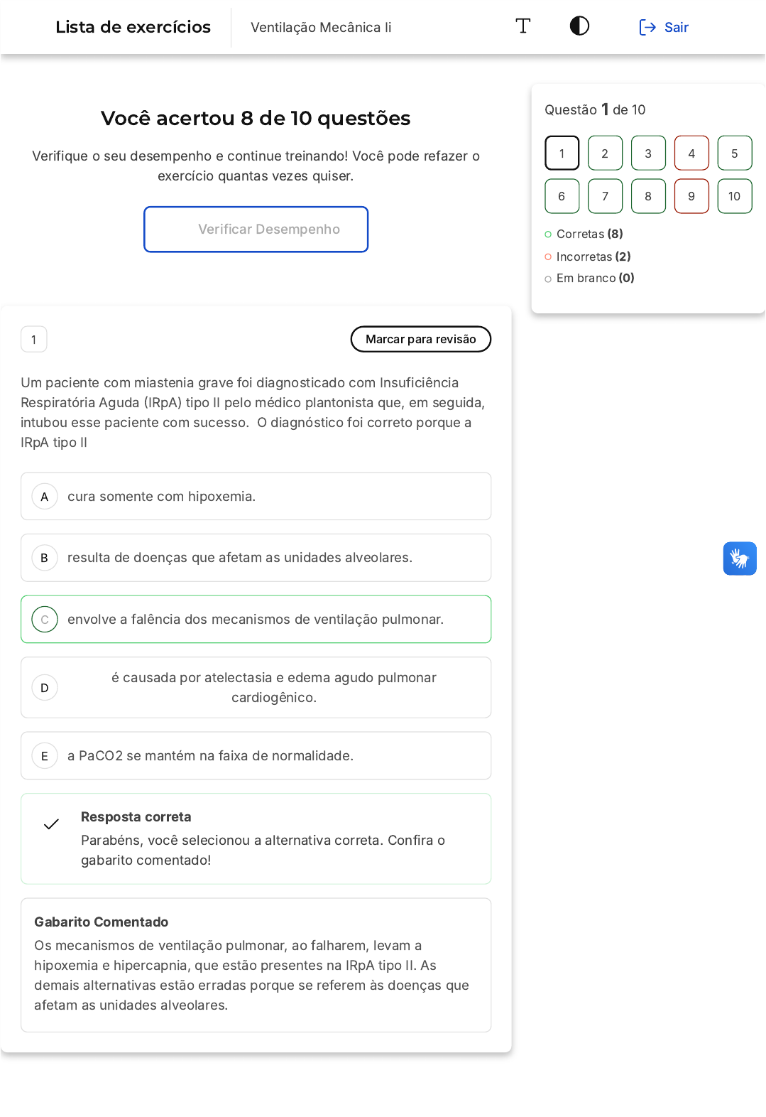 Você acertou 8 de 10 questões Verifique o seu desempenho e continue treinando! Você pode refazer o exercício quantas vezes quiser. Verificar Desempenho A B C D E 1 Marcar para revisão Um paciente com miastenia grave foi diagnosticado com Insuficiência Respiratória Aguda (IRpA) tipo II pelo médico plantonista que, em seguida, intubou esse paciente com sucesso. O diagnóstico foi correto porque a IRpA tipo II cura somente com hipoxemia. resulta de doenças que afetam as unidades alveolares. envolve a falência dos mecanismos de ventilação pulmonar. é causada por atelectasia e edema agudo pulmonar cardiogênico. a PaCO2 se mantém na faixa de normalidade. Resposta correta Parabéns, você selecionou a alternativa correta. Confira o gabarito comentado! Gabarito Comentado Os mecanismos de ventilação pulmonar, ao falharem, levam a hipoxemia e hipercapnia, que estão presentes na IRpA tipo II. As demais alternativas estão erradas porque se referem às doenças que afetam as unidades alveolares. Questão 1 de 10 Corretas (8) Incorretas (2) Em branco (0) 1 2 3 4 5 6 7 8 9 10 Lista de exercícios Ventilação Mecânica Ii Sair A B C D E 2 Marcar para revisão A IRpA tem etiologias pulmonares e extrapulmonares. Nestas últimas, a causa de insuficiência respiratória está relacionada aos mecanismos de ventilação pulmonar. Assinale a afirmativa que corresponde a uma causa extrapulmonar de Insuficiência Respiratória Aguda. Doença pulmonar obstrutiva crônica (DPOC) agudizada. Câncer pulmonar terminal. Hemorragia pulmonar. Esclerose lateral amiotrófica. Síndrome do desconforto respiratório agudo (SDRA). Resposta correta Parabéns, você selecionou a alternativa correta. Confira o gabarito comentado! Gabarito Comentado A esclerose lateral amiotrófica é uma doença que afeta a medula espinhal, interferindo na capacidade do corpo de controlar os músculos necessários para a respiração, tornando-a uma causa extrapulmonar de Insuficiência Respiratória Aguda (IRpA). As outras opções, como a Doença Pulmonar Obstrutiva Crônica (DPOC) agudizada, o câncer pulmonar terminal, a hemorragia pulmonar e a Síndrome do Desconforto Respiratório Agudo (SDRA), são todas condições que afetam diretamente os pulmões, portanto, são consideradas causas pulmonares de IRpA. 3 Marcar para revisão Avalie o seguinte caso: paciente crítico adulto com Síndrome do Desconforto Respiratório Agudo (SDRA), sedado, intubado e em ventilação mecânica, apresentando FiO2 igual a 55% e, à gasometria arterial, PaO2 igual a 80 mmHg. Assinale a alternativa que indica em qual classificação grau de SDRA o paciente se enquadra. A B C D E Moderada, pois a relação PaO2/FiO2 está entre 100 e 200. Leve, pois a relação PaO2/FiO2 está acima de 300. Severa, pois a relação PaO2/FiO2 é inferior a 100. O paciente apresenta SDRA secundária. Moderada, pois a relação PaO2/FiO2 está acima de 250. Resposta correta Parabéns, você selecionou a alternativa correta. Confira o gabarito comentado! Gabarito Comentado O paciente em questão apresenta uma relação PaO2/FiO2 equivalente a 145. Segundo a classificação da SDRA por gravidade, uma relação PaO2/FiO2 entre 100 e 200 indica uma lesão pulmonar de grau moderado. As demais alternativas não são corretas, pois não se aplicam ao caso do paciente. A alternativa B sugere um quadro leve, que não corresponde à relação PaO2/FiO2 do paciente. A alternativa C sugere um quadro severo, que também não se aplica ao caso. A alternativa D menciona a SDRA secundária, que se refere à causa extrapulmonar da síndrome e não ao seu grau de gravidade. Por fim, a alternativa E sugere uma lesão pulmonar leve, que também não corresponde à situação do paciente. 4 Marcar para revisão Ao monitorar um paciente de 47 anos, peso corporal de 74 Kg, sem sedação, interagindo calmamente com o examinador e com proposta de iniciar o processo de desmame, você observa que a ventilação com suporte pressórico (PSV) estabelecida foi de 10 cmH2O, o volume corrente equivale a 380 ml, a pressão de pico equivale a 24 cmH2O, a pressão de platô, 19 cmH2O, a PEEP igual a 8 cmH2O, a frequência respiratória é igual a 25 IRPM e a FiO2 é igual a 35%. Seus parâmetros gasométricos são: pH = 7,39; PaO2 = 89; paCO2 = 44; HCO_3^- = 25; BE = -1; SpO2 = 97% (equivalente ao valor que você visualiza no monitor de sinais vitais). Você realizaria o TRE (Teste de Respiração Espontânea)? Marque a alternativa correta. A B C D E A B Não, porque as complacências estática e dinâmica estão muito baixas para progredir o desmame. Sim, porque a relação PaO2/FiO2 está acima de 200 e o volume corrente equivale a 8 ml/Kg. Sim, porque, embora a complacência estática esteja muito baixa (13 ml/cmH2O) e a frequência respiratória esteja muito alta, o paciente terá sucesso no desmame. Não. O paciente está hipoxêmico e com as complacências muito diminuídas. Não, porque o volume corrente está muito baixo e o índice de Nemer (IWI) está abaixo de 25. Resposta incorreta Opa! A alternativa correta é a letra B. Confira o gabarito comentado! Gabarito Comentado O processo de desmame é indicado quando, dentre outros fatores, a PaO2/FiO2 está acima de 200 e o volume corrente equivale a 8 ml/Kg. As demais alternativas estão erradas porque, as complacências estática e dinâmica ultrapassam os valores mínimos para iniciar o processo de desmame, a frequência respiratória está superior a 6 IRPM e inferior a 35 IRPM. Além disso, na análise gasométrica deste caso, o paciente não apresenta hipoxemia, bem como seu IWI é superior a 25. 5 Marcar para revisão A Síndrome do desconforto respiratório agudo (SDRA) foi descrita, pela primeira vez, em 1967. Desde então, inúmeras pesquisas têm revelado mais e mais características do quadro clínico da SDRA, incluindo a descoberta da SDRA extrapulmonar, que tem fatores de risco bem específicos. Neste contexto, marque a alte