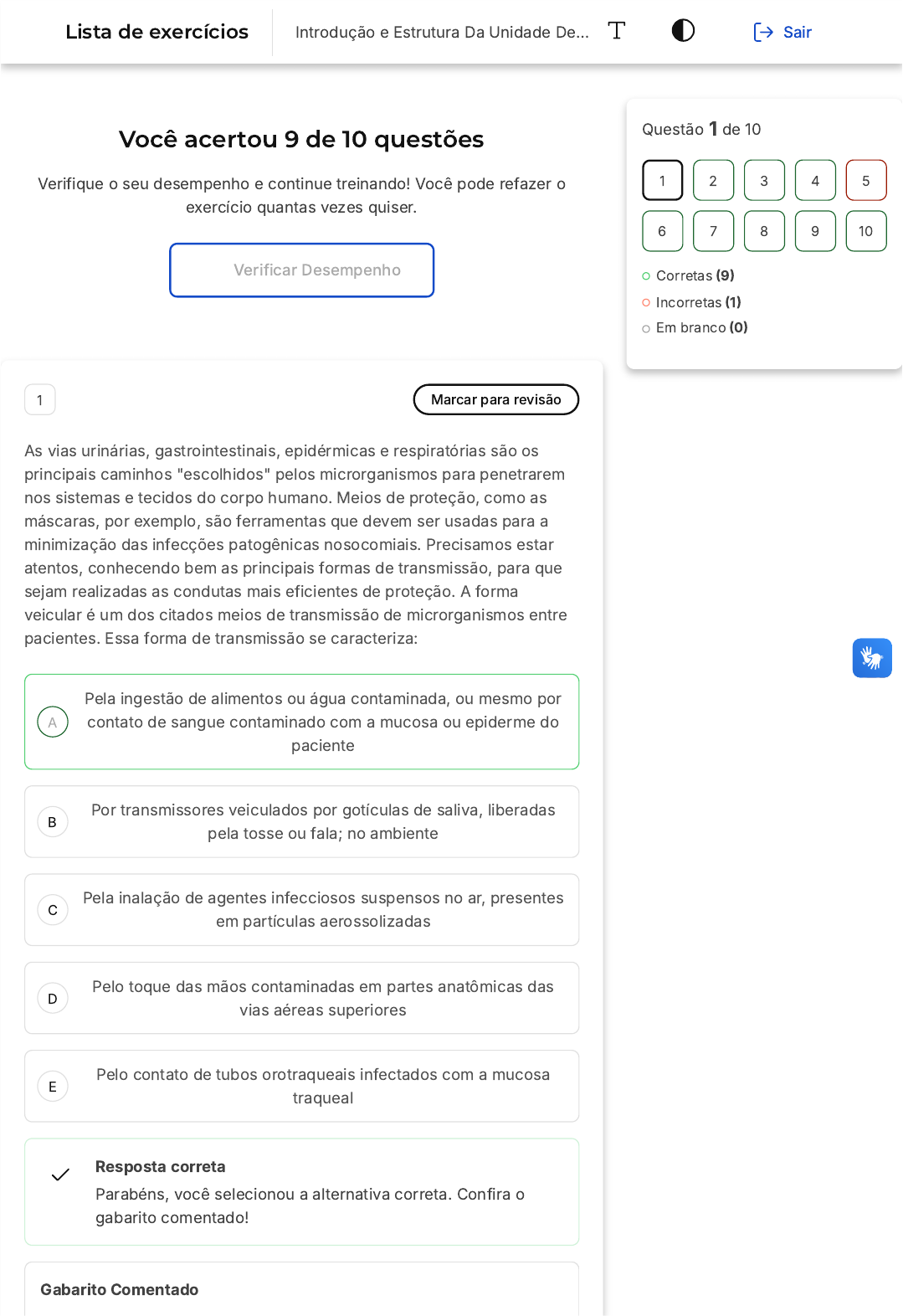 Você acertou 9 de 10 questões Verifique o seu desempenho e continue treinando! Você pode refazer o exercício quantas vezes quiser. Verificar Desempenho A B C D E 1 Marcar para revisão As vias urinárias, gastrointestinais, epidérmicas e respiratórias são os principais caminhos "escolhidos" pelos microrganismos para penetrarem nos sistemas e tecidos do corpo humano. Meios de proteção, como as máscaras, por exemplo, são ferramentas que devem ser usadas para a minimização das infecções patogênicas nosocomiais. Precisamos estar atentos, conhecendo bem as principais formas de transmissão, para que sejam realizadas as condutas mais eficientes de proteção. A forma veicular é um dos citados meios de transmissão de microrganismos entre pacientes. Essa forma de transmissão se caracteriza: Pela ingestão de alimentos ou água contaminada, ou mesmo por contato de sangue contaminado com a mucosa ou epiderme do paciente Por transmissores veiculados por gotículas de saliva, liberadas pela tosse ou fala; no ambiente Pela inalação de agentes infecciosos suspensos no ar, presentes em partículas aerossolizadas Pelo toque das mãos contaminadas em partes anatômicas das vias aéreas superiores Pelo contato de tubos orotraqueais infectados com a mucosa traqueal Resposta correta Parabéns, você selecionou a alternativa correta. Confira o gabarito comentado! Gabarito Comentado Questão 1 de 10 Corretas (9) Incorretas (1) Em branco (0) 1 2 3 4 5 6 7 8 9 10 Lista de exercícios Introdução e Estrutura Da Unidade De… Sair A B C D E A alternativa correta é a letra A, que descreve a transmissão veicular de microrganismos. Este tipo de transmissão ocorre principalmente pela ingestão de alimentos ou água contaminada, ou mesmo por contato de sangue contaminado com a mucosa ou epiderme do paciente. É importante ressaltar que existem outras formas de transmissão de microrganismos, como por exemplo, a transmissão por gotículas de saliva liberadas pela tosse ou fala, a inalação de agentes infecciosos suspensos no ar, o toque das mãos contaminadas em partes anatômicas das vias aéreas superiores e o contato de tubos orotraqueais infectados com a mucosa traqueal. No entanto, a questão se refere especificamente à transmissão veicular, que é caracterizada pela ingestão de substâncias contaminadas ou pelo contato de sangue contaminado com a mucosa ou epiderme do paciente. 2 Marcar para revisão Frequentemente utilizados em um ambiente de cuidados intensivos, os cateteres, as sondas para aspiração e as máscaras são materiais de apoio ao suporte de pacientes com dificuldade respiratória. De ação profilática ou curativa, esses equipamentos podem evitar situações clínicas comuns nos doentes sem via aérea artificial. As máscaras e cateteres podem servir de interface para a oferta de oxigênio com vários objetivos clínicos. Assinale a alternativa correta que indica o equipamento utilizado para ofertar oxigênio em concentrações invariáveis e bem controladas. As máscaras de nebulização Os cateteres As sondas As máscaras comuns A máscara de Venturi Resposta correta Parabéns, você selecionou a alternativa correta. Confira o gabarito comentado! Gabarito Comentado Gabarito: A máscara de Venturi Justificativa: A máscara de Venturi é o equipamento correto para a oferta de oxigênio em concentrações invariáveis e bem controladas. A B C D E As máscaras comuns e os cateteres, embora sejam interfaces que entregam oxigênio, fazem isso misturando o oxigênio com o ar ambiente, o que dilui o gás com os outros presentes na atmosfera e impossibilita a entrega de concentrações controladas de oxigênio. A máscara de Venturi, por outro lado, tem acopladas a ela pequenas peças que possibilitam a oferta de frações de oxigênio conhecidas. As sondas, quando usadas nas vias respiratórias, não são utilizadas para ofertar oxigênio, mas sim para a realização da aspiração endotraqueal. 3 Marcar para revisão A retirada do paciente do suporte ventilatório mecânico, depende da astúcia dos profissionais que são responsáveis pelo desmame e pela realização de exames que auxiliem a possibilidade deste feito tão importante ser consumado. As condições ácidos-básicas do doente internado é um fator determinante para ser indicada a sua retirada do ventilador. Sobre o equipamento que principalmente nos dá condições de analisar os parâmetros necessários de equilíbrio ácido-base, assinale a opção correta. Capnógrafo Monitor multiparamétrico Urodensímetro Oxigenador de membrana extracorpórea (ECOM) Hemogasômetro Resposta correta Parabéns, você selecionou a alternativa correta. Confira o gabarito comentado! Gabarito Comentado O hemogasômetro é o equipamento que principalmente nos dá condições de analisar os parâmetros necessários de equilíbrio ácido- base. Para obter um diagnóstico do equilíbrio ácido é importante sabermos o pH e a paco2 do sangue arterial. A gasometria arterial é um exame importante pois possibilita a análise destes dois parâmetros. O hemogasômetro pode medir tanto o pH sanguíneo quanto a pac2 de forma direta. O capnógrafo e o monitor multiparamétrico possibilitam a medida concentração de gás A B C D E carbônico, mas não podem fornecer o pH sanguíneo. Nem o urodensímetro tão pouco o ECOM; podem fornecer os dois parâmetros necessários. 4 Marcar para revisão As infecções nosocomiais dependem da fonte do patógeno, se o indivíduo é suscetível ou não à instalação do processo infeccioso e dos diversos caminhos responsáveis pela transmissão microrgânica. Os elementos intra-hospitalares patogênicos são considerados reservatórios e o processo infeccioso depende de sua fonte agressora. Dentre as diversas fontes de microrganismos, o processo por infecção autógena é talvez o mais surpreendente. Assinale a opção que indica fonte patogênica nesse processo. São os equipamentos de uso invasivo 