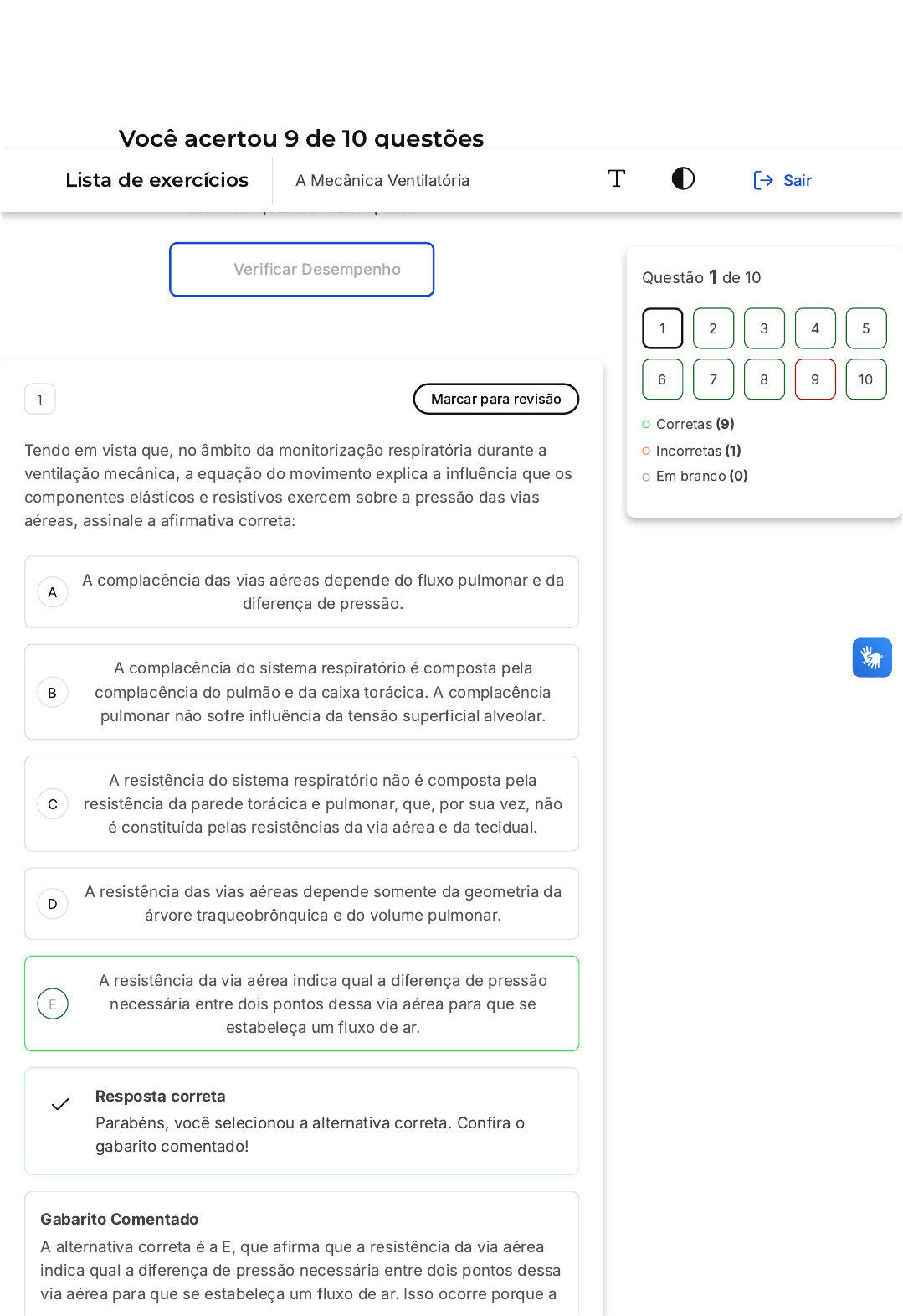 Você acertou 9 de 10 questões Verifique o seu desempenho e continue treinando! Você pode refazer o exercício quantas vezes quiser. Verificar Desempenho A B C D E 1 Marcar para revisão Tendo em vista que, no âmbito da monitorização respiratória durante a ventilação mecânica, a equação do movimento explica a influência que os componentes elásticos e resistivos exercem sobre a pressão das vias aéreas, assinale a afirmativa correta: A complacência das vias aéreas depende do fluxo pulmonar e da diferença de pressão. A complacência do sistema respiratório é composta pela complacência do pulmão e da caixa torácica. A complacência pulmonar não sofre influência da tensão superficial alveolar. A resistência do sistema respiratório não é composta pela resistência da parede torácica e pulmonar, que, por sua vez, não é constituída pelas resistências da via aérea e da tecidual. A resistência das vias aéreas depende somente da geometria da árvore traqueobrônquica e do volume pulmonar. A resistência da via aérea indica qual a diferença de pressão necessária entre dois pontos dessa via aérea para que se estabeleça um fluxo de ar. Resposta correta Parabéns, você selecionou a alternativa correta. Confira o gabarito comentado! Gabarito Comentado A alternativa correta é a E, que afirma que a resistência da via aérea indica qual a diferença de pressão necessária entre dois pontos dessa via aérea para que se estabeleça um fluxo de ar. Isso ocorre porque a Questão 1 de 10 Corretas (9) Incorretas (1) Em branco (0) 1 2 3 4 5 6 7 8 9 10 Lista de exercícios A Mecânica Ventilatória Sair A B C D E resistência é uma medida da oposição ao fluxo de ar nas vias aéreas. Ela é determinada pela geometria da árvore traqueobrônquica e pelo volume pulmonar. A resistência do sistema respiratório é composta pela resistência da parede torácica e pulmonar, que inclui as resistências da via aérea e da tecidual. A complacência, por outro lado, é uma medida da distensibilidade do parênquima pulmonar e é calculada pela razão entre a variação no volume pulmonar pela variação na pressão. A complacência do sistema respiratório é composta pela complacência do pulmão e da caixa torácica. A complacência pulmonar é influenciada pela tensão superficial alveolar, que é reduzida pelo surfactante secretado pelos pneumócitos tipo II. Este surfactante minimiza o colapso das pequenas vias aéreas e alvéolos, aumenta a complacência, reduz o trabalho inspiratório pulmonar e auxilia na estabilidade alveolar. 2 Marcar para revisão A constante de tempo representa o tempo necessário para encher ou esvaziar uma unidade alveolar em 63%, em resposta à variação da pressão de distensão do sistema respiratório. Em pacientes mecanicamente ventilados, o cálculo do valor da constante de tempo fornece informações sobre a mecânica respiratória e o tempo necessário para uma completa expiração até o ponto de equilíbrio em repouso. Considerando um paciente cuja complacência estática é de 60ml/cmH O e a resistência expiratória de 13 cmH2O/L/s, o tempo necessário para esvaziar 95% do volume pulmonar seria: 2 0,21s 0,78s 2,34s 4,61s 7,80s. Resposta correta Parabéns, você selecionou a alternativa correta. Confira o gabarito comentado! Gabarito Comentado A Constante de Tempo (CT) é o tempo necessário para encher ou esvaziar uma unidade alveolar em 63,2% em resposta à variação da A B C D E pressão de distensão do sistema respiratório, sendo quantificada pelo produto da complacência e resistência do sistema respiratório. Uma CT representa o tempo necessário para insuflar ou desinsuflar em 63,2% do volume final pulmonar, 3 CTs correspondem ao tempo necessário para encher ou esvaziar em 95% os pulmões, enquanto para o esvaziamento ou enchimento completo dos alvéolos são necessários 5 CTs, que correspondem a uma variação de 99,3% do volume pulmonar inicial. Na questão em análise, a CT será dada pelo produto da complacência estática e resistência expiratória, mas antes de realizar os cálculos, é importante corrigir as unidades de medidas. Portanto, 60ml/cmH2O é igual a 0,06L/cmH O, assim a CT é igual a 0,06L/cmH2O*13cmH2O/L/s = 0,78s. No entanto, para o tempo necessário para esvaziar 95% do volume pulmonar, é igual a 3*CT, logo, a resposta será 3*0,78 = 2,34s. 2 3 Marcar para revisão Os volumes pulmonares são subdivisões da quantidade de ar presentes no pulmão durante a inspiração e a expiração. Assinale a opção que define o ar que permanece nos pulmões após a expiração normal e basal. Volume Residual. Volume Corrente. Capacidade Residual Funcional. Volume de Reserva Expiratório. Capacidade Inspiratória. Resposta correta Parabéns, você selecionou a alternativa correta. Confira o gabarito comentado! Gabarito Comentado Gabarito: Capacidade Residual Funcional. Justificativa: A Capacidade Residual Funcional é a quantidade de ar que permanece nos pulmões após uma expiração normal e basal. Isso significa que, mesmo após expirarmos normalmente, ainda há uma quantidade de ar que permanece em nossos pulmões, garantindo a oxigenação contínua do nosso organismo. As outras opções apresentadas na questão representam diferentes aspectos dos volumes pulmonares. O Volume Corrente é o volume de ar que A B C D E inspiramos e expiramos durante cada ciclo respiratório normal. A Capacidade Inspiratória é o volume máximo de ar que podemos inspirar voluntariamente após uma inspiração normal. O Volume de Reserva Expiratório é o volume máximo de ar que podemos expirar voluntariamente após uma expiração normal. E o Volume Residual é o volume de ar que permanece em nossos pulmões mesmo após uma expiração máxima voluntária. 4 Marcar para revisão As propriedades mecânicas do sistema respiratório são ferramentas importantes no âmbito da monitorização do paciente crítico em ventilação