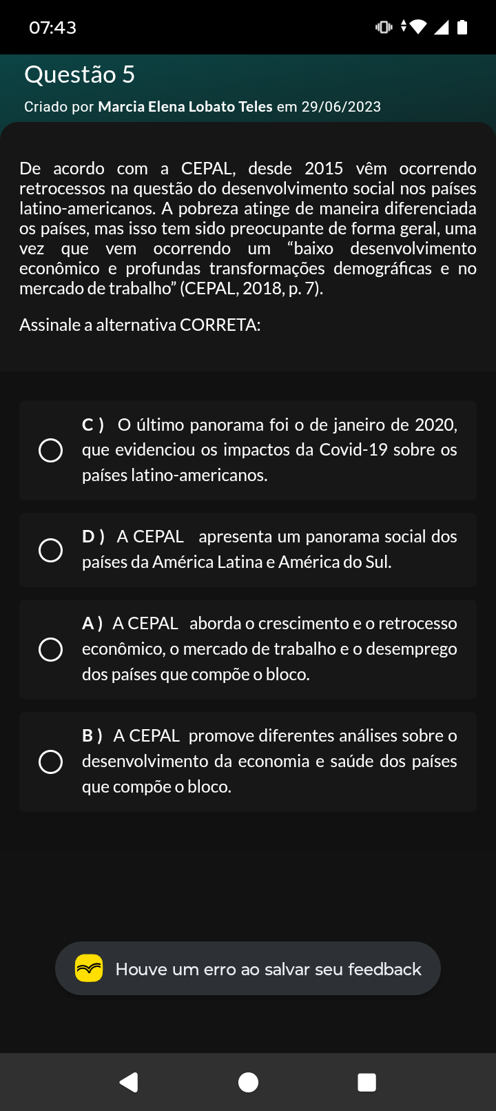 07:43 Questão 5 Criado por Marcia Elena Lobato Teles em 29/06/2023 De acordo com a CEPAL, desde 2015 vêm ocorrendo retrocessos na questão do desenvolvimento social nos países latino-americanos. A pobreza atinge de maneira diferenciada os países, mas isso tem sido preocupante de forma geral, uma vez que vem ocorrendo um "baixo desenvolvimento econômico e profundas transformações demográficas e no mercado de trabalho" (CEPAL, 2018, 7). Assinale a alternativa CORRETA: C) último panorama foi o de janeiro de 2020, que evidenciou os impactos da Covid-19 sobre os países latino-americanos. D) A CEPAL apresenta um panorama social dos países da América Latina e América do Sul. A) A CEPAL aborda o crescimento e retrocesso econômico, mercado de trabalho e desemprego dos países que compõe o bloco. B) A CEPAL promove diferentes análises sobre o desenvolvimento da economia e saúde dos países que compõe o bloco. Houve um erro ao salvar seu feedback