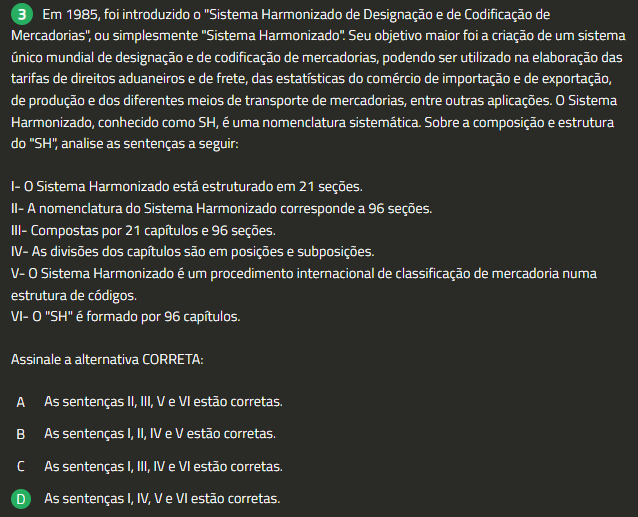 3 Em 1985, foi introduzido 0 "Sistema Harmonizado de Designação e de Codificação de Mercadorias", ou simplesmente "Sistema Harmonizado". Seu objetivo maior foi a criação de um sistema único mundial de designação e de codificação de mercadorias, podendo ser utilizado na elaboração das tarifas de direitos aduaneiros e de frete, das estatísticas do comércio de importação e de exportação, de produção e dos diferentes meios de transporte de mercadorias, entre outras aplicações. 0 Sistema Harmonizado, conhecido como SH, é uma nomenclatura sistemática. Sobre a composição e estrutura do "SH", analise as sentenças a seguir: - 0 Sistema Harmonizado está estruturado em 21 seções. II- A nomenclatura do Sistema Harmonizado corresponde a 96 seções. III- Compostas por 21 capítulos e 96 seções. IV- As divisões dos capítulos são em posições e subposições. V- 0 Sistema Harmonizado é um procedimento internacional de classificação de mercadoria numa estrutura de códigos. VI- 0 "SH" é formado por 96 capitulos. Assinale a alternativa CORRETA: A As sentenças II, III, V e VI estão corretas. B As sentenças I, II, IV e V estão corretas. C As sentenças III, IV e VI estão corretas. D As sentenças IV, V e VI estão corretas.