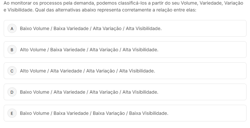 Ao monitorar processos pela demanda, podemos a partir do seu Volume, Variedade, Variação e Visibilidade. Qual das alternativas abaixo representa corretamente a relação entre elas: A Baixo Volume / Baixa Variedade / Alta Variação / Alta Visibilidade. B Alto Volume / Baixa Variedade / Alta Variação / Alta Visibilidade. C Alto Volume / Alta Variedade / Alta Variação / Alta Visibilidade. D Baixo Volume / Alta Variedade / Alta Variação / Alta Visibilidade. E Baixo Volume / Baixa Variedade / Baixa Variação / Baixa Visibilidade.