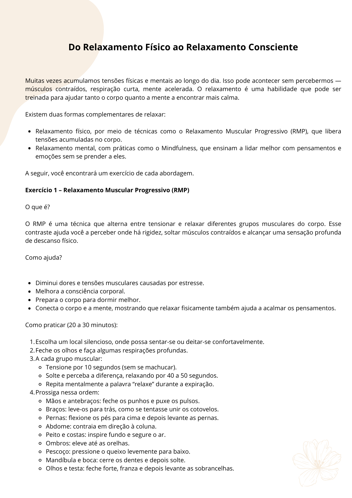 Muitas vezes acumulamos tensões físicas e mentais ao longo do dia. Isso pode acontecer sem percebermos — músculos contraídos, respiração curta, mente acelerada. O relaxamento é uma habilidade que pode ser treinada para ajudar tanto o corpo quanto a mente a encontrar mais calma. Existem duas formas complementares de relaxar: Relaxamento físico, por meio de técnicas como o Relaxamento Muscular Progressivo (RMP), que libera tensões acumuladas no corpo. Relaxamento mental, com práticas como o Mindfulness, que ensinam a lidar melhor com pensamentos e emoções sem se prender a eles. A seguir, você encontrará um exercício de cada abordagem. Exercício 1 – Relaxamento Muscular Progressivo (RMP) O que é? O RMP é uma técnica que alterna entre tensionar e relaxar diferentes grupos musculares do corpo. Esse contraste ajuda você a perceber onde há rigidez, soltar músculos contraídos e alcançar uma sensação profunda de descanso físico. Como ajuda? Diminui dores e tensões musculares causadas por estresse. Melhora a consciência corporal. Prepara o corpo para dormir melhor. Conecta o corpo e a mente, mostrando que relaxar fisicamente também ajuda a acalmar os pensamentos. Como praticar (20 a 30 minutos): 1.Escolha um local silencioso, onde possa sentar-se ou deitar-se confortavelmente. 2.Feche os olhos e faça algumas respirações profundas. 3.A cada grupo muscular: Tensione por 10 segundos (sem se machucar). Solte e perceba a diferença, relaxando por 40 a 50 segundos. Repita mentalmente a palavra “relaxe” durante a expiração. 4.Prossiga nessa ordem: Mãos e antebraços: feche os punhos e puxe os pulsos. Braços: leve-os para trás, como se tentasse unir os cotovelos. Pernas: flexione os pés para cima e depois levante as pernas. Abdome: contraia em direção à coluna. Peito e costas: inspire fundo e segure o ar. Ombros: eleve até as orelhas. Pescoço: pressione o queixo levemente para baixo. Mandíbula e boca: cerre os dentes e depois solte. Olhos e testa: feche forte, franza e depois levante as sobrancelhas. Do Relaxamento Físico ao Relaxamento Consciente 5. Ao final, respire profundamente e sinta o corpo inteiro solto e confortável. 6. Permaneça alguns minutos nesse estado antes de abrir os olhos. Com a prática, você aprenderá a identificar tensões logo que aparecem no seu corpo e a relaxá-las com mais facilidade. O que é mindfulness? Mindfulness significa atenção plena: é a capacidade de estar presente no momento atual com abertura, curiosidade e sem julgamentos. Isso quer dizer que você não precisa “lutar” contra seus pensamentos ou emoções. Em vez disso, aprende a observá-los como se estivesse olhando de fora, com distância e calma. Alguns pontos importantes: Não julgar: pensamentos não são bons nem ruins, são apenas eventos mentais. Não reagir: não é preciso agir ou se prender a cada pensamento ou emoção que surge. Voltar ao presente: sempre que sua mente divaga para o passado ou futuro, você pode suavemente trazê-la de volta ao aqui e agora. Com a prática, mindfulness ajuda a: reduzir preocupações excessivas, quebrar ciclos de ansiedade, aumentar a clareza mental, desenvolver autocompaixão e paciência consigo mesmo. Exercício 2 – Mindfulness da Respiração Duração: 5 minutos Passos principais: 1.Sente-se confortavelmente, coluna ereta, olhos fechados. 2. Inspire pelo nariz, segure por 3 segundos e expire lentamente. 3.Conte mentalmente “um”, depois “dois”, “três” a cada expiração, até o cronômetro marcar 5 minutos. 4.Se perceber distrações, apenas note e traga sua atenção de volta à respiração, sem críticas. Esse exercício fortalece a mente para lidar melhor com preocupações e ansiedade. Exercício 3 – Mindfulness da Nuvem Duração: 5 minutos Aqui você vai usar a imaginação para observar seus pensamentos sem reagir a eles. Passos principais: 1. Imagine-se em uma colina, olhando para o céu azul. 2.Cada pensamento ou preocupação que surgir é colocado em uma nuvem. 3.Observe a nuvem se afastar até desaparecer. 4.Repita o processo com qualquer pensamento que apareça. 5.Finalize respirando fundo e trazendo sua atenção para o ambiente. Esse exercício ensina a separar-se dos pensamentos, criando distância emocional. Para lembrar sempre A mente distraída é normal, especialmente no começo. O segredo não é “parar de pensar”, mas aprender a observar sem reagir. Cada prática é uma oportunidade de treinar a calma e a aceitação. Dica final RMP → ótimo para soltar o corpo. Mindfulness → ótimo para acalmar a mente. Combinados, eles criam uma experiência de relaxamento mais completa. Depois de cada prática, registre como se sentiu e o que percebeu. Isso ajudará a acompanhar seu progresso.