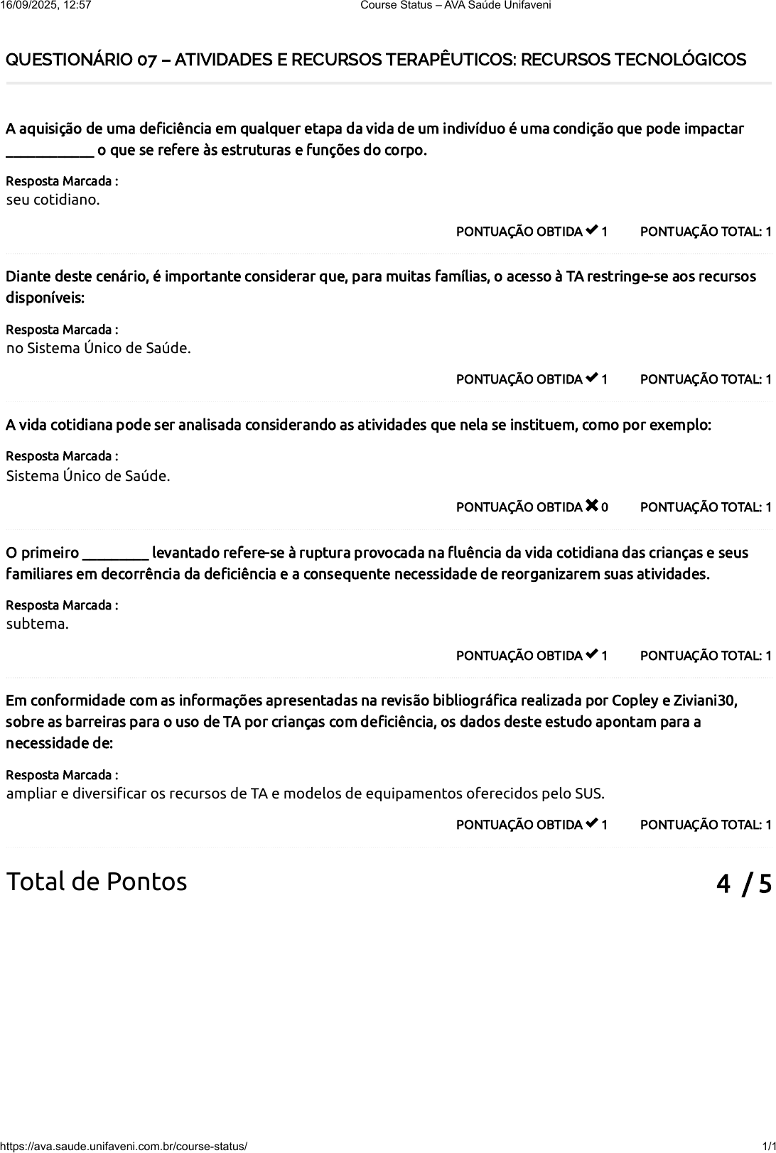 4 / 5 QUESTIONÁRIO 07 – ATIVIDADES E RECURSOS TERAPÊUTICOS: RECURSOS TECNOLÓGICOS PONTUAÇÃO TOTAL: 1PONTUAÇÃO OBTIDA 1 A aquisição de uma deficiência em qualquer etapa da vida de um indivíduo é uma condição que pode impactar ____________ o que se refere às estruturas e funções do corpo. Resposta Marcada : seu cotidiano. PONTUAÇÃO TOTAL: 1PONTUAÇÃO OBTIDA 1 Diante deste cenário, é importante considerar que, para muitas famílias, o acesso à TA restringe-se aos recursos disponíveis: Resposta Marcada : no Sistema Único de Saúde. PONTUAÇÃO TOTAL: 1PONTUAÇÃO OBTIDA 0 A vida cotidiana pode ser analisada considerando as atividades que nela se instituem, como por exemplo: Resposta Marcada : Sistema Único de Saúde. PONTUAÇÃO TOTAL: 1PONTUAÇÃO OBTIDA 1 O primeiro _________ levantado refere-se à ruptura provocada na fluência da vida cotidiana das crianças e seus familiares em decorrência da deficiência e a consequente necessidade de reorganizarem suas atividades. Resposta Marcada : subtema. PONTUAÇÃO TOTAL: 1PONTUAÇÃO OBTIDA 1 Em conformidade com as informações apresentadas na revisão bibliográfica realizada por Copley e Ziviani30, sobre as barreiras para o uso de TA por crianças com deficiência, os dados deste estudo apontam para a necessidade de: Resposta Marcada : ampliar e diversificar os recursos de TA e modelos de equipamentos oferecidos pelo SUS. Total de Pontos 16/09/2025, 12:57 Course Status – AVA Saúde Unifaveni https://ava.saude.unifaveni.com.br/course-status/ 1/1