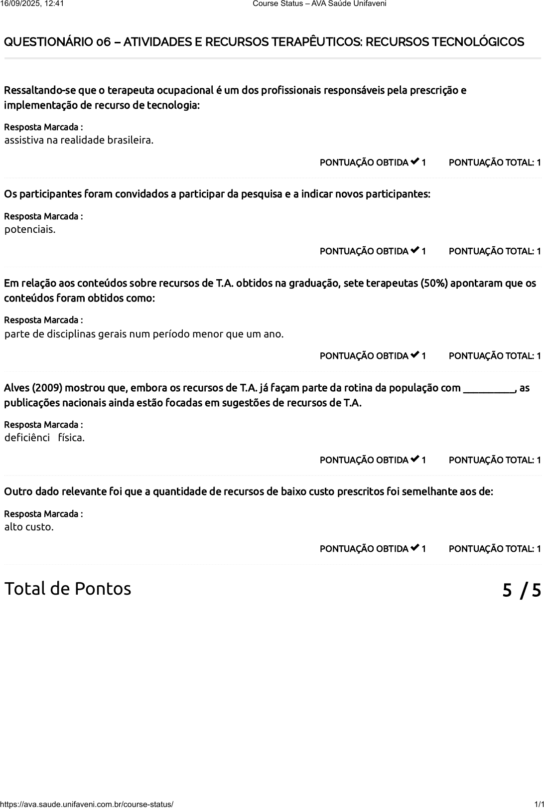 5 / 5 QUESTIONÁRIO 06 – ATIVIDADES E RECURSOS TERAPÊUTICOS: RECURSOS TECNOLÓGICOS PONTUAÇÃO TOTAL: 1PONTUAÇÃO OBTIDA 1 Ressaltando-se que o terapeuta ocupacional é um dos profissionais responsáveis pela prescrição e implementação de recurso de tecnologia: Resposta Marcada : assistiva na realidade brasileira. PONTUAÇÃO TOTAL: 1PONTUAÇÃO OBTIDA 1 Os participantes foram convidados a participar da pesquisa e a indicar novos participantes: Resposta Marcada : potenciais. PONTUAÇÃO TOTAL: 1PONTUAÇÃO OBTIDA 1 Em relação aos conteúdos sobre recursos de T.A. obtidos na graduação, sete terapeutas (50%) apontaram que os conteúdos foram obtidos como: Resposta Marcada : parte de disciplinas gerais num período menor que um ano. PONTUAÇÃO TOTAL: 1PONTUAÇÃO OBTIDA 1 Alves (2009) mostrou que, embora os recursos de T.A. já façam parte da rotina da população com __________, as publicações nacionais ainda estão focadas em sugestões de recursos de T.A. Resposta Marcada : deficiência física. PONTUAÇÃO TOTAL: 1PONTUAÇÃO OBTIDA 1 Outro dado relevante foi que a quantidade de recursos de baixo custo prescritos foi semelhante aos de: Resposta Marcada : alto custo. Total de Pontos 16/09/2025, 12:41 Course Status – AVA Saúde Unifaveni https://ava.saude.unifaveni.com.br/course-status/ 1/1