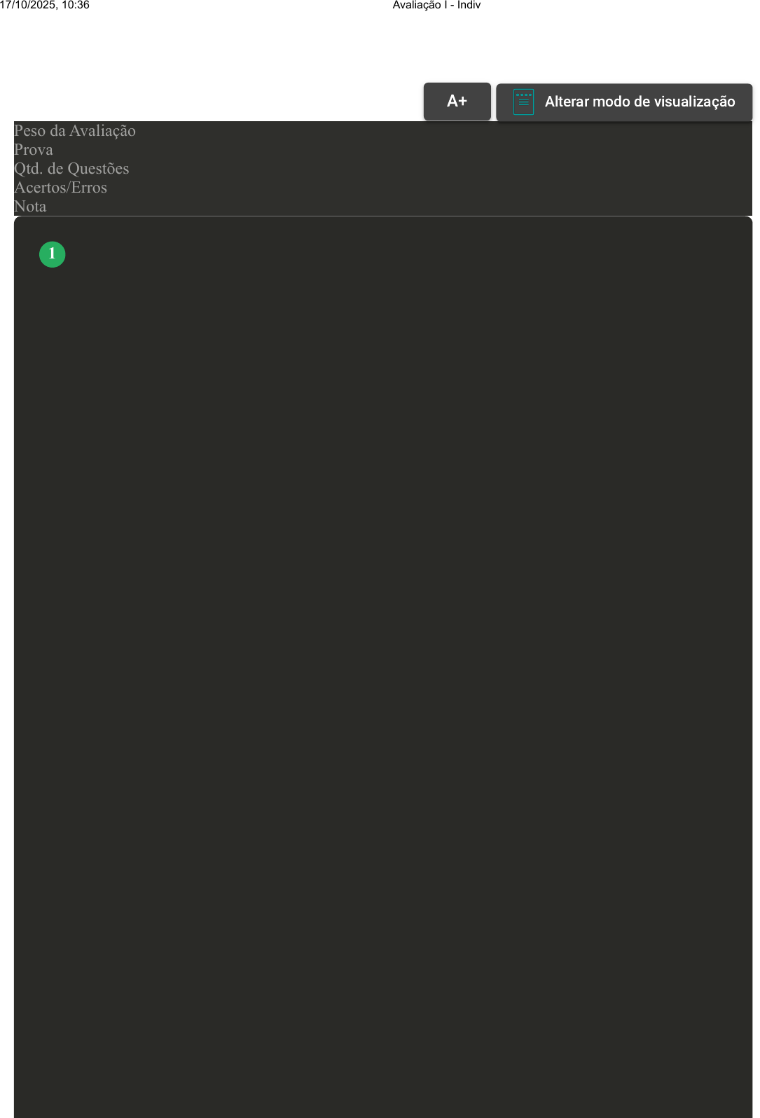 Prova Impressa GABARITO | Avaliação I - Individual (Cod.:987139) Peso da Avaliação 2,00 Prova 90852706 Qtd. de Questões 10 Acertos/Erros 9/1 Nota 9,00 “Um exame de urina – Elementos Anormais do Sedimento – EAS em um laboratório clínico compreende um grupo de testes físicos, químicos e microscópicos, que visam detectar e/ou medir as várias substâncias na urina, como subprodutos do metabolismo normal e anormal, células, fragmentos celulares e bactérias. A urina é produzida pelos rins, dois órgãos do tamanho de um punho localizados em cada lado da coluna, na parte inferior da caixa torácica. Eles filtram os resíduos do sangue, ajudam a regular a quantidade de água no corpo e conservam as proteínas, os eletrólitos e outros compostos que o corpo pode reutilizar. Tudo o que não é necessário é eliminado na urina, indo dos rins, através dos ureteres, para a bexiga e, em seguida, através da uretra, para fora do corpo. A urina é geralmente amarela e relativamente clara, mas cada vez que uma pessoa urina, a cor, a quantidade, a concentração e o conteúdo da urina serão ligeiramente diferentes por causa da variação dos constituintes. Muitos distúrbios podem ser detectados em seus estágios iniciais, identificando as substâncias que normalmente não estão presentes na urina e/ou medindo níveis anormais de certas substâncias.” Sobre o exposto, classifique V para as sentenças verdadeiras e F para as falsas: ( ) Alguns laboratórios têm deixado de analisar e registrar a coloração urinária. ( ) Qualquer cor “anormal” deverá ser relatada nos laudos. ( ) A urina pode apresentar-se turva devido à precipitação de fosfatos amorfos em meio alcalino. ( ) Em amostras de urina ácidas, pode ocorrer a precipitação de uratos e a amostra apresentar-se turva. Assinale a alternativa que apresenta a sequência CORRETA: Fonte: https://revistaadnormas.com.br/2021/11/30/os-procedimentos-para-a-realizacao-do-exame-de- urina-no-laboratorio-clinico. Acesso em: 15 nov. 2022. A F - F - F - V. B V - V - F - F. VOLTAR A+ Alterar modo de visualização 1 17/10/2025, 10:36 Avaliação I - Individual about:blank 1/9 C V - V - V - V. D F - F - V - F. “Atualmente, sabe-se que 95% da urina é água, 3% é ureia (composto que surge da quebra de proteínas somado a sódio, creatinina, potássio e cloro), mas há milhares de outros componentes em concentrações pequenas. Inclusive, é possível urinar pedras do rim quando elas são pequenas o suficiente. Todos os dias, o corpo produz entre 2 e 2,5 litros de urina. Ela não depende só da ingestão de líquidos: frutas e vegetais também são ricos em água e contribuem para compor o xixi. Em média, uma pessoa precisa fazer o ‘número 1’ sete vezes por dia, e cada jato dura em média 7 segundos. Isso, é claro, varia conforme a ingestão de comida e líquidos.” Sobre o exposto, classifique V para as sentenças verdadeiras e F para as falsas: ( ) A urina pode ser classificada quanto a sua aparência física, composição química e também através de análises microscópicas. ( ) Dentre os parâmetros físicos, a urina pode ser classificada quanto à cor, odor clareza e volume. ( ) Dentre os parâmetros químicos temos a identificação de proteínas, células sanguíneas, glicose, pH, bilirrubina, urobinogênio, corpos cetônicos, nitritos e esterase leucocitária. ( ) Os exames de urina podem detectar: desidratação, nefrites, infecções, tumores, diabetes, hipertensão, doenças metabólicas, litíase, entre outras enfermidades. Assinale a alternativa que apresenta a sequência CORRETA: Fonte: https://revistagalileu.globo.com/Ciencia/Saude/noticia/2020/01/6-informacoes-inusitadas- sobre-o-xixi.html. Acesso em: 15 nov. 2022. A F - V - V - F. B V - F - F - V. C V - V - V - V. 2 17/10/2025, 10:36 Avaliação I - Individual about:blank 2/9 D F - F - V - F. “Uma análise de urina completa consiste em três fases distintas de teste: exame visual que avalia a cor e clareza da urina; exame químico que testa quimicamente cerca de nove substâncias que fornecem informações valiosas sobre saúde e doença e determina a concentração da urina; e um exame microscópico para identificar e contar o tipo de células, cilindros, cristais e outros componentes, como bactérias e muco, que podem estar presentes na urina. Um exame microscópico é normalmente realizado quando há um achado anormal no exame visual ou químico, ou se um profissional de saúde o solicitar especificamente. Achados anormais em uma urina podem levar à repetição do teste para ver se os resultados ainda estão anormais e/ou podem ser seguidos por exames adicionais, como por exemplo no sangue, para ajudar a estabelecer um diagnóstico. Os profissionais responsáveis pela análise devem entender os critérios e os requisitos para a realização do EAS no laboratório clínico, para que os profissionais estabeleçam e apliquem as diretrizes padronizadas na execução do processo.” Sobre o exposto, classifique V para as sentenças verdadeiras e F para as falsas: ( ) Apesar de não ser rotina, o odor da urina pode ser uma observação importante. ( ) A presença de cetonas na urina pode ser responsável pelo odor doce da amostra. ( ) A presença de bactérias na amostra de urina pode provocar odor frutado na amostra. ( ) A presença de odor de amônia na amostra de urina é um indicativo de microbiota normal. Assinale a alternativa que apresenta a sequência CORRETA: Fonte: https://revistaadnormas.com.br/2021/11/30/os-procedimentos-para-a-realizacao-do-exame-de- urina-no-laboratorio-clinico. Acesso em: 15 nov. 2022. A V - V - F - F. B F - V - F - V. C F - F - V - V. D V - F - V - F. 3 17/10/2025, 10:36 Avaliação I - Individual about:blank 3/9 O sistema urinário é constituído pelos órgãos uropoéticos, isto é, incumbidos de elaborar a urina e armazená-la temporariamente até a oportunidade de ser eliminada para o exterior. Na urina encontramos 