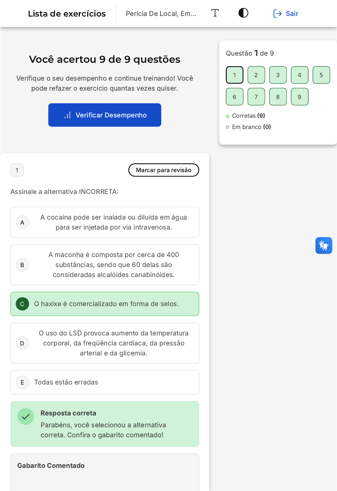 Você acertou 9 de 9 questões Verifique o seu desempenho e continue treinando! Você pode refazer o exercício quantas vezes quiser. Verificar Desempenho A B C D E 1 Marcar para revisão Assinale a alternativa INCORRETA: A cocaína pode ser inalada ou diluída em água para ser injetada por via intravenosa. A maconha é composta por cerca de 400 substâncias, sendo que 60 delas são consideradas alcalóides canabinóides. O haxixe é comercializado em forma de selos. O uso do LSD provoca aumento da temperatura corporal, da freqüência cardíaca, da pressão arterial e da glicemia. Todas estão erradas Resposta correta Parabéns, você selecionou a alternativa correta. Confira o gabarito comentado! Gabarito Comentado Questão 1 de 9 Corretas (9) Em branco (0) 1 2 3 4 5 6 7 8 9 Lista de exercícios Perícia De Local, Em… Sair A B C D E O haxixe é comercializado em forma de selos. 2 Marcar para revisão Para a realização do exame de balística o perito deve: Verificar aspectos como a trajetória do projétil somente no local do crime. Verificar a posição do atirador no local do crime e após o exame balístico no laboratório. Verificar aspectos como a trajetória do projétil, a distância percorrida, a posição do atirador no local do crime e depois fazer a balística no laboratório. Nenhuma das anteriores. Verificar nas mãos do suspeito se há vestígios de pólvora. Resposta correta Parabéns, você selecionou a alternativa correta. Confira o gabarito comentado! Gabarito Comentado Verificar aspectos como a trajetória do projétil, a distância percorrida, a posição do atirador no local do crime e depois fazer a balística no laboratório. 3 Marcar para revisão As geladuras são pouco comuns em regiões tropicais como o Brasil. Elas são lesões que a ação do frio pode provocar A B C D E no corpo da vítima. Sobre as geladuras, elas podem provocar as seguintes reações, exceto: Insônia. Convulsões. Delírios. Sonolência Cngestão. Resposta correta Parabéns, você selecionou a alternativa correta. Confira o gabarito comentado! Gabarito Comentado A resposta correta é: Insônia. Nas geladuras, as lesões são provocadas pela ação do frio sobre a pele da vítima. Pouco comuns em países tropicais como o Brasil, as geladuras podem provocar: alterações do sistema nervoso, sonolência, convulsões, delírios, perturbações dos movimentos, anestesias, congestão ou isquemia das vísceras. Em casos extremos, podem levar à morte. 4 Marcar para revisão Obtida a partir das folhas e flores secas da planta cannabis sativa, normalmente é consumida sob a forma de fumo e é composta por cerca de 400 substâncias, sendo que 60 delas são consideradas alcalóides canabinóides. Estamos falando da droga ilícita denominada: A B C D E A B C Cloridrato de Cocaína. Anfetamína. Maconha. Nicotina. Ecstasy. Resposta correta Parabéns, você selecionou a alternativa correta. Confira o gabarito comentado! Gabarito Comentado A resposta correta é: Maconha. 5 Marcar para revisão EM RELAÇÃO A IMPRENSA EM GERAL O PERITO DEVE: Deve o perito adiantar à imprensa qualquer informação sobre o trabalho no local Sempre que possível, encaminhando a entrevista para a Autoridade Policial para que, se assim o entender, conceda as entrevistas. O direito da imprensa informar é mais importante que o sigilo no Inquérito, mas mesmo assim o contato com a imprensa deve ser feito de forma mais cautelosa possível, D E A B C O contato com a imprensa deve ser feito somente no local da cene de crime. Todas estão corretas Resposta correta Parabéns, você selecionou a alternativa correta. Confira o gabarito comentado! Gabarito Comentado Sempre que possível, encaminhando a entrevista para a Autoridade Policial para que, se assim o entender, conceda as entrevistas. 6 Marcar para revisão Sobre os vários exames de balística, assinale a alternativa INCORRETA: Pelo exame de eficiência, o perito identifica a arma, descreve suas características e estrutura e avalia sua eficiência e resultados. O exame de segurança visa esclarecer se houve disparo acidental através da análise da eficiência dos mecanismos de segurança da arma, confirmando ou descartando assim a possibilidade da ocorrência de um disparo acidental. No exame metalográfico, é utilizado um microscópio denominado Microcomparador balístico D E A B C D E No exame de comparação, o perito determina se há compatibilidade entre o projétil disparado e a arma que em tese foi utilizada para efetuar esse disparo. Todas estão corretas Resposta correta Parabéns, você selecionou a alternativa correta. Confira o gabarito comentado! Gabarito Comentado No exame metalográfico, é utilizado um microscópio denominado Microcomparador balístico 7 Marcar para revisão ELETROPLESSÃO é: O dano corporal provocado pela ação do calor no organismo. O dano corporal provocado pela ação da chuva no organismo. O dano corporal provocado pela ação da corrente elétrica no organismo, O dano corporal provocado pela ação do frio no organismo, . Todas as anteriores A B C D E Resposta correta Parabéns, você selecionou a alternativa correta. Confira o gabarito comentado! Gabarito Comentado O dano corporal provocado pela ação da corrente elétrica no organismo, 8 Marcar para revisão Trata-se de um documento que somente pode ser emitido por um médico e cuja finalidade consiste em confirmar a morte, determinar suas causas e dessa forma suprir interesses de ordem civil, estatística, demográfica e sanitária. É o chamado: Consulta Médico-Legal. Notificação de Perícia Médico Legal. Relatório Médico Legal. Atestado de óbito. Histórico de óbito. Resposta correta Parabéns, você selecionou a alternativa correta. Confira o gabarito comentado! Gabarito Comentado A resposta correta é: Atestado de óbito. A B C D E 9 Marcar para revisão São equipamentos afetos ao perito para realização do seu trabalho num local de crime, EXCETO: Notebook e