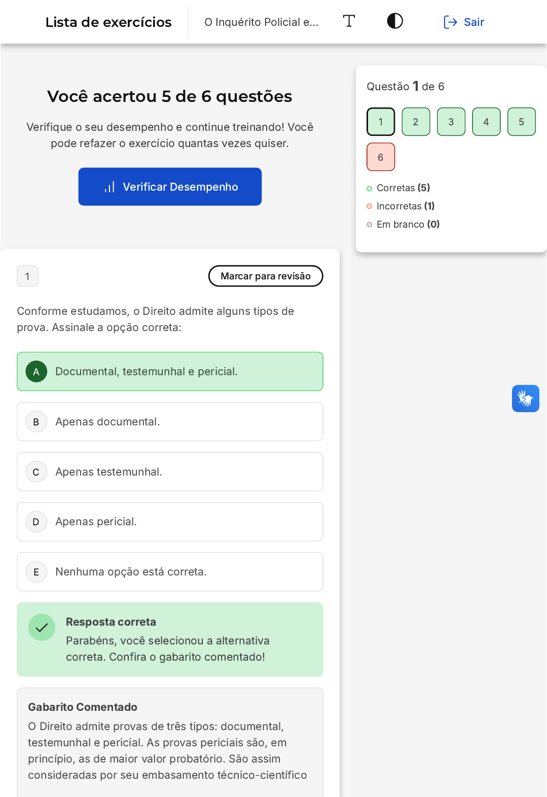 Você acertou 5 de 6 questões Verifique o seu desempenho e continue treinando! Você pode refazer o exercício quantas vezes quiser. Verificar Desempenho A B C D E 1 Marcar para revisão Conforme estudamos, o Direito admite alguns tipos de prova. Assinale a opção correta: Documental, testemunhal e pericial. Apenas documental. Apenas testemunhal. Apenas pericial. Nenhuma opção está correta. Resposta correta Parabéns, você selecionou a alternativa correta. Confira o gabarito comentado! Gabarito Comentado O Direito admite provas de três tipos: documental, testemunhal e pericial. As provas periciais são, em princípio, as de maior valor probatório. São assim consideradas por seu embasamento técnico-científico Questão 1 de 6 Corretas (5) Incorretas (1) Em branco (0) 1 2 3 4 5 6 Lista de exercícios O Inquérito Policial e… Sair A B C D E e pela imparcialidade que o perito deve ter em relação ao caso. 2 Marcar para revisão Assinale a opção correspondente à técnica em que duas pessoas são colocadas frente a frente para esclarecer divergências em seus depoimentos: Acareação. Busca e Apreensão Infiltração. Campana Nenhum deles Resposta correta Parabéns, você selecionou a alternativa correta. Confira o gabarito comentado! Gabarito Comentado Acareação. 3 Marcar para revisão Assinale a (as) assertiva (as) que definem a Cadeia de custódia : I - é o registro cronológico do histórico de procedimentos e de eventos a que uma determinada prova foi submetida desde o momento da coleta até sua apresentação em juízo. A B C D E II - é o registro de toda a sequência de posse de determinada prova. III - " (...) sequência de proteção ou guarda dos elementos materiais encontrados durante uma investigação e que devem manter resguardadas as suas características originais e informações sem qualquer dúvida sobre a sua origem e manuseios (ESPÍNDULA apud LEONARDO,2010). As assertivas I, II e III. Apenas as assertivas I e II . Apenas a assertiva I. Apenas a assertiva II Apenas a assertiva III Resposta correta Parabéns, você selecionou a alternativa correta. Confira o gabarito comentado! Gabarito Comentado As assertivas I, II e III. 4 Marcar para revisão Dentre os vários tipos de prova produzidos durante a investigação criminal, as provas periciais são consideradas com maior valor probatório por que: A B C D E Para que os advogados de defesa não consigam relaxar o flagrante Pela necessidade de se ter provas periciais em todos os processos Pelo fato de que as testemunhas sempre mentem ao depor Por seu embasamento técnico-científico e pela imparcialidade que deve ter o perito em relação ao caso Pelo alto custo envolvido na produção dos Laudos Periciais Resposta correta Parabéns, você selecionou a alternativa correta. Confira o gabarito comentado! Gabarito Comentado A resposta correta é: Por seu embasamento técnico- científico e pela imparcialidade que deve ter o perito em relação ao caso 5 Marcar para revisão Com relação à cadeia de custódia da prova, assinale a alternativa INCORRETA: A B C D E Ao colher o material, o perito deve fazer constar registro do local exato onde foi encontrado e fotografado, nos termos no artigo 170 do CPP. O registro, documentação e fotografia da prova e do local em que ela se encontra precede, naturalmente, qualquer ação de manuseio ou coleta. Se a origem da prova puder ser colocada em dúvida, esse fato não afetaré a integridade dos demais elos da cadeia de custódia. Embora normalmente seja iniciada pelo perito, a manutenção da Cadeia de Custódia é de responsabilidade de vários profissionais. Todas estão erradas Resposta correta Parabéns, você selecionou a alternativa correta. Confira o gabarito comentado! Gabarito Comentado Se a origem da prova puder ser colocada em dúvida, esse fato não afetaré a integridade dos demais elos da cadeia de custódia. 6 Marcar para revisão A aplicação do Principio da Discricionariedade: A B C D E Quer dizer que o Perito Criminal somente age mediante ordem do ministério Público. Não se aplica ao Inquérito Policial, somente ao processo penal. Está vinculada à mera arbitrariedade da Autoridade Policial ou de seus agentes. Está vinculada aos limites legais. Todas estão corretas Resposta incorreta Opa! A alternativa correta é a letra D. Confira o gabarito comentado! Gabarito Comentado Está vinculada aos limites legais.
