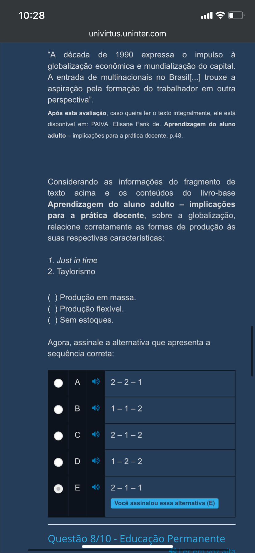10:28 univirtus.uninter.com década de 1990 expressa impulso à globalização econômica e mundialização do capital. A entrada de multinacionais no Brasil[...] trouxe a aspiração pela formação do trabalhador em outra perspectiva". Após esta avaliação, caso queira ler texto integralmente, ele está disponível em: PAIVA, Elisane Fank de. Aprendizagem do aluno adulto - implicações para a prática docente. p.48. Considerando as informações do fragmento de texto acima e os conteúdos do livro-base Aprendizagem do aluno adulto - implicações para a prática docente, sobre a globalização, relacione corretamente as formas de produção às suas respectivas características: 1. Just in time 2. Taylorismo Produção em massa. Produção flexível. Sem estoques. Agora, assinale a alternativa que apresenta a sequência correta: A 2-2-1 1-1-2 2-1-2 D 1-2-2 E Você assinalou essa alternativa (E) Questão 8/10 Educação Permanente