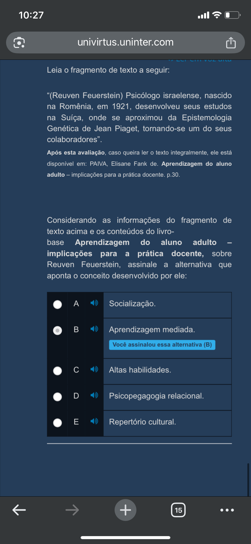 10:27 Leia fragmento de texto a seguir: "(Reuven Feuerstein) Psicólogo israelense, nascido na Romênia, em 1921, desenvolveu seus estudos na Suíça, onde se aproximou da Epistemologia Genética de Jean Piaget, tornando-se um do seus colaboradores". Após esta avaliação, caso queira ler texto integralmente, ele está disponível em: PAIVA, Elisane Fank de. Aprendizagem do aluno adulto - implicações para a prática docente. p.30. Considerando as informações do fragmento de texto acima e os conteúdos do livro- base Aprendizagem do aluno adulto - implicações para a prática docente, sobre Reuven Feuerstein, assinale a alternativa que aponta conceito desenvolvido por ele: A Socialização. Aprendizagem mediada. Você assinalou essa alternativa (B) Altas habilidades. D Psicopegagogia relacional. E Repertório cultural. + 15