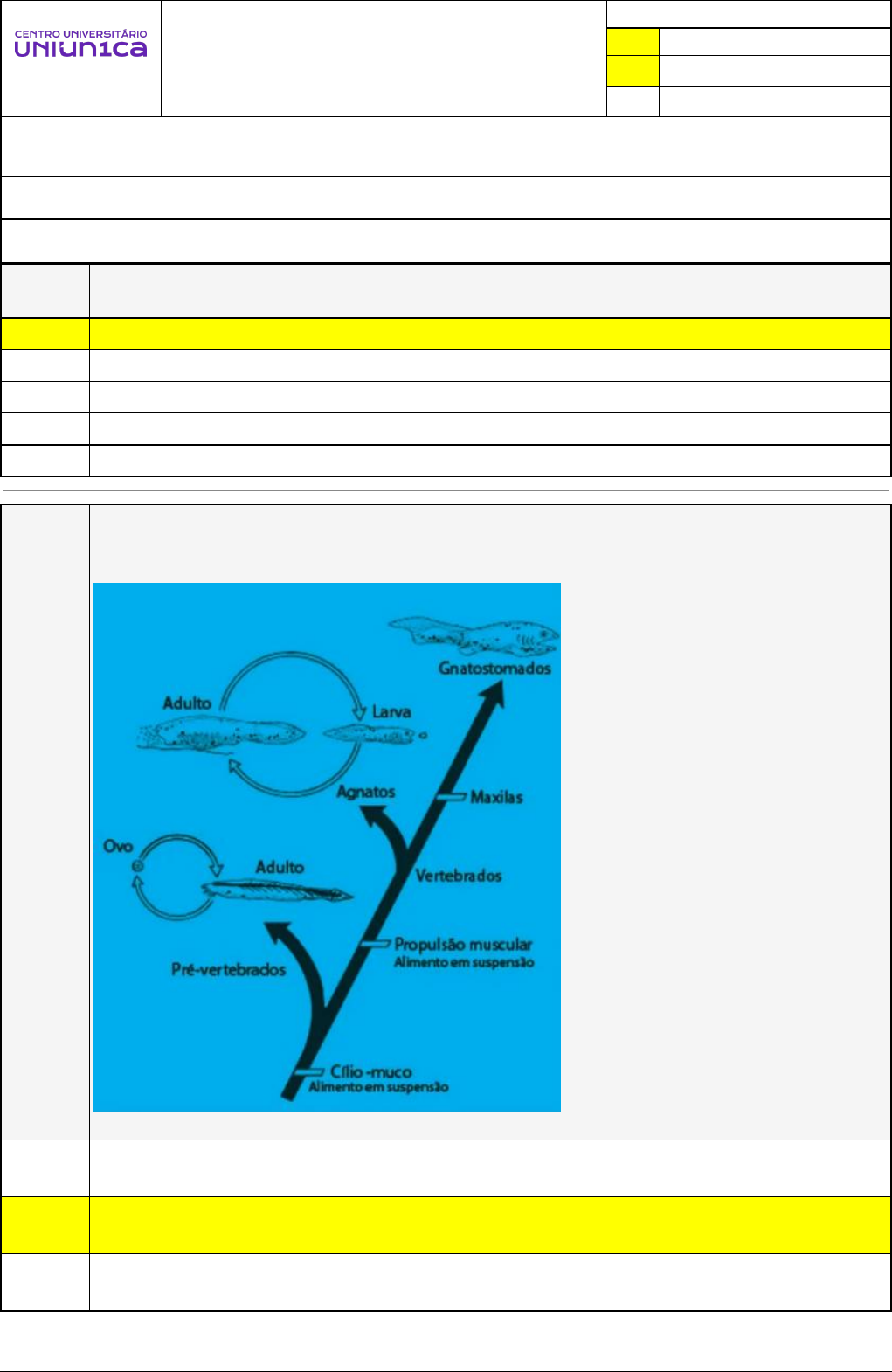 Pincel Atômico - 17/10/2025 10:47:18 1/7 VANIA CRISTINA DE SOUZA CARRAPITO Avaliação Online - Capitulos/Referencias 1,2,3,4,5,6 (Curso Online - Automático) Atividade finalizada em 12/10/2025 12:04:14 (3754801 / 1) LEGENDA Resposta correta na questão # Resposta correta - Questão Anulada X Resposta selecionada pelo Aluno Disciplina: VERTEBRADOS: FUNDAMENTOS DE ZOOLOGIA E ANATOMIA COMPARADA [1594356] - Avaliação com 20 questões, com o peso total de 50,00 pontos [capítulos - 1,2,3,4,5,6] Turma: Segunda Graduação: Licenciatura em Ciências Biológicas p/ Licenciados - Grupo: MARÇO/2025 - SGice0A140325 [165782] Aluno(a): 91532546 - VANIA CRISTINA DE SOUZA CARRAPITO - Respondeu 20 questões corretas, obtendo um total de 50,00 pontos como nota [372023_25] Questão 001 Os Chordata são classificados como um grupo de origem evolutiva? X Monofilético. Parafílico. Dioico. Nenhuma das alternativas. Monoico. [372023_19] Questão 002 A hipótese da história evolutiva dos vertebrados, de maneira simples, pode ser dividida em três momentos: pré-vertebrados, ágnatos (sem mandíbulas) e gnatostomados (com mandíbulas), como apresentado na figura a seguir. Com base na análise da imagem apresentada, é correto afirmar que: Nos animais ágnatos viventes (peixes bruxas e lampreias), a sucção é mais eficiente com uma faringe muscular pouco expansível. X O ciclo de vida dos animais ágnatos (peixes bruxas e lampreias) apresenta uma fase larval, cuja alimentação é baseada na filtração de partículas suspensas. Os primeiros vertebrados apresentavam um sistema de bombeamento e filtração eficientes em busca ativa de recursos alimentares. Pincel Atômico - 17/10/2025 10:47:18 2/7 Na base do cladograma apresenta-se uma característica exclusiva (sinapomorfia) a todos os vertebrados viventes. O surgimento das maxilas nos gnatostomados está associado à busca passiva de recursos alimentares. [372023_31] Questão 003 (UEM/2017) Não é lenda: os peixes elétricos existem e têm, sim, a capacidade de dar choques até com alta voltagem. Existem no Brasil e são conhecidos também como “poraquê” (em tupi, significa “o que coloca para dormir”). Sobre o assunto, assinale o que for correto. 01) As escamas do poraquê detectam os estímulos ambientais e os convertem em energia mecânica. 02) O poraquê pode ser comparado a uma pilha. 04) A corrente elétrica que o poraquê gera é do tipo contínua. 08) Ao serem estimuladas, as células especializadas do poraquê descarregam simultaneamente um potencial de ação semelhante ao dos neurônios. 16) As células especializadas se posicionam como baterias em paralelo, assim somam seus potenciais, liberando uma descarga considerável. A soma das respostas corretas é: 6 18 X 14 20 30 [372023_12] Questão 004 (FAMAERP - 2018) As aves e os mamíferos podem habitar uma grande amplitude de áreas terrestres. São encontrados em regiões de altitudes muito elevadas, assim como em regiões de altas latitudes. As aves e os mamíferos são capazes de sobreviver nesses ambientes por possuírem Esqueleto ósseo resistente. Circulação fechada. X Endotermia. Pele queratinizada. Anexos embrionários. [372023_30] Questão 005 (UFRGS/2017) Recife é considerada a capital dos naufrágios no Brasil, devido à grande quantidade de navios submersos que estão à disposição dos mergulhadores. Considere as seguintes afirmações referentes às consequências locais ocasionadas por esses eventos. I. As embarcações permitem o estabelecimento de uma cadeia alimentar e de relações ecológicas entre as espécies marinhas. II. Os crustáceos adultos não conseguem prender-se à superfície das embarcações. III. Os peixes cartilaginosos podem utilizar essas áreas como refúgio e habitat, por apresentarem bexiga natatória. Quais estão corretas? I, II e III. Apenas II. Apenas I. Apenas I e III. Pincel Atômico - 17/10/2025 10:47:18 3/7 X Apenas III. [372023_22] Questão 006 (ENADE) Os fósseis servem como confirmação de que a evolução é fonte da biodiversidade por permitirem, entre outros, a observação de caracteres compartilhados por grupos de organismos. Com relação à utilização de fósseis de plantas para a confirmação da evolução dos grupos vegetais, avalie as seguintes asserções. É possível observar uma discordância entre o registro fóssil e o que propõe a filogenia em termos de período de origem e graus de complexidade. PORQUE O registro fóssil apresenta hiatos deposicionais, que não permitem preencher todos os degraus das linhas evolutivas inferidas pela filogenia. A respeito dessas asserções, assinale a opção correta. A primeira asserção é uma proposição falsa, e a segunda, uma proposição verdadeira. As duas asserções são proposições verdadeiras, mas a segunda não é uma justificativa correta da primeira. X As duas asserções são proposições verdadeiras, e a segunda é uma justificativa correta da primeira. Tanto a primeira quanto a segunda asserções são proposições falsas. A primeira asserção é uma proposição verdadeira, e a segunda, uma proposição falsa. Pincel Atômico - 17/10/2025 10:47:18 4/7 [372023_29] Questão 007 (ENADE) A maioria dos peixes teleósteos é ectoterma, porém algumas espécies de Scombroidei apresentam endotermia. Duas estratégias distintas evoluíram nos Scombroidei, cuja filogenia é apresentada abaixo: os marlins (espécies 1 a 6) e as cavalas (espécie 14) possuem endotermia cranial (C), aquecendo apenas o cérebro e os olhos; os atuns (espécies 7 a 12) apresentam endotermia sistêmica (S), semelhante às aves e mamíferos com altas taxas metabólicas e redução da condutividade térmica corpórea. Os peixes das demais espécies são ectotermos (E). É correto afirmar que a endotermia: X Evoluiu pelo menos três vezes no grupo, o que sugere seu caráter adaptativo. É uma tendência evolutiva de Scombroidei e no futuro todos serão endotermos. É uma autoapomorfia