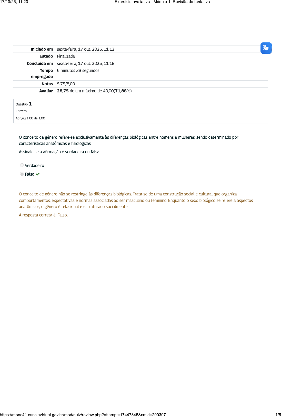 17/10/25, 11:20 Exercício avaliativo Módulo 1: Revisão da tentativa Iniciado em sexta-feira, 17 out. 2025, 11:12 Estado Finalizada Concluída em sexta-feira, 17 out. 2025, 11:18 Tempo 6 minutos 38 segundos empregado Notas 5,75/8,00 Avaliar 28,75 de um máximo de 40,00(71,88%) Questão 1 Correto Atingiu 1,00 de 1,00 conceito de gênero refere-se exclusivamente às diferenças biológicas entre homens e mulheres, sendo determinado por características anatômicas e fisiológicas. Assinale se a afirmação é verdadeira ou falsa. Verdadeiro Falso conceito de gênero não se restringe às diferenças biológicas. Trata-se de uma construção social e cultural que organiza comportamentos, expectativas e normas associadas ao ser masculino ou feminino. Enquanto 0 sexo biológico se refere a aspectos anatômicos, 0 gênero é relacional e estruturado socialmente. A resposta correta é 'Falso'. 1/517/10/25, 11:20 Exercício avaliativo Módulo 1: Revisão da tentativa Questão 2 Correto Atingiu 1,00 de 1,00 Estereótipos de gênero são ideias generalizadas e, muitas vezes, limitantes sobre que homens e mulheres "devem" ser ou fazer. Eles não refletem diferenças naturais, mas são aprendidos socialmente. Leia as frases abaixo e marque V (verdadeiro) ou F (falso): a. Mulheres são naturalmente mais cuidadoras do que os homens. Falso b. Papéis de gênero são construções sociais e podem variar entre culturas e ao longo do tempo. Verdadeiro C. Homens são biologicamente mais racionais e menos emocionais do que mulheres. Falso d. Estereótipos de gênero podem limitar escolhas profissionais e pessoais. Verdadeiro e. Meninas devem brincar com bonecas e meninos com carrinhos para se desenvolverem adequadamente. Falso f. Todos seres humanos sentem emoções, independentemente do gênero. Verdadeiro Sua resposta está correta. Estereótipos de gênero são aprendidos culturalmente e não têm base biológica. Eles reforçam desigualdades, limitam a liberdade de escolha e podem gerar discriminação. Reconhecer esses padrões e questioná-los é essencial para a promoção da igualdade de gênero e dos direitos humanos. A resposta correta é: a. Mulheres são naturalmente mais cuidadoras do que homens. Falso, b. Papéis de gênero são construções sociais e podem variar entre culturas e ao longo do tempo. Verdadeiro, Homens são biologicamente mais racionais e menos emocionais do que mulheres. Falso, d. Estereótipos de gênero podem limitar escolhas profissionais e pessoais. Verdadeiro, e. Meninas devem brincar com bonecas e meninos com carrinhos para se desenvolverem adequadamente. Falso, f. Todos os seres humanos sentem emoções, independentemente do gênero. Verdadeiro. Questão 3 Incorreto Atingiu 0,00 de 1,00 Uma característica fundamental que distingue a Violência Baseada no Gênero de outras formas de violência é: Assinale a alternativa correta. a. Sua ocorrência exclusiva na esfera doméstica. b. A motivação vinculada ao gênero da sobrevivente. C. A inexistência de impactos emocionais sobre as sobreviventes. d. A ausência de relação com normas sociais e culturais. Sua resposta está incorreta. A Violência Baseada no Gênero tem como marcador específico gênero da sobrevivente ou a violação das normas de gênero. Ela busca punir e controlar comportamentos que desafiam expectativas sociais sobre papéis e identidades de gênero. A resposta correta é: A motivação vinculada ao gênero da sobrevivente. 2/517/10/25, 11:20 Exercício avaliativo Módulo 1: Revisão da tentativa Questão 4 Correto Atingiu 1,00 de 1,00 ciclo da violência doméstica é composto, frequentemente, por três fases: tensão, agressão e reconciliação. Assinale se a afirmação é verdadeira ou falsa. Verdadeiro Falso A violência doméstica frequentemente segue um padrão cíclico, dificultando rompimento da sobrevivente com a relação abusiva. A fase de reconciliação pode gerar confusão emocional e esperança de mudança, mantendo ciclo violento. A resposta correta é 'Verdadeiro'. Questão 5 Correto Atingiu 1,00 de 1,00 A interseccionalidade permite compreender que as experiências de Violência Baseada no Gênero são vividas de forma homogênea por todas as mulheres, independentemente de sua raça, classe social ou deficiência. Assinale se a afirmação é verdadeira ou falsa. Verdadeiro Falso A interseccionalidade revela que as experiências de Violência Baseada no Gênero variam de acordo com a combinação de múltiplos marcadores sociais, como raça, deficiência, classe e território. Por isso, as mulheres vivenciam diferentes níveis e formas de vulnerabilidade. A resposta correta é 'Falso'. 3/517/10/25, 11:20 Exercício avaliativo Módulo 1: Revisão da tentativa Questão 6 Incorreto Atingiu 0,00 de 1,00 No enfrentamento à Violência Baseada no Gênero, a adoção da perspectiva interseccional implica em: Assinale a alternativa correta. a. Oferecer serviços uniformes, que atendam igualmente a todos os públicos, independentemente de suas especificidades. b. Considerar as especificidades de cada grupo, escutar as experiências diversas e adequar os serviços de proteção às diferentes realidades sociais. Restringir atendimento aos casos de maior gravidade física. d. Focar exclusivamente em medidas legais punitivas, desconsiderando os contextos sociais e econômicos das sobreviventes. Sua resposta está incorreta. Adotar a interseccionalidade exige 0 reconhecimento das diferentes experiências de vulnerabilidade, garantindo serviços sensíveis, acessíveis e adequados à diversidade de realidades sociais, para a promoção efetiva da justiça social. A resposta correta é: Considerar as especificidades de cada grupo, escutar as experiências diversas e adequar serviços de proteção às diferentes realidades sociais. Questão 7 Correto Atingiu 1,00 de 1,00 Em relação aos impactos psicossociais da Violência Baseada no Gênero, é correto afirmar que: Assinale a alternativa
