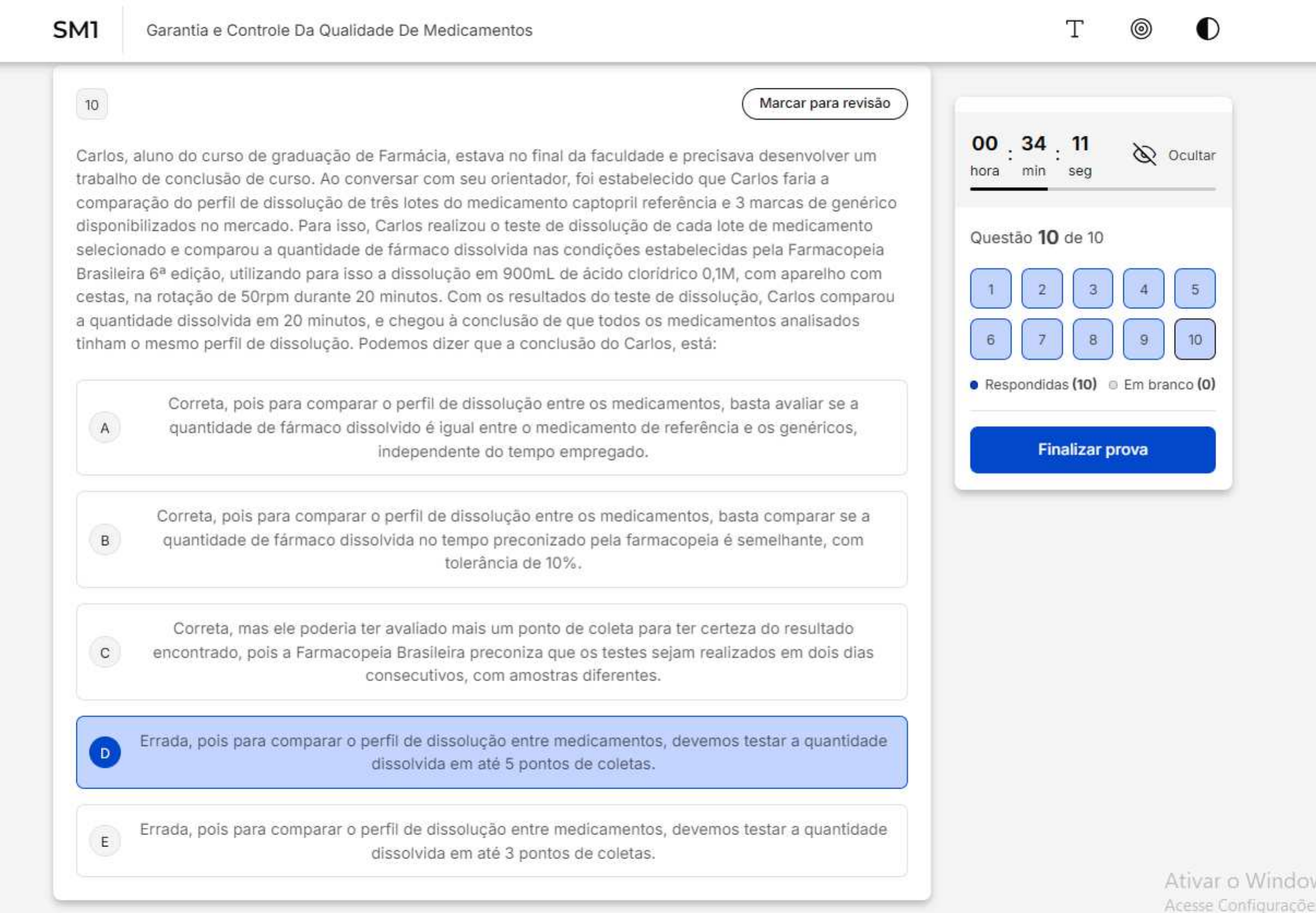 SM1 Garantia e Controle Da Qualidade De Medicamentos T 10 Marcar para revisão 00 34 11 Carlos, aluno do curso de graduação de Farmácia, estava no final da faculdade e precisava desenvolver um Ocultar trabalho de conclusão de curso. Ao conversar com seu orientador, foi estabelecido que Carlos faria a hora min seg comparação do perfil de dissolução de três lotes do medicamento captopril referência e 3 marcas de genérico disponibilizados no mercado. Para isso, Carlos realizou teste de dissolução de cada lote de medicamento Questão 10 de 10 selecionado e comparou a quantidade de fármaco dissolvida nas condições estabelecidas pela Farmacopeia Brasileira edição, utilizando para isso a dissolução em 900mL de ácido cloridrico 0,1M, com aparelho com 1 2 3 4 5 cestas, na rotação de 50rpm durante 20 minutos. Com os resultados do teste de dissolução, Carlos comparou a quantidade dissolvida em 20 minutos, e chegou à conclusão de que todos os medicamentos analisados tinham mesmo perfil de dissolução. Podemos dizer que a conclusão do Carlos, está: 6 7 8 9 10 Respondidas (10) Em branco (0) Correta, pois para comparar perfil de dissolução entre os medicamentos, basta avaliar se a A quantidade de fármaco dissolvido é igual entre 0 medicamento de referência e os genéricos, independente do tempo empregado. Finalizar prova Correta, pois para comparar perfil de dissolução entre os medicamentos, basta comparar se a quantidade de fármaco dissolvida no tempo preconizado pela farmacopeia é semelhante, com tolerância de 10%. Correta, mas ele poderia ter avaliado mais um ponto de coleta para ter certeza do resultado C encontrado, pois a Farmacopeia Brasileira preconiza que os testes sejam realizados em dois dias consecutivos, com amostras diferentes. Errada, pois para comparar perfil de dissolução entre medicamentos, devemos testar a quantidade D dissolvida em até 5 pontos de coletas. Errada, pois para comparar perfil de dissolução entre medicamentos, devemos testar a quantidade E dissolvida em até 3 pontos de coletas. Ativar Windov Acesse00 : 32 : 58 Ocultar 9 Marcar para revisão hora min seg 0 pH de uma solução pode ser definido como a concentração de ions H* em uma preparação aquosa, e este influencia em diversos fatores responsáveis direta ou indiretamente na absorção dos fármacos desde a Questão 9 de 10 estabilidade da sua preparação até a constante de ionização (pKa) de um princípio ativo. Sobre esse assunto, analise a relação entre as assertivas a seguir: 1 2 3 4 5 Nos medicamentos, pH tem um papel mais significativo nas soluções aquosas frente às preparações 6 7 8 9 10 líquidas. Respondidas (10) Em branco (0) PORQUE II. A acidez e basicidade vai alterar a desintegração dessas moléculas durante a absorção. Finalizar prova A respeito dessas asserções, assinale a opção correta: A As asserções I e são proposições falsas. A asserção uma proposição verdadeira enquanto a é falsa. C As asserções e são proposições verdadeiras e a é uma justificativa da D A asserção I uma proposição falsa e a é uma proposição verdadeira. E As asserções I e são proposições verdadeiras, mas a Il não uma justificativa da Ativar 0 Windows Acesse Configurações paraSM1 Garantia e Controle Da Qualidade De Medicamentos T 8 Marcar para revisão 00 : 32 39 Ocultar hora min seg teste de desintegração é um teste que visa medir tempo que uma forma farmacêutica demora para fragmentar em menores. Sobre esse assunto, analise a situação-problema a seguir: Questão 8 de 10 João, estagiário no controle de qualidade de uma indústria farmacêutica, ficou responsável por realizar teste de desintegração com comprimidos sublinguais. Para isso, fez o teste com água morna entre 15-25°C e disse 1 2 3 4 5 ao farmacêutico que o acompanha no estágio, que 0 lote estava conforme com preconizado pela farmacopeia edição, pois os comprimidos demoraram 45 minutos para desintegrar. 6 7 8 9 10 A partir da situação-problema, que responsável do estágio orientou 0 aluno. Respondidas (10) Em branco (0) Que João estava correto, pois líquido de imersão e 0 tempo de desintegração seguiam a A farmacopeia edição; Finalizar prova Que João estava correto, mas que ele não precisaria consultar a farmacopeia edição nesse caso, uma vez que poderia confiar nos resultados anteriores. Que João estava errado, pois para comprimidos sublinguais o líquido de imersão utilizado deve ser ácido sulfúrico 1M a 25°C e tempo máximo é de 3 minutos. Que João estava errado, pois para comprimidos sublinguais de imersão utilizado deve ser D água morna à 37°C e 0 tempo máximo é de 3 minutos. Que João estava errado, pois para comprimidos sublinguais líquido de imersão utilizado deve ser E água morna à 37°C e 0 tempo máximo de 5 minutos.hora min seg 7 Marcar para revisão Questão 7 de 10 Em estatística, chamamos de parâmetro uma característica de uma determinada população. Dentre os parâmetros estatísticos, qual dos listados abaixo está relacionado com a obtenção da totalidade de dados de 1 2 3 4 uma determinada população? 6 7 8 9 A Amostragem. Respondidas (10) Em b Censo. Finalizar prova C D E Intervalo Amostral.Questão 6 de 10 6 Marcar para revisão 1 2 3 4 5 Não só escolher a técnica de amostragem é importante, mas também é necessário preparar a amostra para a recuperação do analito de uma forma farmacêutica visando evitar que outros componentes da formulação ajam 6 7 8 9 10 como interferente no método analítico. Desta forma, assinale a alternativa abaixo que represente uma técnica de recuperação de analitos: Respondidas (10) Em branco (0 A Microencapsulação de IFA. Finalizar prova Nanocristralização de fármacos. Microextração de fase sólida. D Sonicação da fase sólida. E Banho de ultrassom.1 2 3 5 Marcar para revisão 6 7 8 Dois estudantes de farmácia estavam discutindo sobre os métodos farma
