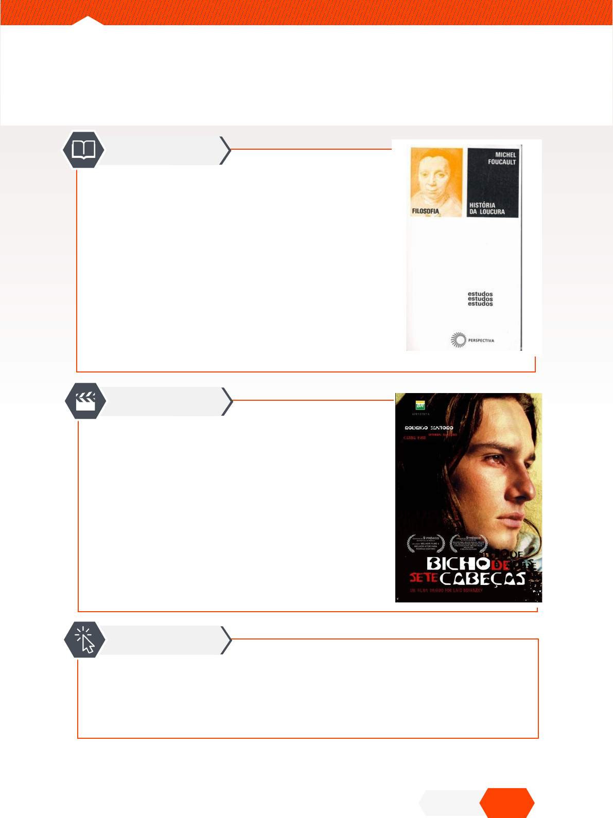 PÁGINA 49 MATERIAL COMPLEMENTAR LIVRO FILME NA WEB Título: História da Loucura Autor: Michel Foucault Editora: Perspectiva Sinopse: Este livro já é um ´clássico´ da filosofia mo- derna, não pretende fazer a história dos loucos ao lado, em presença ou no convívio das pessoas ´nor- mais´; nem a história da razão em oposição à da lou- cura. Trata-se de levantar a história dessa divisão in- cessante, porém sempre modificada - divisão que se produz através de muitas outras, como as definidas pela produção, trabalho, riqueza, estrutura familiar, pe- nalidade, coações morais etc. Título: Bicho de sete cabeças Ano: 2001 Sinopse: Seu Wilson (Othon Bastos) e seu filho Neto (Rodrigo Santoro) possuem um relacionamento difícil, com um vazio entre eles aumentando cada vez mais. Seu Wilson despreza o mundo de Neto e este não su- porta a presença do pai. A situação entre os dois atinge seu limite e Neto é enviado para um manicômio, onde terá que suportar as agruras de um sistema que lenta- mente devora suas presas. A página da web a seguir conta detalhes sobre como o tema da loucura foi visto e tratado ao longo da história. Link: PÁGINA 50 REFERÊNCIAS AMARANTE, Paulo. Saúde Mental e Atenção Psicossocial. / Paulo Amarante. Rio de Janeiro: Editora Fiocruz. 2007. Frayze-Pereira, João Augusto, 1949 - O que é loucura/ João A. Frayse- Pereira.- 10 ed. – São Paulo: Brasiliense, 1949. – (Coleção Primeiros Passos ; 73) PAULON, Simone Mainieri. Quando a cidade “escuta vozes”: o que a democracia tem a aprender com a loucura. Interface Botucatu , v. 21, n. 63, p. 775-786, Dec. 2017. SAFATLE, Vladimir. O que podemos aprender depois da “crise da psicanálise”. OoCities.org, 2005.