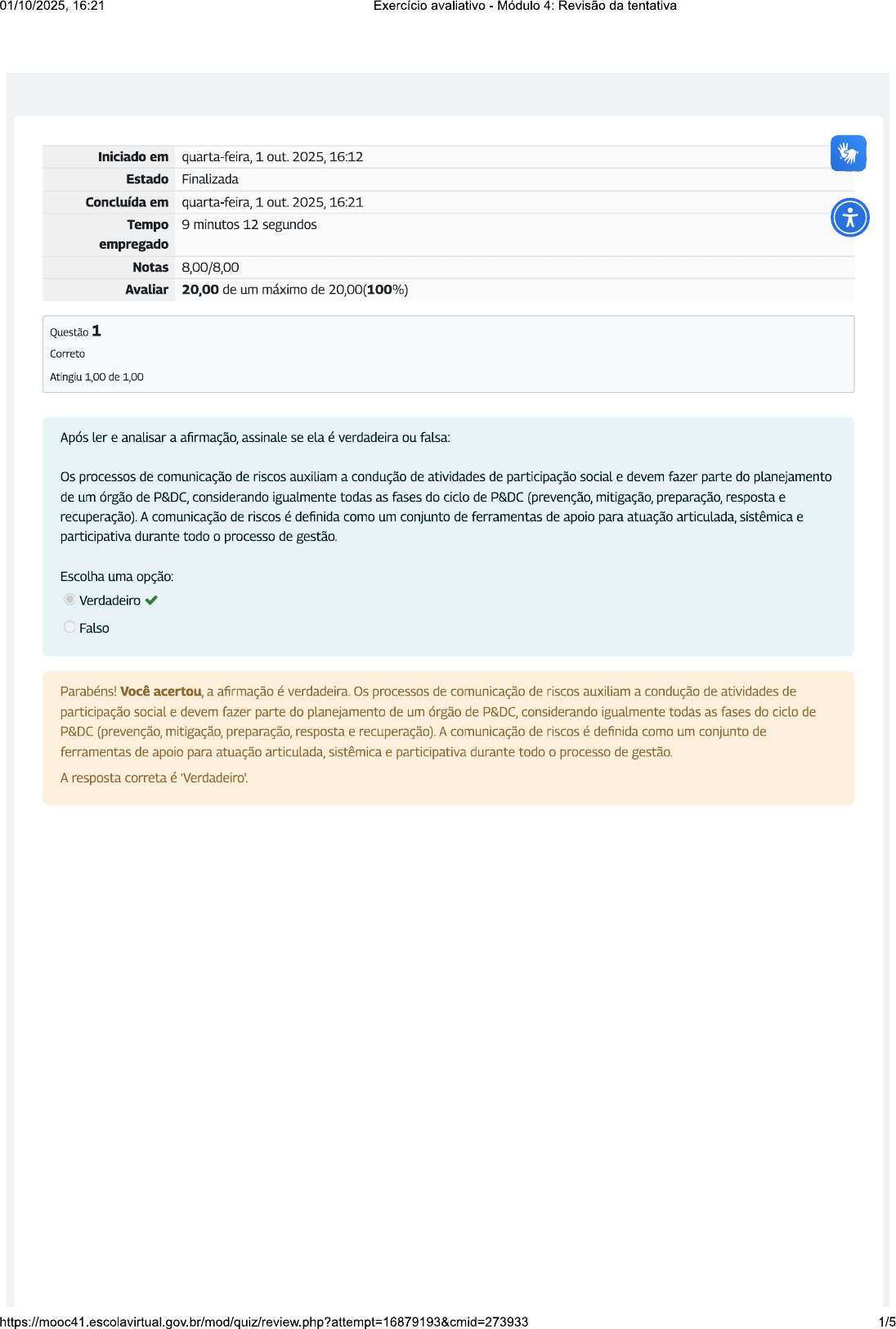 01/10/2025, 16:21 Exercício avaliativo Módulo 4: Revisão da tentativa Iniciado em quarta-feira, 1 out. 2025, 16:12 Estado Finalizada Concluída em quarta-feira, 1 out. 2025, 16:21 Tempo 9 minutos 12 segundos empregado Notas 8,00/8,00 Avaliar 20,00 de um máximo de 20,00(100%) Questão 1 Correto Atingiu 1,00 de 1,00 Após ler e analisar a afirmação, assinale se ela é verdadeira ou falsa: Os processos de comunicação de riscos auxiliam a condução de atividades de participação social e devem fazer parte do planejamento de um órgão de P&DC, considerando igualmente todas as fases do ciclo de P&DC (prevenção, mitigação, preparação, resposta e recuperação). A comunicação de riscos é definida como um conjunto de ferramentas de apoio para atuação articulada, sistêmica e participativa durante todo 0 processo de gestão. Escolha uma opção: Verdadeiro Falso Parabéns! Você acertou, a afirmação é verdadeira. Os processos de comunicação de riscos auxiliam a condução de atividades de participação social e devem fazer parte do planejamento de um órgão de P&DC, considerando igualmente todas as fases do ciclo de P&DC (prevenção, mitigação, preparação, resposta e recuperação). A comunicação de riscos é definida como um conjunto de ferramentas de apoio para atuação articulada, sistêmica e participativa durante todo 0 processo de gestão. A resposta correta é 'Verdadeiro'. 1/501/10/2025, 16:21 Exercício avaliativo Módulo 4: Revisão da tentativa Questão 2 Correto Atingiu 1,00 de 1,00 Podemos considerar que a comunicação de riscos se concretiza por um conjunto de ações que, sequenciais ou simultâneas, vão permitir atingir objetivo proposto. Esse conjunto é, também, gradativo, que significa que conteúdo e a frequência das ações deven ser pensados como um processo, algo como degraus de uma escada: quanto mais completo conjunto de ações, a tendência é que melhor sejam resultados. É importante, ainda, compreender que: Escolha uma opção: a. Uma ação isolada dificilmente gera resultados duradores, por isso, para manter um bom processo de comunicação, é preciso pensar em um conjunto de ações que lhe permitam criar e manter vínculos com seu público-alvo. b. As ações mais complexas de informação podem integrar um processo de comunicação. Parabéns! Você acertou. É importante compreender que uma ação isolada dificilmente gera resultados duradores, por isso, para manter um bom processo de comunicação, é preciso pensar em um conjunto de ações que permitam criar e manter vínculos com seu público-alvo. A resposta correta é: Uma ação isolada dificilmente gera resultados duradores, por isso, para manter um bom processo de comunicação, é preciso pensar em um conjunto de ações que lhe permitam criar e manter vínculos com seu público-alvo. Questão 3 Correto Atingiu 1,00 de 1,00 Para planejar as ações de comunicação é preciso considerar alguns aspectos de demandas, como a mensagem que se deseja trabalhar, público-alvo e momento de realizar a ação. A comunicação propriamente dita pode se dar espontaneamente, de modo que, diante de uma demanda, torna-se necessário comunicar uma mensagem; ou de forma predeterminada, quando a iniciativa da comunicação ocorre por parte do gestor de P&DC. Em ambos casos, a mensagem pode ser, exceto: Escolha uma opção: a. Simples, como número de contato da defesa civil para casos de emergência. b. Intermediária, como a construção, instalação e operação de um pluviômetro. Complexa, como a negociação de realocação de um grupo de pessoas que vive em uma área de risco. d. Alerta, quando as condições são de iminência de ocorrência de eventos extremos. Parabéns! Você acertou. A única alternativa falsa é a referente ao alerta, quando as condições são de iminência de ocorrência de eventos extremos. Porém, tanto as comunicações espontâneas quanto as predeterminadas podem ser simples, como número de contato da defesa civil para casos de emergência; intermediárias, como a construção, instalação e operação de um pluviômetro, por exemplo; ou, ainda, bastante complexas, como a negociação de realocação de um grupo de pessoas que vive em uma área de risco. A resposta correta é: Alerta, quando as condições são de iminência de ocorrência de eventos extremos. 2/501/10/2025, 16:21 Exercício avaliativo Módulo 4: Revisão da tentativa Questão 4 Correto Atingiu 1,00 de 1,00 Em qualquer município existem diversos tipos de públicos, que são os interlocutores no processo de comunicação. Algumas vezes, as ações de Comunicação de Riscos poderão estar destinadas a toda a população, em outras, pode ser necessário definir públicos específicos. Nos nossos estudos, vimos um modelo de Comunicação de Risco estruturado em 4 grandes públicos, de acordo com Victor (2015), sendo eles: moradores e comunidades, organizações externas à sua gestão, órgãos e instituições da administração pública e mídia e veículos de comunicação. Quanto a comunicações às organizações externas à sua gestão, pode-se dizer que: Escolha uma opção: a. ocorrem quando se tem interesse de trabalhar diretamente com a população do município, então público-alvo do processo de comunicação serão moradores e comunidades. b. ocorre quando se tem interesse ou necessidade de trabalhar com empresas, instituições ou demais organizações sociais que, de alguma forma, interfiram no processo da gestão de risco em seu município. Podem ser, por exemplo, empresas de extração mineral ou organizações com projetos sociais. Parabéns! Você acertou. Quanto a comunicações às organizações externas à sua gestão, pode-se dizer que ocorrem quando se tem interesse ou necessidade de trabalhar com empresas, instituições ou demais organizações sociais que, de alguma forma, interfiram no processo da gestão de risco em seu município. Podem ser, po