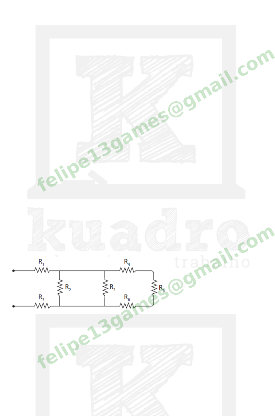 ITA18 - Física LF4D4-1 - Associação de resistores Questão 1 Deseja-se montar um aquecedor elétrico de imersão, que será l igado em uma tomada em que a ddp U é constante. Para isso, dispõe-se de três resistores: um de 30 Ω, um de 20 Ω e outro de 10 Ω. Para o aquecedor ter a máxima potência possível, deve-se usar: a) apenas o resistor de 10 Ω; b) apenas o resistor de 30 Ω; c) os três resistores associados em série; d) os três resistores associados em paralelo; e) apenas os resistores de 10 Ω e 20 Ω, associados em paralelo. f) não sei felipe13games@gmail.c om Questão 2 Com relação à associação de resistores esquematizada na figura, indique a alternativa correta: a) R1 e R4 estão em série. b) R1 e R7 estão em paralelo. c) R2, R3 e R5 estão em paralelo. d) R2 e R3 estão em paralelo. felipe13games@gmail.c om e) R4, R5 e R6 não estão em série. f) não sei Questão 3 Entre os terminais A e B do circuito esquematizado a seguir há uma diferença de potencial constante e igual a U: Indique a alternativa correta: a) Uma parte da corrente total passa por R4. b) Não passa corrente em R1 e em R2, porque não há diferença de potencial entre A e D. c) Não passa corrente em R2 e em R3, porque não há diferença de potencial entre C e E. d) Entre A e C, C e D e D e E, a diferença de potencial é diferente de zero. e) R1, R2 e R3 estão associados em série. f) não sei felipe13games@gmail.c om Questão 4 (Cesgranrio-RJ) felipe13games@gmail.c om Um aprendiz de eletrônica construiu o circuito esquematizado na figura, onde as partes escuras (l inhas, quadrados e pequenos círculos) representam o material condutor depositado sobre uma placa retangular de acetato. Os cinco pares de quadrados numerados indicam pontos entre os quais deverão ser instalados interruptores no circuito. Qual desses interruptores será completamente inúti l , independentemente das l igações a serem feitas nos terminais do circuito (pequenos círculos escuros)? a) 1 b) 2 c) 3 d) 4 e) 5 f) não sei felipe13games@gmail.c om Questão 5 No circuito esquematizado abaixo, calcule a resistência R, sabendo que é nula a corrente indicada no galvanômetro G: a) 1 felipe13games@gmail.c om b) 2 c) 3 d) 4 e) não sei felipe13games@gmail.c om Questão 6 O fundo de escala de um voltímetro de 1 MΩ de resistência interna é igual a 50 V. Qual é a resistência do resistor que deve ser associado a ele, de modo que se torne capaz de medir tensões de até 1 000 V e como deve ser feita a associação? a) 19 Ω, em série com o voltímetro. b) 19 MΩ, em paralelo com o voltímetro. c) 19 MΩ, em série com o voltímetro. d) 19 Ω, em paralelo com o voltímetro. e) não sei felipe13games@gmail.c om Questão 7 (UFC-CE) Os valores das resistências do circuito representado abaixo são: R = 8 Ω, r1 = 2 Ω e r2 = 0,4 Ω. A resistência equivalente, entre os pontos M e N, vale: a) 1 Ω. felipe13games@gmail.c om b) 2 Ω. c) 4 Ω. d) 8 Ω. e) 16 Ω. f) não sei Questão 8 Três pedaços de fio de nicromo (A, B e C), que diferem apenas quanto à área da seção transversal – A é o mais f ino e B é o mais grosso –, são l igados em série e os terminais do conjunto são submetidos a uma tensão U: Qual desses fios dissipa a maior potência? E a menor? a) Todos dissipam a mesma potência b) A e B, respectivamente. c) A e C, respectivamente. d) B e C, respectivamente. e) não sei felipe13games@gmail.c om Questão 9 (Cesgranrio-RJ) felipe13games@gmail.c om O esquema anterior representa o trecho de um circuito elétrico. A seu respeito sabe-se que: R1 = 300 Ω, R2 = 400 Ω, i1 = 0,12 A, e que a ddp entre A e B é nula. Assim, a intensidade da corrente elétrica que percorre R3 vale, em ampères: a) zero b) 0,03 c) 0,04 d) 0,21 e) 0,28 f) não sei felipe13games@gmail.c om Questão 10 No circuito representado na figura, F é um fusível que suporta no máximo 5 A, R é um resistor de resistência igual a 10 Ω e L é um cil indro feito de um material de resistividade igual a 5 · 10–5 Ω m, com 2 mm2 de área de seção transversal, que funciona como um reostato. Determine o menor valor possível de x, para que o fusível não se queime, quando se aplica aos terminais A e B uma tensão de 100 V. a) 0,1 m b) 0,2 m c) 0,3 m d) 0,4 m felipe13games@gmail.c om e) não sei Questão 11 Determine a resistência equivalente entre A e B, sabendo que todos os resistores têm resistência R. a) R b) R/2 c) R/3 d) R/4 e) não sei felipe13games@gmail.c om Questão 12 Nos circuitos esquematizados a seguir, calcule a resistência equivalente entre os pontos A e B: felipe13games@gmail.c om Assinale a alternativa que responde corretamente os itens a) e b) a) a) 10 Ω; b) 100 Ω b) a) 20 Ω; b) 100 Ω c) a) 10 Ω; b) 200 Ω d) a) 100 Ω; b) 10 Ω e) não sei felipe13games@gmail.c om Questão 13 No circuito elétrico representado a seguir, os cinco resistores apresentam a mesma resistência elétrica R. Quando, pelo resistor R5, passar uma corrente elétrica de intensidade igual a 1,0 ampère, qual será o valor da corrente I, em ampères? a) 1 b) 2 felipe13games@gmail.c om c) 3 d) 4 e) não sei Questão 14 (UFPI) No circuito abaixo R1 = 0.5 R2 = 2R3 = 20 ohms e i1 + i2 + i3 = 21 A, em que i1, i2 e i3 são as correntes que passam pelas resistências R1, R2 e R3, respectivamente. A diferença de potencial VAB vale: a) 50 V b) 60 V c) 80 V d) 100 V e) 120 V f) não sei felipe13games@gmail.c om Questão 15 Na ponte esquematizada na figura, AB é um fio homogêneo de seção transversal uniforme. Seu comprimento é de 120 cm e sua resistência elétrica é de 60 Ω: O equil íbrio da ponte é conseguido quando o cursor C encontra-se a 20 cm de A. Calcule a resistência R.felipe13games@gmail.c om a) 1,0 kΩ b) 1,1 kΩ c) 1,2 kΩ d) 2,2 kΩ e) não sei felipe13games@gmail.c om Questão 16 No circuito apresentado a seguir, um dos resistores tem resistência R0. Determine R1 em função de R0, para que a resistência vista pelos termina