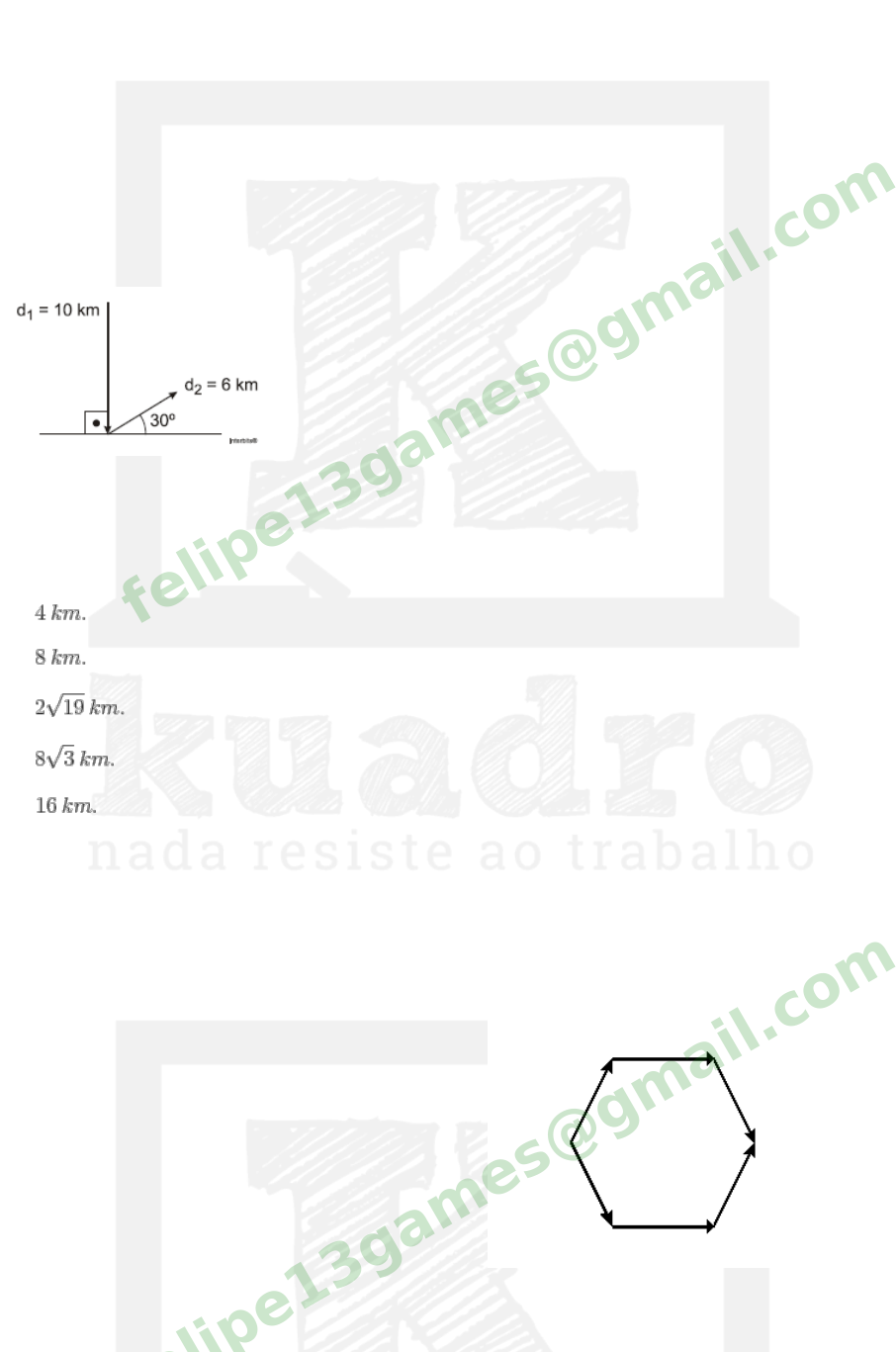 ITA18 - Física LF1B1-1 - Vetores Questão 1 (Unesp 2003) Um caminhoneiro efetuou duas entregas de mercadorias e, para isso, seguiu o itinerário indicado pelos vetores deslocamentos d1 e d2 i lustrados na figura. Para a primeira entrega, ele deslocou-se 10 km e para a segunda entrega, percorreu uma distância de 6 km. Ao final da segunda entrega, a distância a que o caminhoneiro se encontra do ponto de partida é a) b) c) d) e) f) não sei. felipe13games@gmail.c om Questão 2 (Mackenzie 1998) Com seis vetores de módulo iguais a 8 u, construiu-se o hexágono regular a seguir. O módulo do vetor resultante desses 6 vetores é: felipe13games@gmail.c om a) 40 u. b) 32 u. c) 24 u. d) 16 u. e) zero. f) não sei. felipe13games@gmail.c om Questão 3 Na figura, temos três vetores coplanares formando uma linha poligonal fechada. A respeito, vale a relação: a) b) c) d) e) f) Não sei felipe13games@gmail.c om Questão 4 (Mack-SP) O vetor resultante da soma de AB , BE e CA é: felipe13games@gmail.c om a) AE b) AD c) CD d) CE e) BC f) Não sei felipe13games@gmail.c om Questão 5 No plano quadriculado abaixo, estão representados dois vetores x e y . O módulo do vetor diferença x – y vale: a) 1 u b) 2 u c) 3 u d) 4 u e) 5 u f) Não sei felipe13games@gmail.c om Questão 6 felipe13games@gmail.c om Na figura, estão representadas três forças que agem em um ponto material. Levando em conta a escala indicada, determine a intensidade da resultante dessas três forças. a) 5 N b) 10 N c) 15 N d) 20 N e) 25 N f) Não sei felipe13games@gmail.c om Questão 7 A respeito das grandezas físicas escalares e vetoriais, analise as proposições a seguir: (01) As escalares ficam perfeitamente definidas, mediante um valor numérico acompanhado da respectiva unidade de medida. (02) As vetoriais, além de exigirem na sua definição um valor numérico, denominado módulo ou intensidade, acompanhado da respectiva unidade de medida, requerem, ainda, uma direção e um sentido. (04) Comprimento, área, volume, tempo e massa são grandezas escalares. (08) Deslocamento, velocidade, aceleração e força são grandezas vetoriais. A soma das respostas corretas é a) 01 b) 03 c) 06 felipe13games@gmail.c om d) 14 e) 15 f) Não sei Questão 8 (PUC-SP – mod.) Numa competição de arco-e-flecha, o que faz a flecha atingir altas velocidades é a ação da força resultante R , obtida por meio da soma vetorial entre as forças F1 e F2 exercidas pelo fio impulsor. A figura que melhor representa a resultante R é: a) b) c) d) e) f) Não sei felipe13games@gmail.c om Questão 9 felipe13games@gmail.c om Considere duas forças F1 e F2 de intensidades respectivamente iguais a 18 N e 12 N, aplicadas em uma partícula P. A resultante R = F1 + F2 não poderá ter intensidade igual a: a) 30 N b) 3,0 N c) 18 N d) 6,0 N e) 12 N f) Não sei felipe13games@gmail.c om Questão 10 Seis vetores fecham um hexágono regular, dando resultante nula. Se trocarmos o sentido de três deles, alternadamente, a resultante terá módulo: a) igual ao de um vetor componente; b) 2 vezes o módulo de um vetor componente; c) vezes o módulo de um vetor componente; d) vezes o módulo de um vetor componente; e) nulo f) Não sei felipe13games@gmail.c om Questão 11 (Upe-ssa 1 2016) Um robô no formato de pequeno veículo autônomo foi montado durante as aulas de robótica, em uma escola. O objetivo do robô é conseguir completar a trajetória de um hexágono regular ABCDEF, saindo do vértice A e atingindo o vértice F, passando por todos os vértices sem usar a marcha ré. Para que a equipe de estudantes seja aprovada, eles devem responder duas perguntas do seu professor de física, e o robô deve uti l izar as direções de movimento mostradas na figura a seguir: felipe13games@gmail.c om Suponha que você é um participante dessa equipe. As perguntas do professor foram as seguintes: I. É possível fazer a trajetória completa sempre seguindo as direções indicadas? II. Qual segmento identifica o deslocamento resultante desse robô? a) I – Não; II - AF b) I – Não; II - CB c) I – Não; II - Nulo d) I – Sim; II - FC e) I – Sim; II - AF f) Não sei felipe13games@gmail.c om Questão 12 Qual o cosseno do ângulo formado pelos vetores A= 4i + 3j e B= -1i +1j , em que i e j são vetores unitários? felipe13games@gmail.c om a) b) c) d) e) 0 f) Não sei felipe13games@gmail.c om Questão 13 (G1 - cftce 2007) Dados os vetores "a", "b", "c", "d" e "e" a seguir representados, obtenha o módulo do vetor soma: R = a + b + c + d + e a) zero b) c) 1 d) 2 e) f) Não sei felipe13games@gmail.c om Questão 14 felipe13games@gmail.c om (Ufpb 2007) Considere os vetores A, B e F, nos diagramas numerados de I a IV. Os diagramas que, corretamente, representam a relação vetorial F = A - B são apenas: a) I e III b) II e IV c) II e III d) III e IV e) I e IV f) Não sei felipe13games@gmail.c om ITA18 - Física LF1B1-1 - Vetores